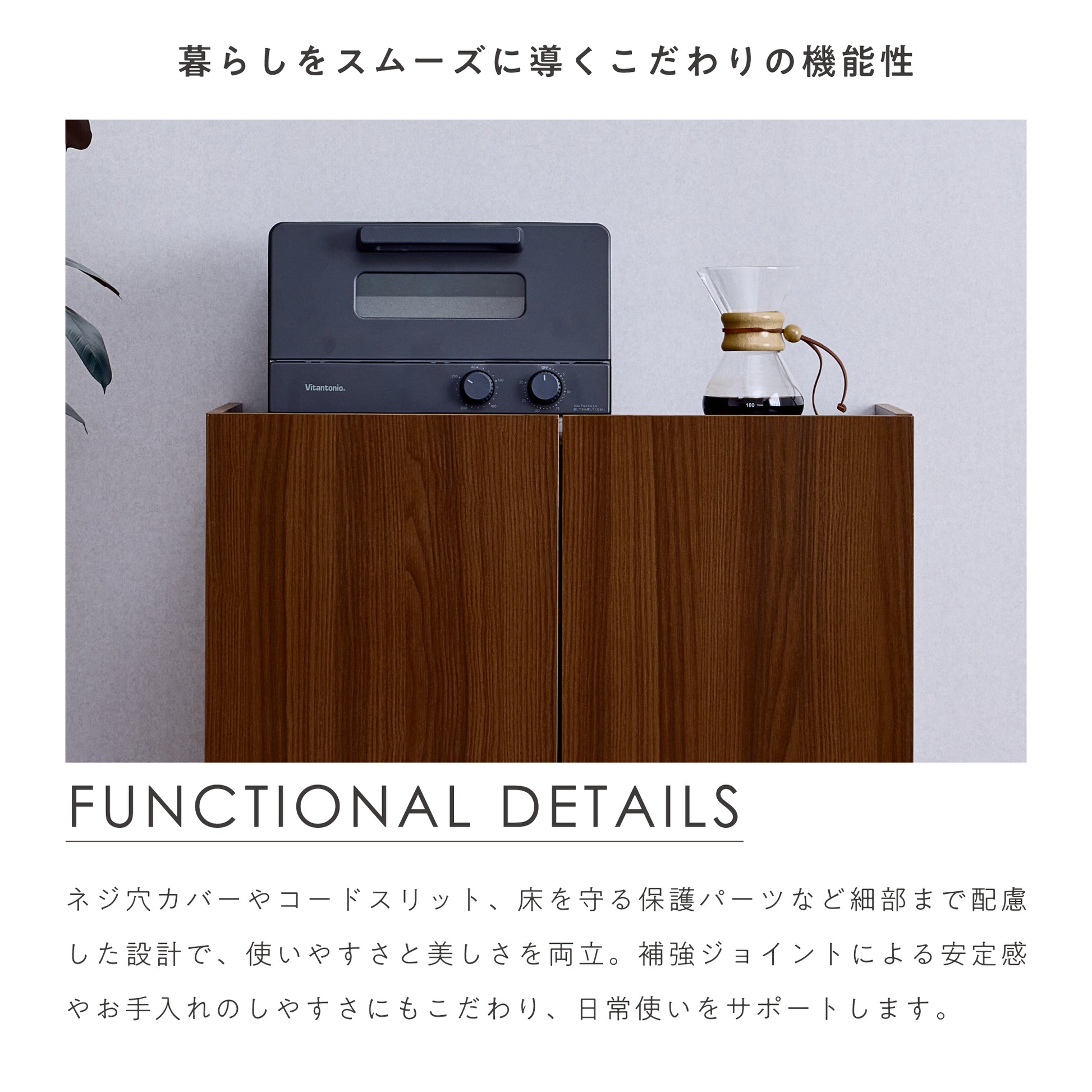 生活感の出やすい日用品や書類などをすっきりと収めることで、お部屋を常に整った印象に保てます。扉を閉めるだけで雑多な印象を抑えられ、来客時も安心。収納部は耐荷重約10kgと頑丈な設計で、書籍や食器などの重さのある物も安定して収納可能。開閉もスムーズで、日常使いのしやすさにも配慮しました。