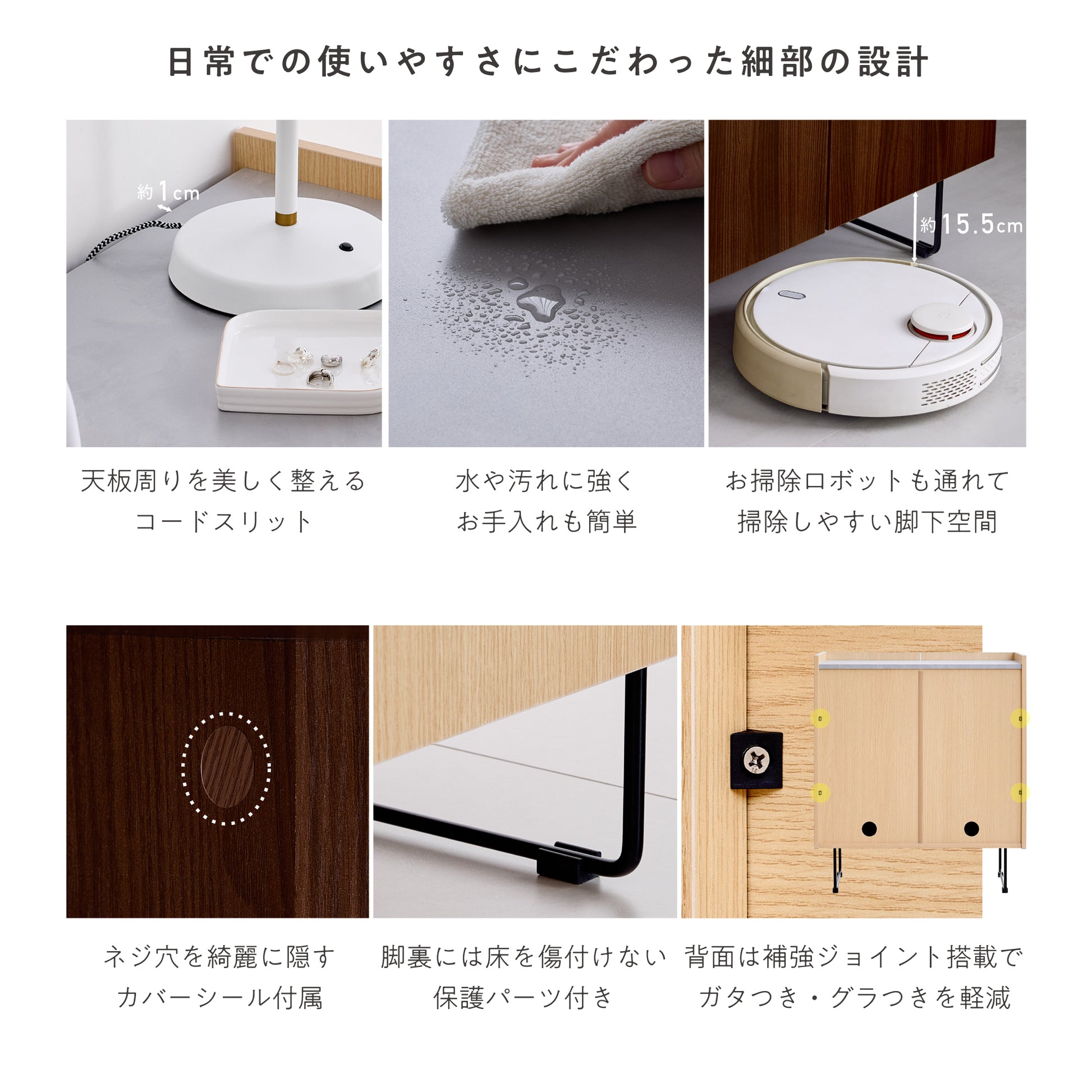 ネジ穴を隠すカバーシールで美しい仕上がりをキープし、脚裏には床を傷つけない保護パーツを装備。天板周りにはコードスリットを設け、配線もすっきり整理できます。さらに横揺れを抑える補強ジョイントで安定感を高めています。水や汚れに強い素材でお手入れも簡単。脚下はロボット掃除機が通れるゆとりある空間を確保し、日常の使用も快適です。
