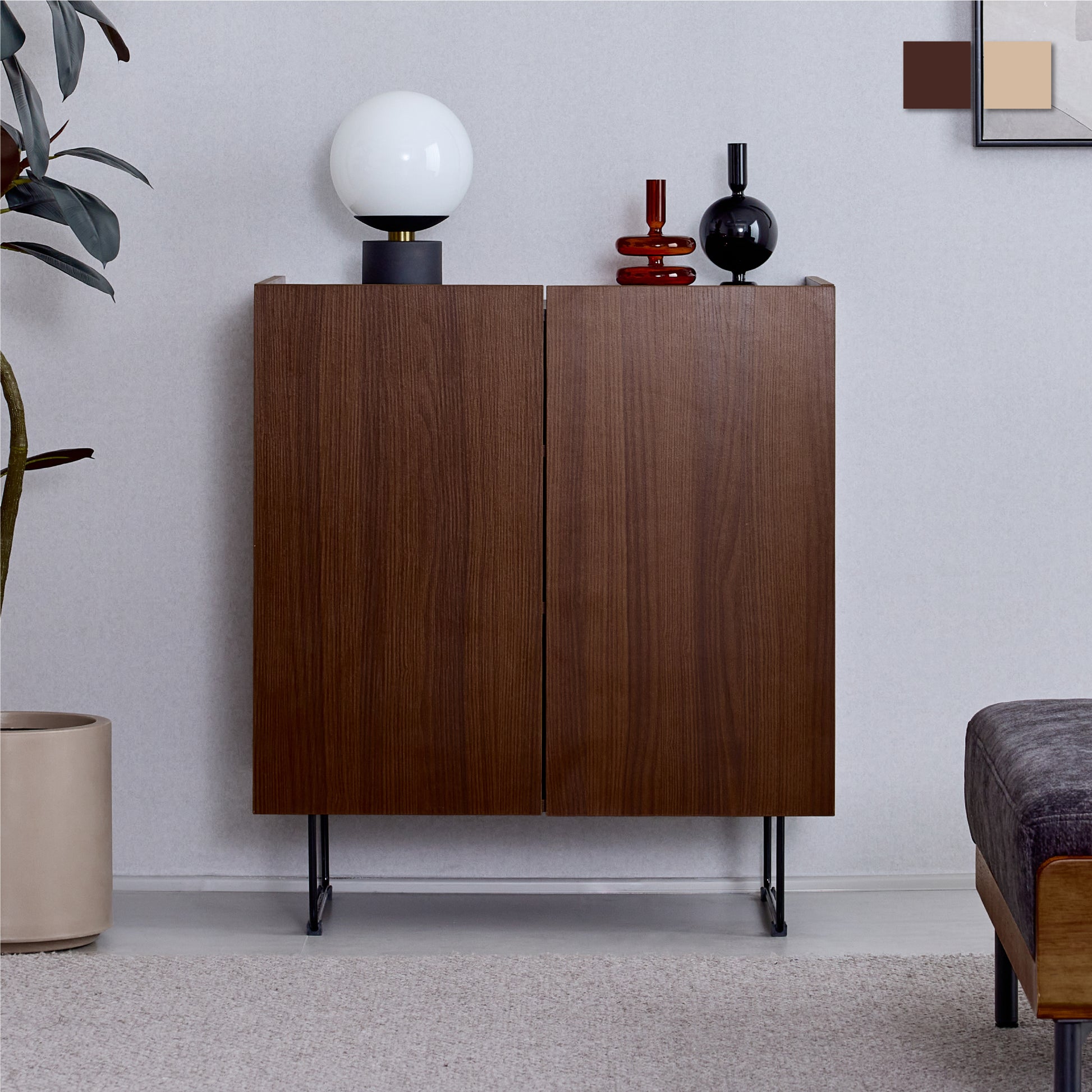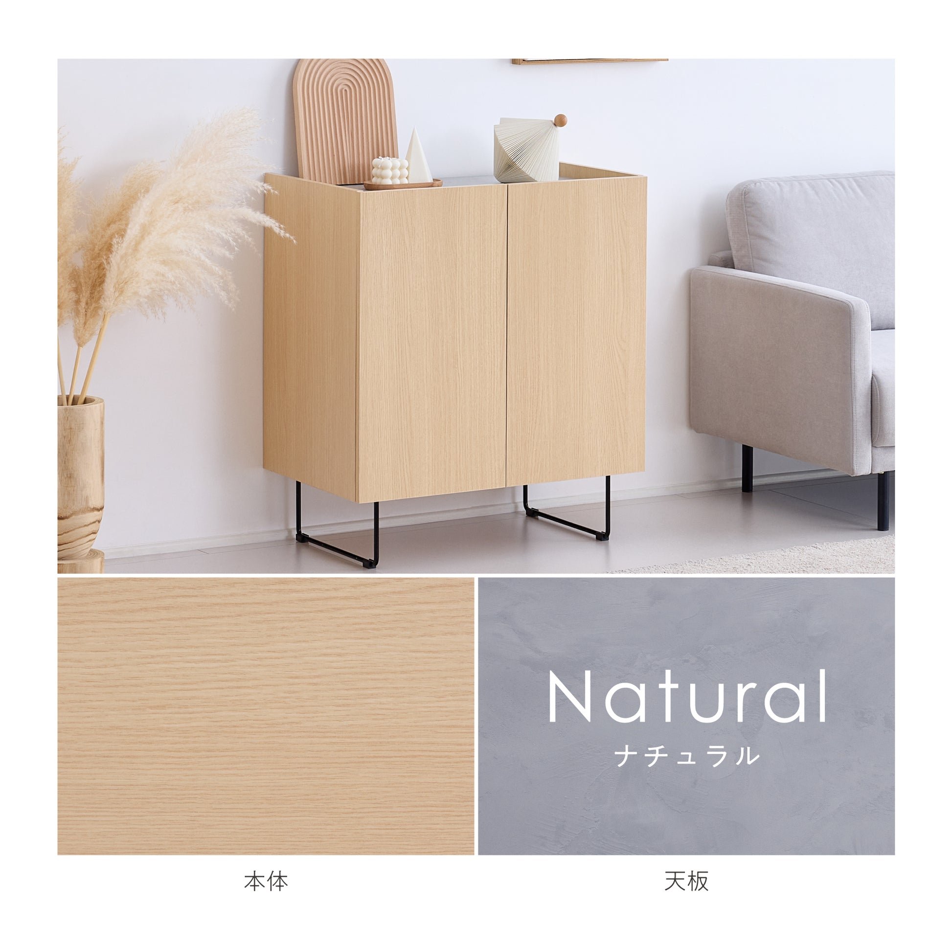 生活感の出やすい日用品や書類は扉の中へ、お気に入りの雑貨や観葉植物は天板の上へ。収納力とディスプレイの楽しさを一台に集約しました。高い耐荷重の天板と安定感のある棚板が、日常をしっかりと支えます。お部屋をすっきりと整えながら、自分らしい空間づくりを叶えるキャビネットです。