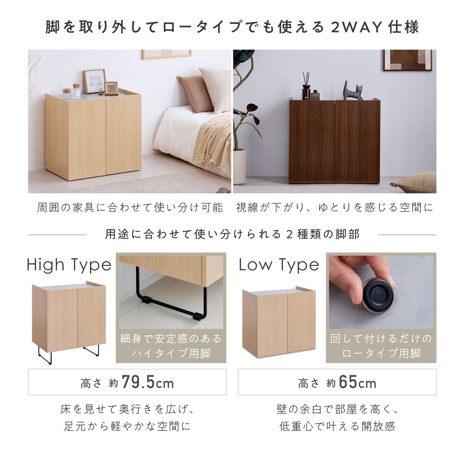 ライフスタイルや設置場所に合わせて、脚部を付け替えられる2WAY仕様。脚の取り外しで、高さ約79.5cmのハイタイプと約65cmのロータイプに調整でき、用途に応じた高さで使えます。脚の着脱も簡単で、気軽に変更可能です。ハイタイプはリビングや書斎に、ロータイプはベッドサイドや和室に。模様替えや住環境の変化にも柔軟に取り入れやすく、長く使いやすい設計です。