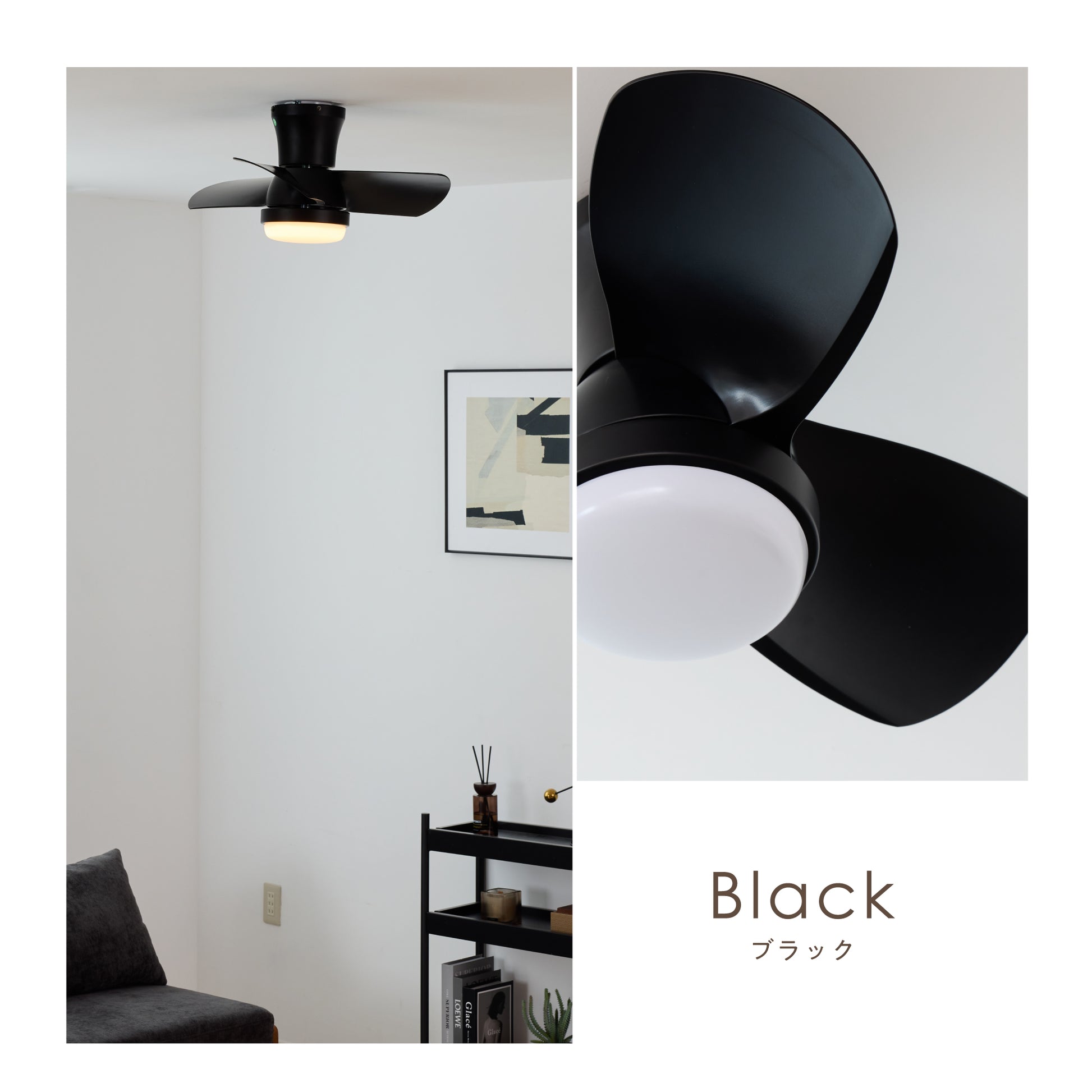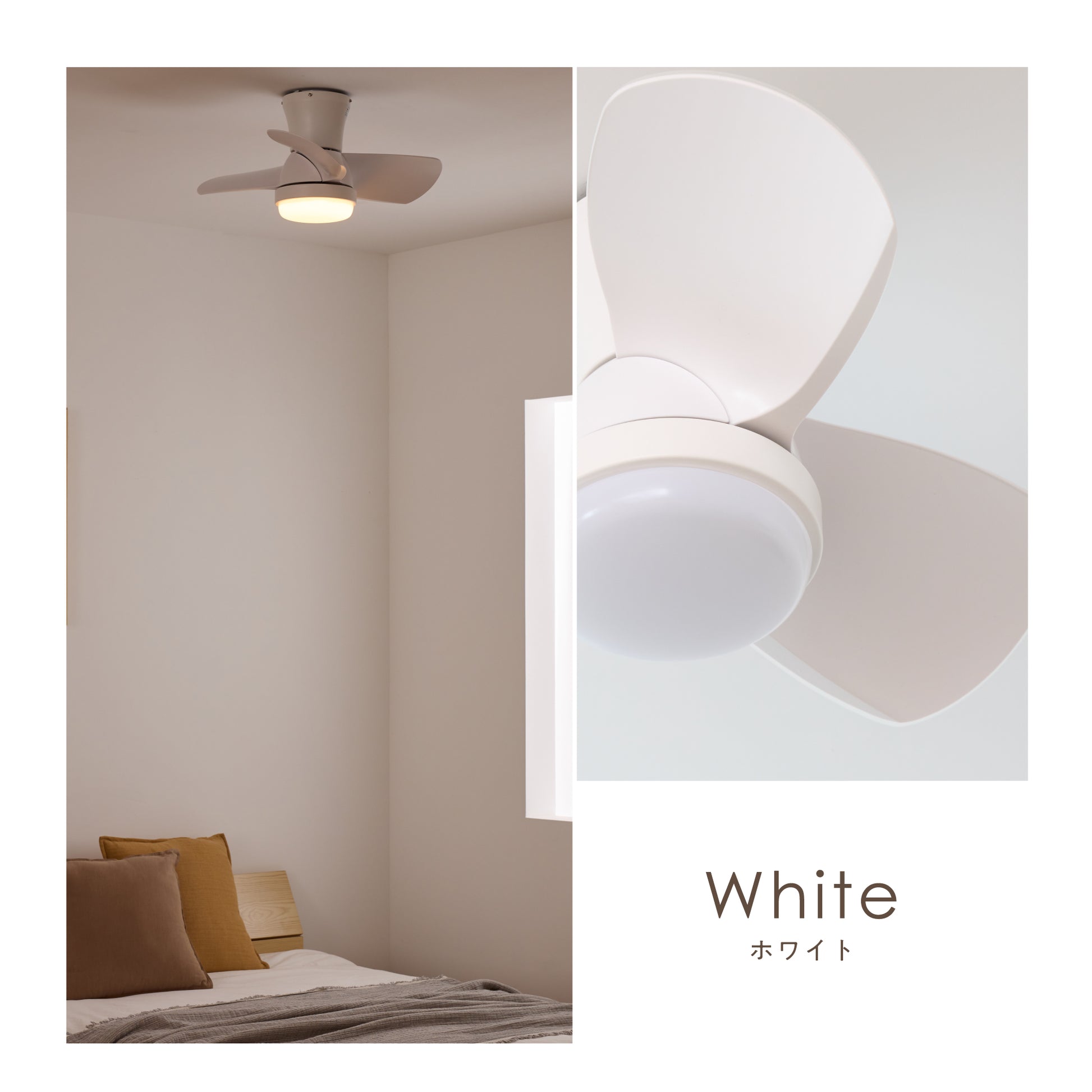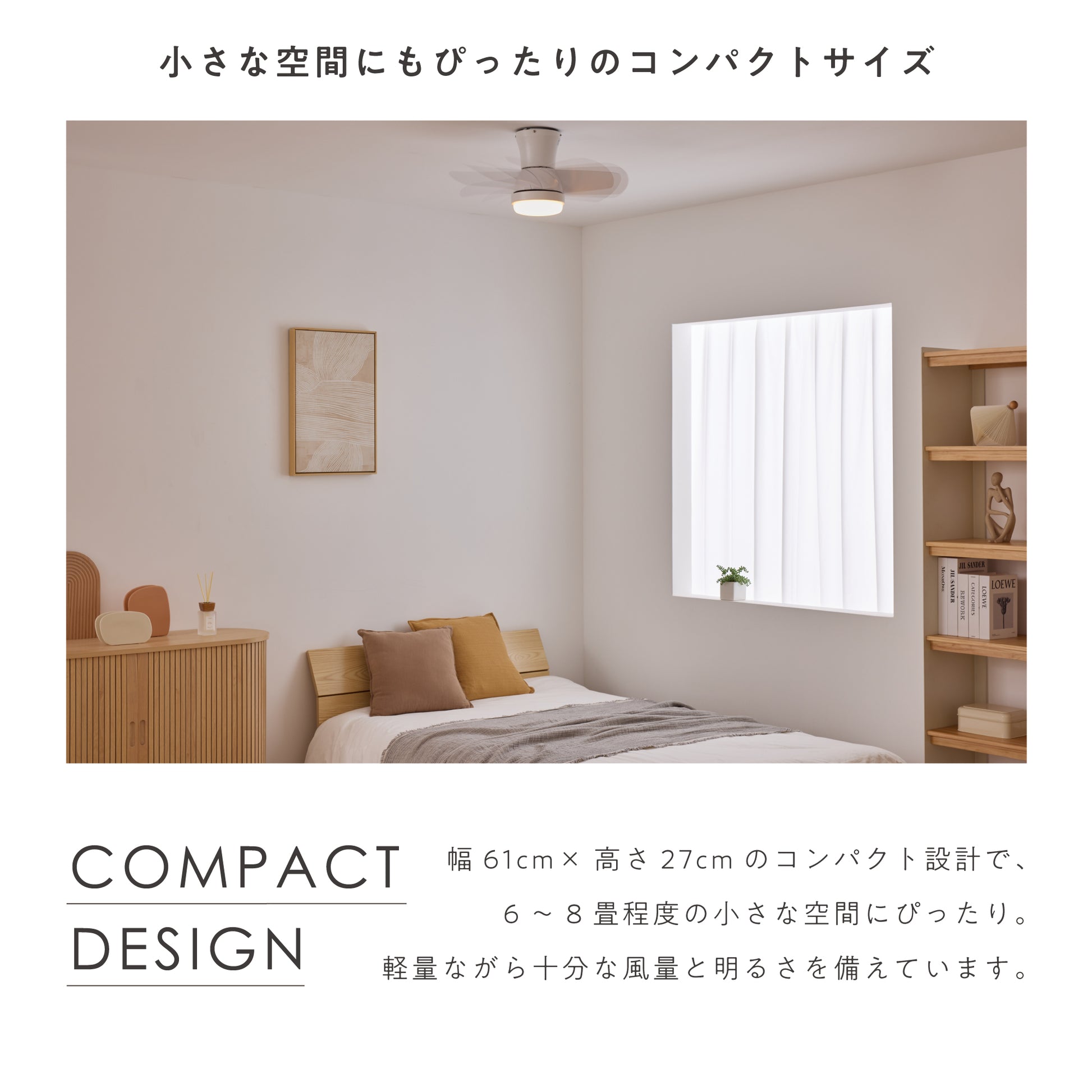 幅61cm×高さ27cmのコンパクト設計で、限られた空間にもすっきり設置可能。一般的なシーリングファンライトより小型ながら、十分な風量と照明性能を確保しています。6〜8畳程度の寝室や書斎、子供部屋、ワンルームにも適し、重量約3.2kgの軽量設計で天井への負担にも配慮。小空間にちょうどいいサイズ感と機能性を備えたシーリングファンライトです。