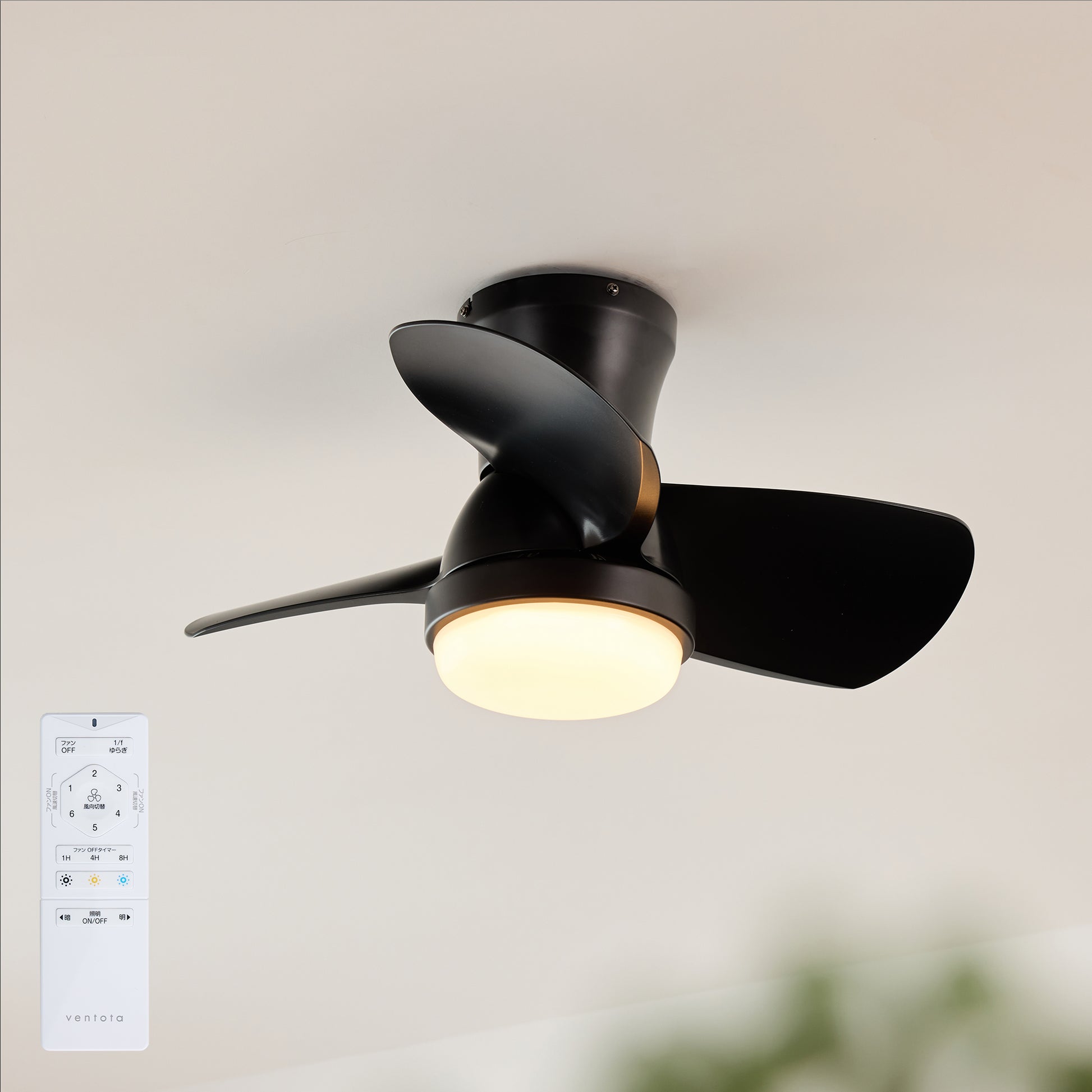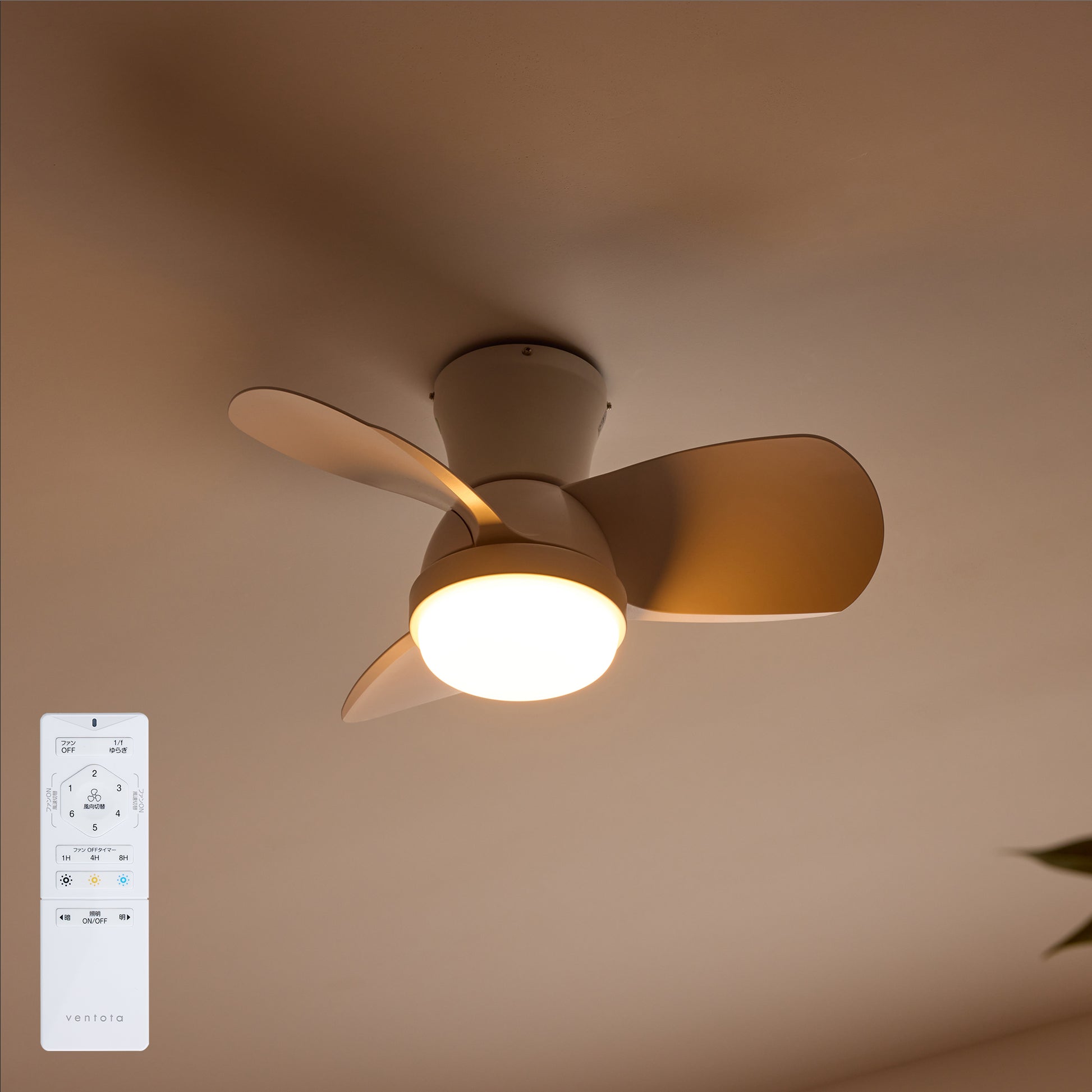 照明のオンオフや調光・調色、ファンの風速調整や回転方向切替、1/fゆらぎ機能まで操作できる多機能リモコンを付属。リモコンひとつでお部屋の環境をまとめてコントロールできます。就寝時や外出時に便利なオフタイマー機能を搭載し、壁面ホルダー付きで使いやすさにも配慮しています。