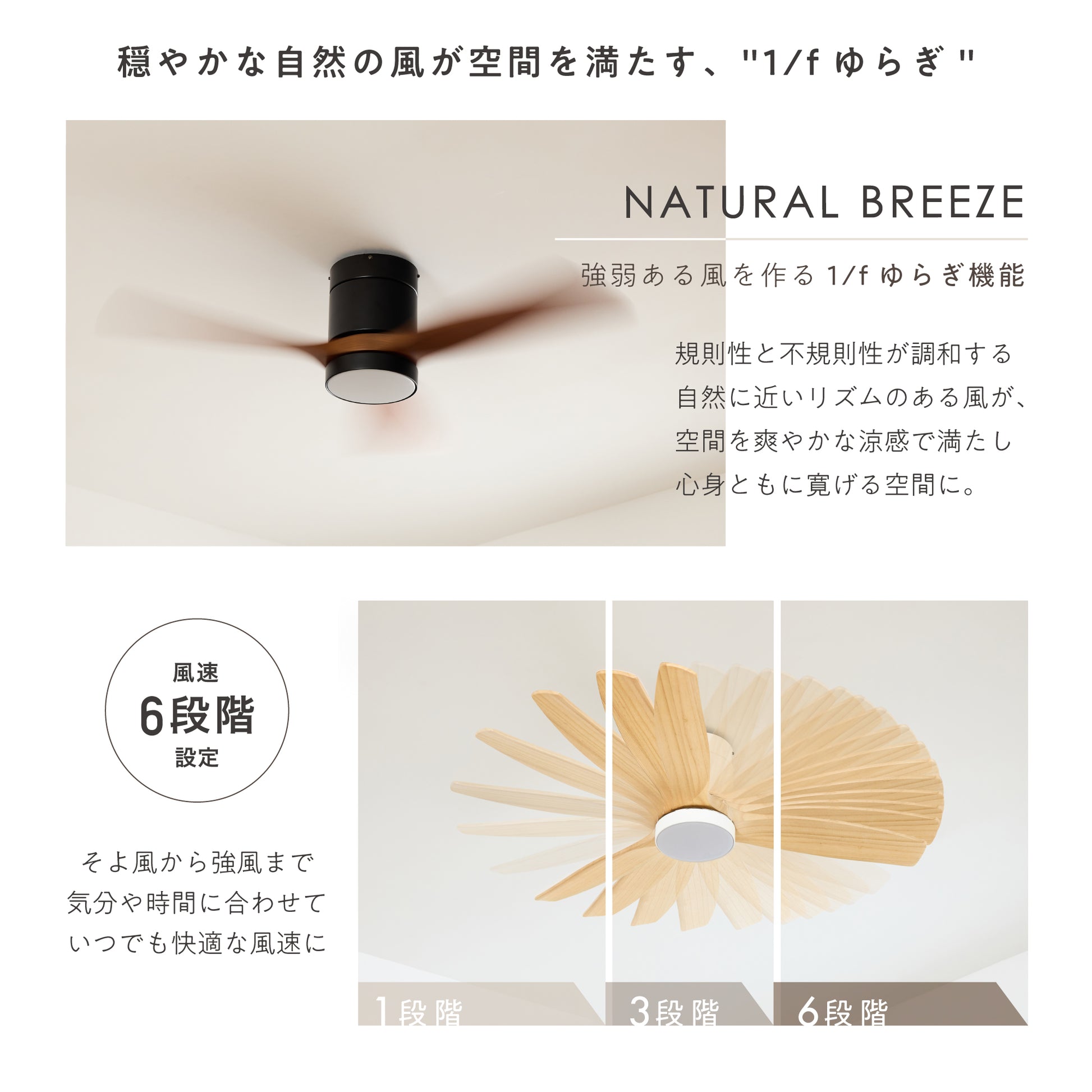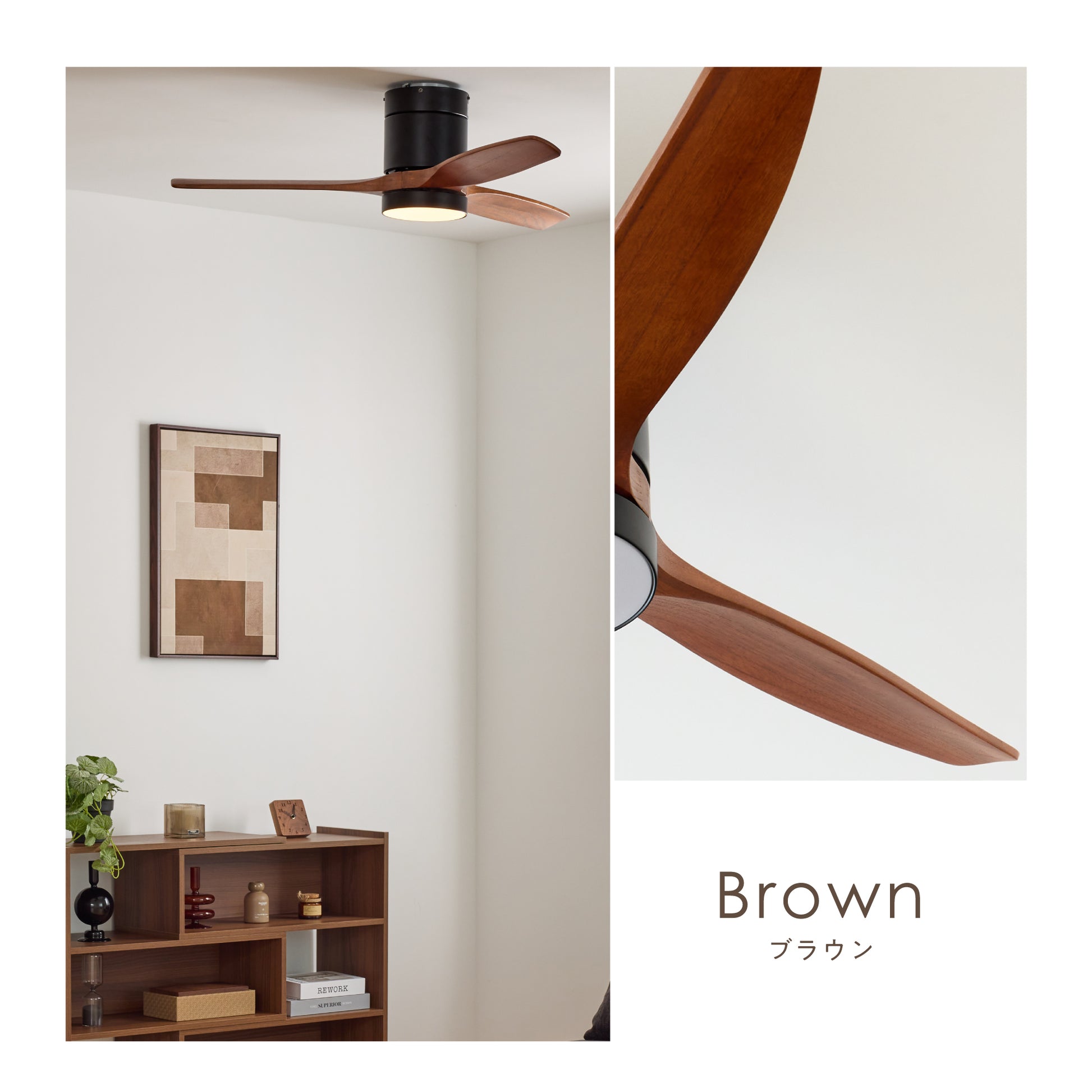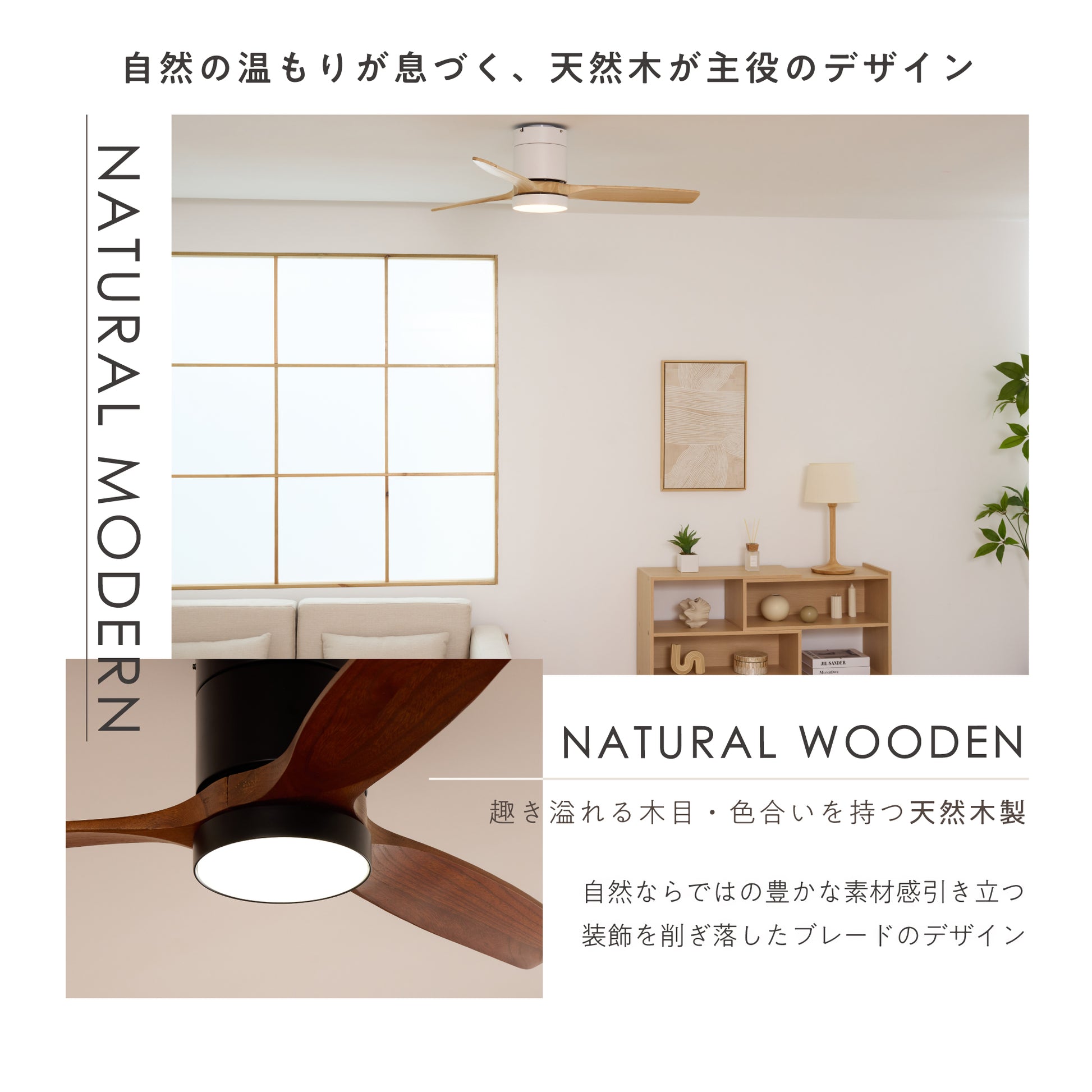 羽根には本物の天然木を使用。木目の表情や柔らかな質感が、空間に穏やかな温もりを添えます。ナチュラルは軽やかに、ブラウンは落ち着きある印象に。時とともに深まる色合いも楽しめる、素材の魅力を活かしたシーリングファンライトです。日々の暮らしに自然な上質感をもたらします。