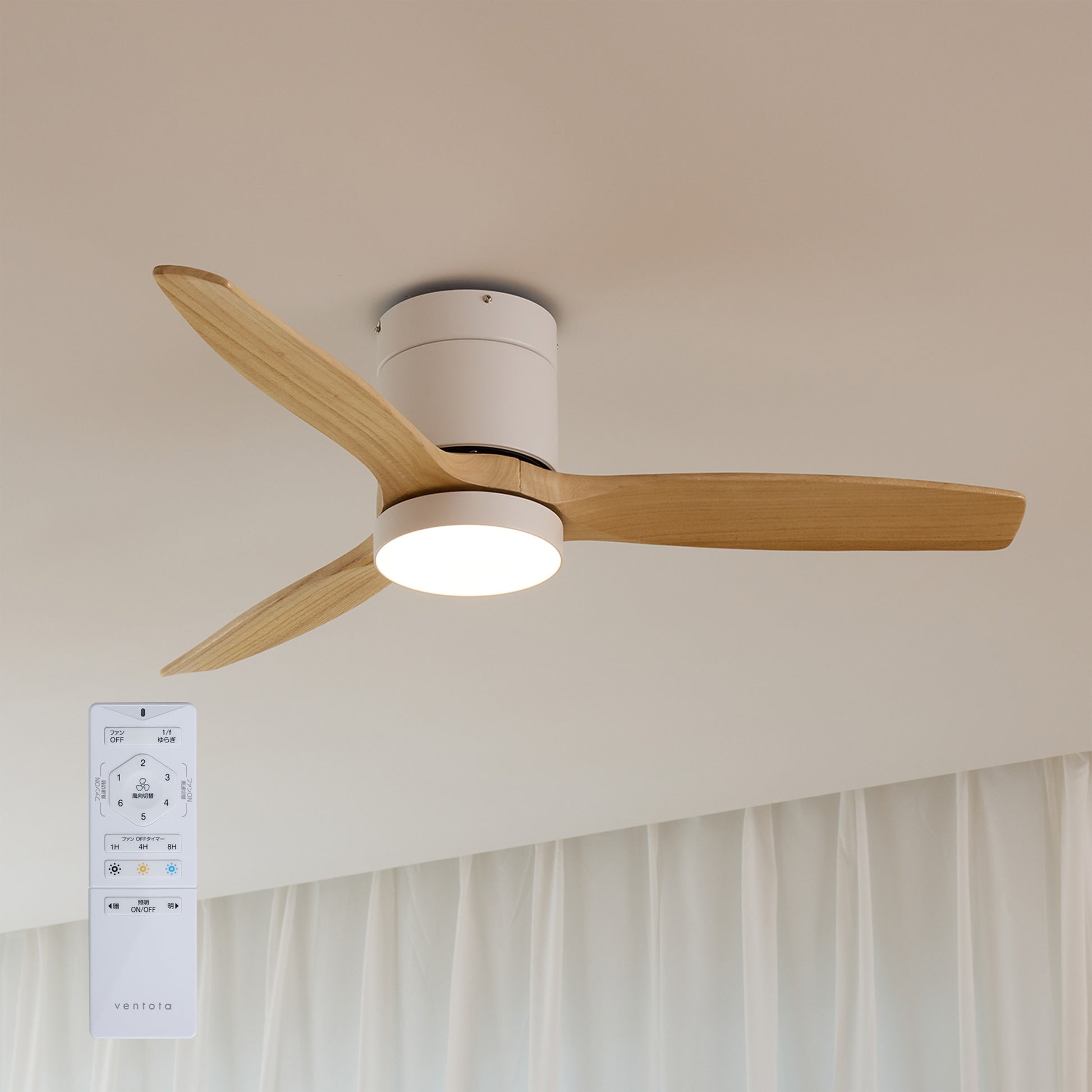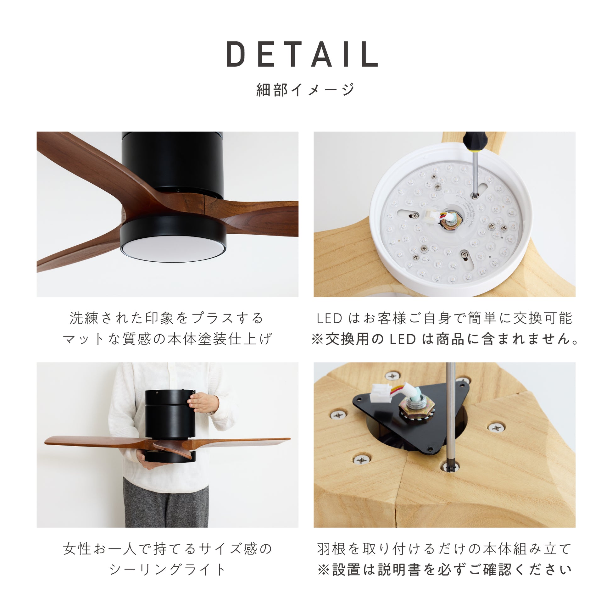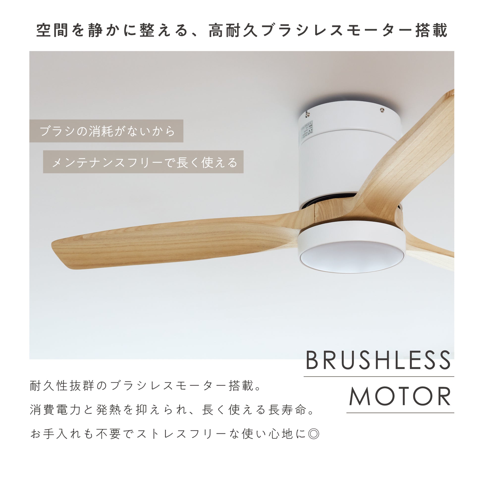 羽根には本物の天然木を使用。木目の表情や柔らかな質感が、空間に穏やかな温もりを添えます。ナチュラルは軽やかに、ブラウンは落ち着きある印象に。時とともに深まる色合いも楽しめる、素材の魅力を活かしたシーリングファンライトです。日々の暮らしに自然な上質感をもたらします。