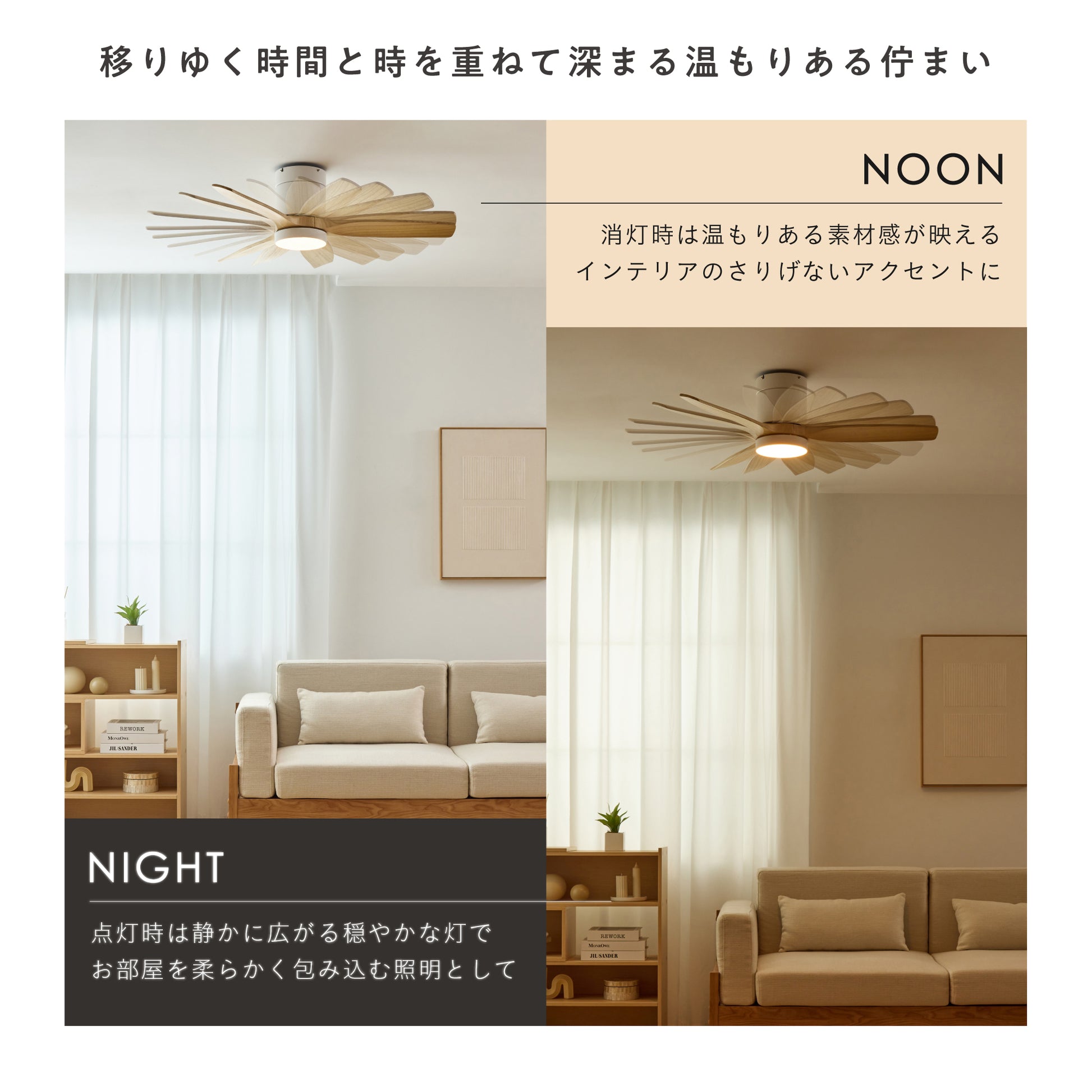 点灯時は柔らかな光が天然木の羽根を照らし、木目の陰影が空間に奥行きをもたらします。消灯時も、木の質感とメタルの洗練が静かな存在感を放ち、インテリアの一部として美しく佇みます。昼と夜、そして暮らしとともに深まる風合い。時の移ろいを映しながら、空間に寄り添い続けます。