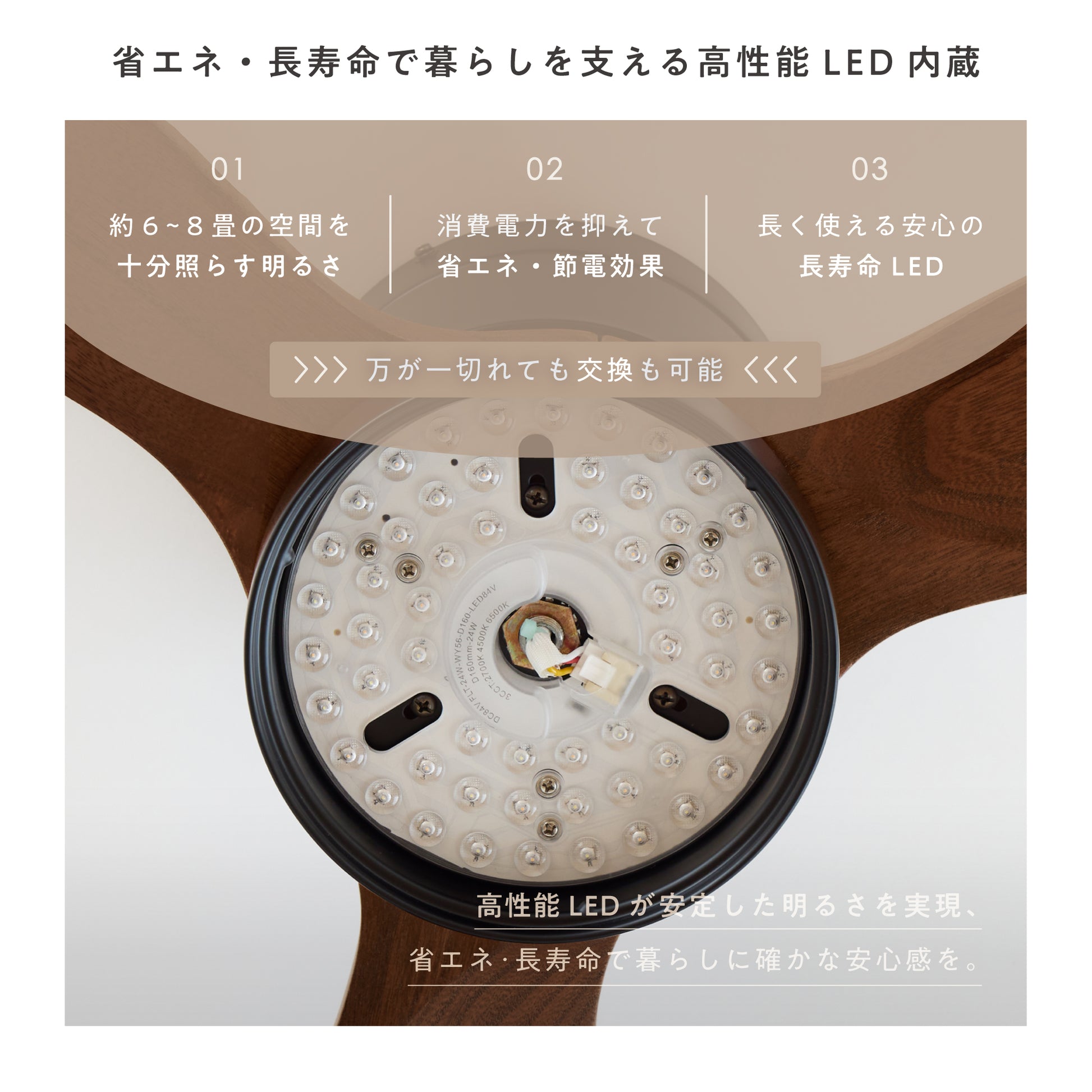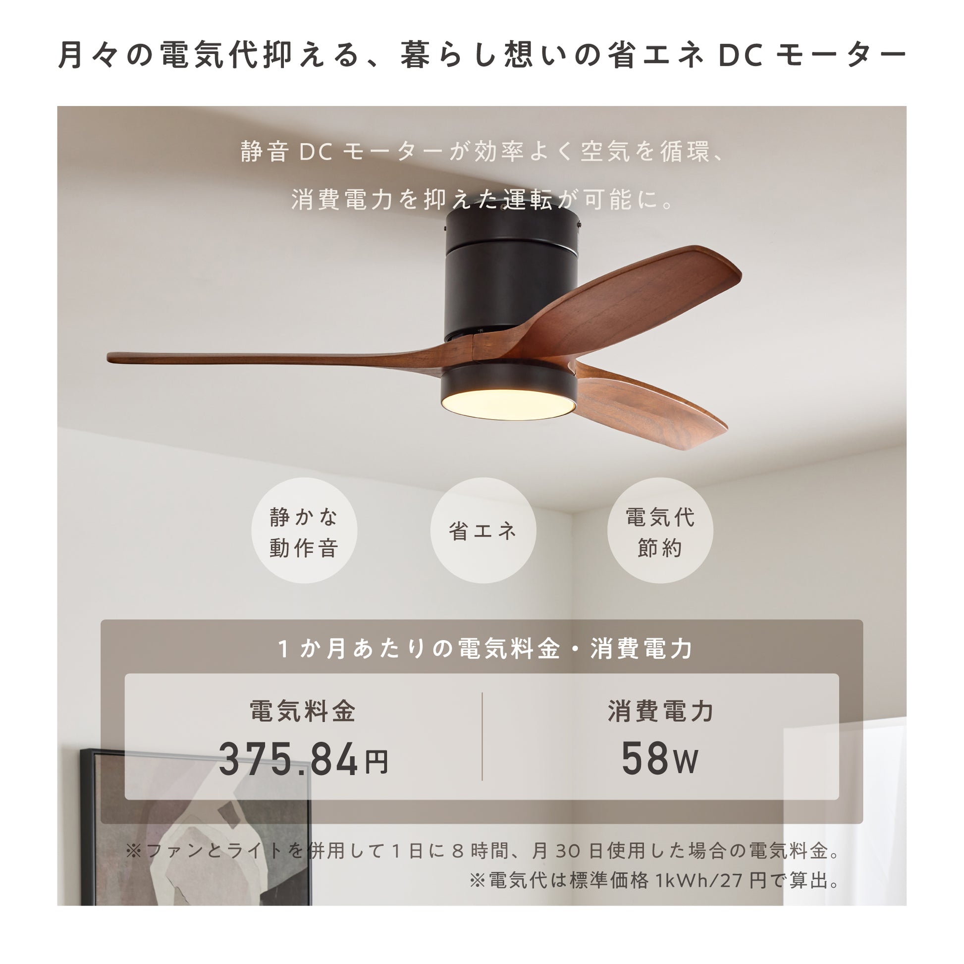 静音性に優れたDCモーターを採用。耳に触れにくい穏やかな回転で、在宅ワークや就寝時も心地よく使えます。夏は空気をなめらかに循環させ冷房効率を高め、冬は天井付近の暖気を優しく広げます。サーキュレーション効果で冷暖房の無駄を抑えながら、静けさと快適さが共存する空間へ整えます。