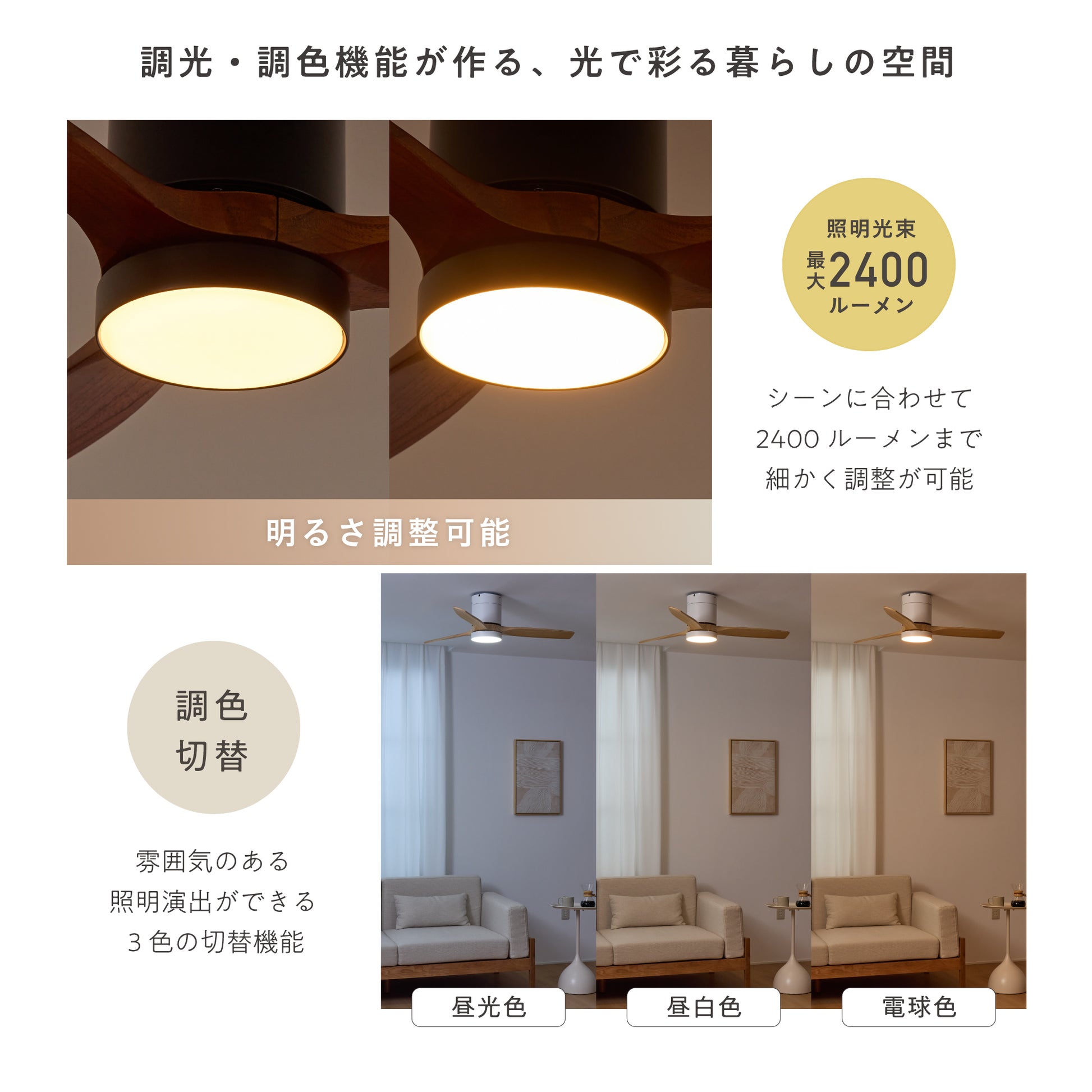 一度設定した明るさや光色、風量はそのまま記憶。壁スイッチで電源を切っても、再び点灯すればいつもの状態に戻ります。毎回細かく調整する手間がなく、帰宅時や就寝前もスムーズ。日々の暮らしに、さりげない快適さを添えます。