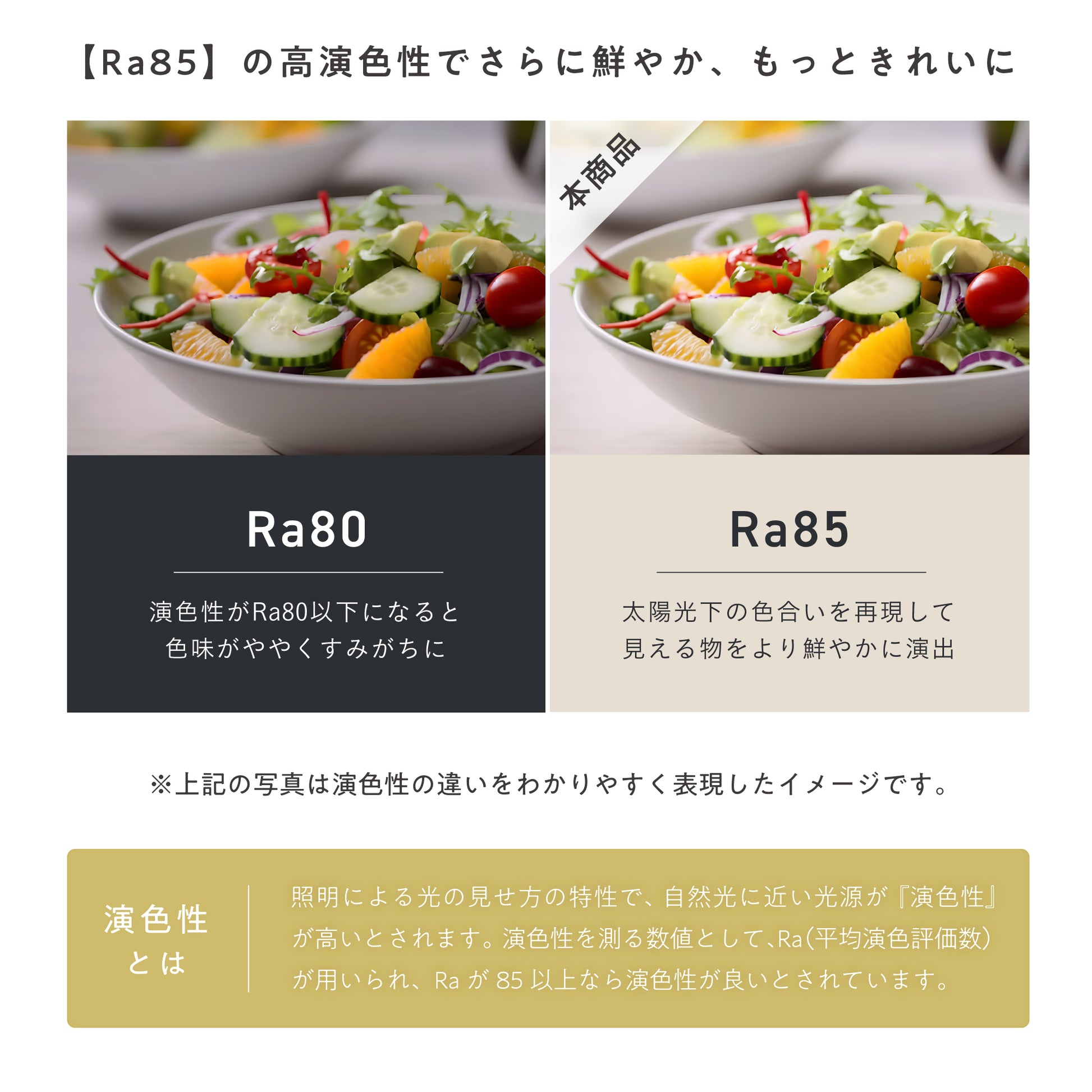 Ra85の高演色LEDを採用。自然光に近い発色で、家具や天然木の風合い、ファブリックの色味まで美しく映し出します。空間全体に奥行きが生まれ、日常の景色がより豊かに感じられるライティングへ導きます。