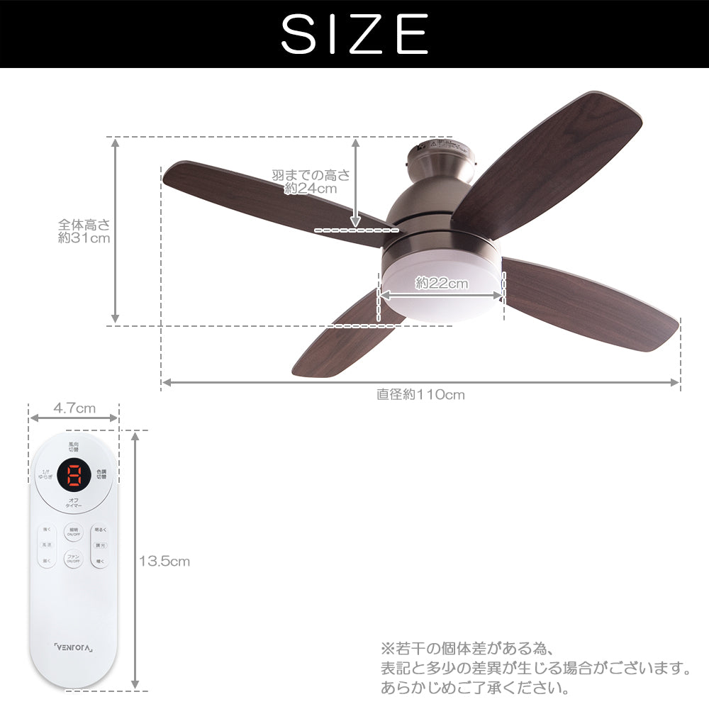 - 製造工法の精度上、シーリングファンの回転時にはモーターの外側の装飾部分に±3mm程度のブレが発生する可能性があります。この部分のブレによる安全上の問題がありません。