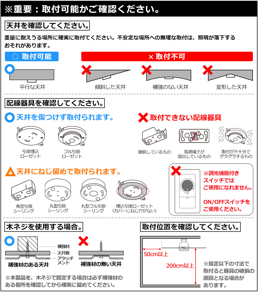 - 取扱説明書は安全に、正確にご使用いただくためのものです。必ず説明書をお読みください。特に【天井・取付位置の確認】の部分は必ずよくお読みし、理解してから取付を始めてください。