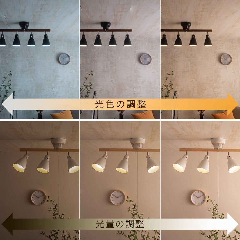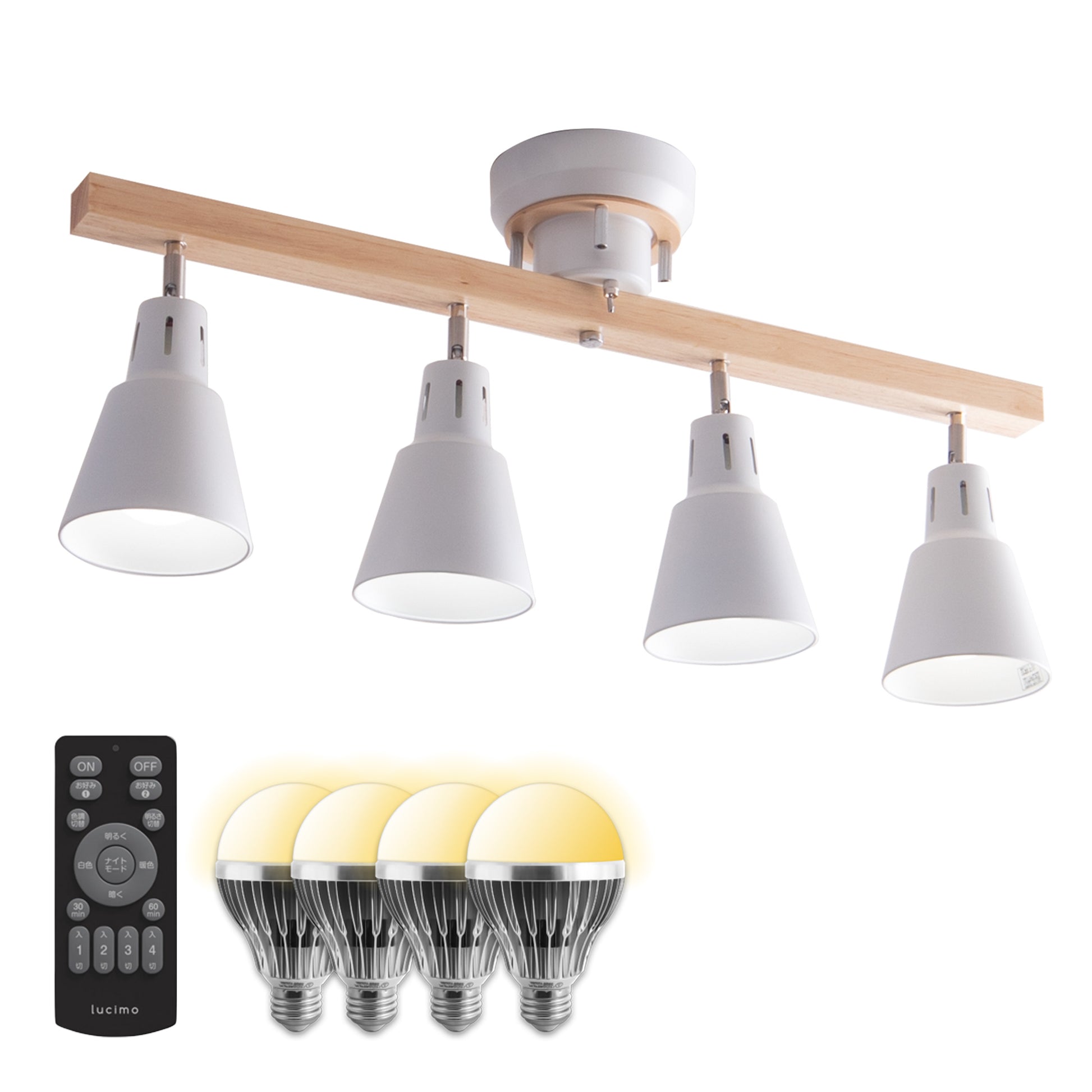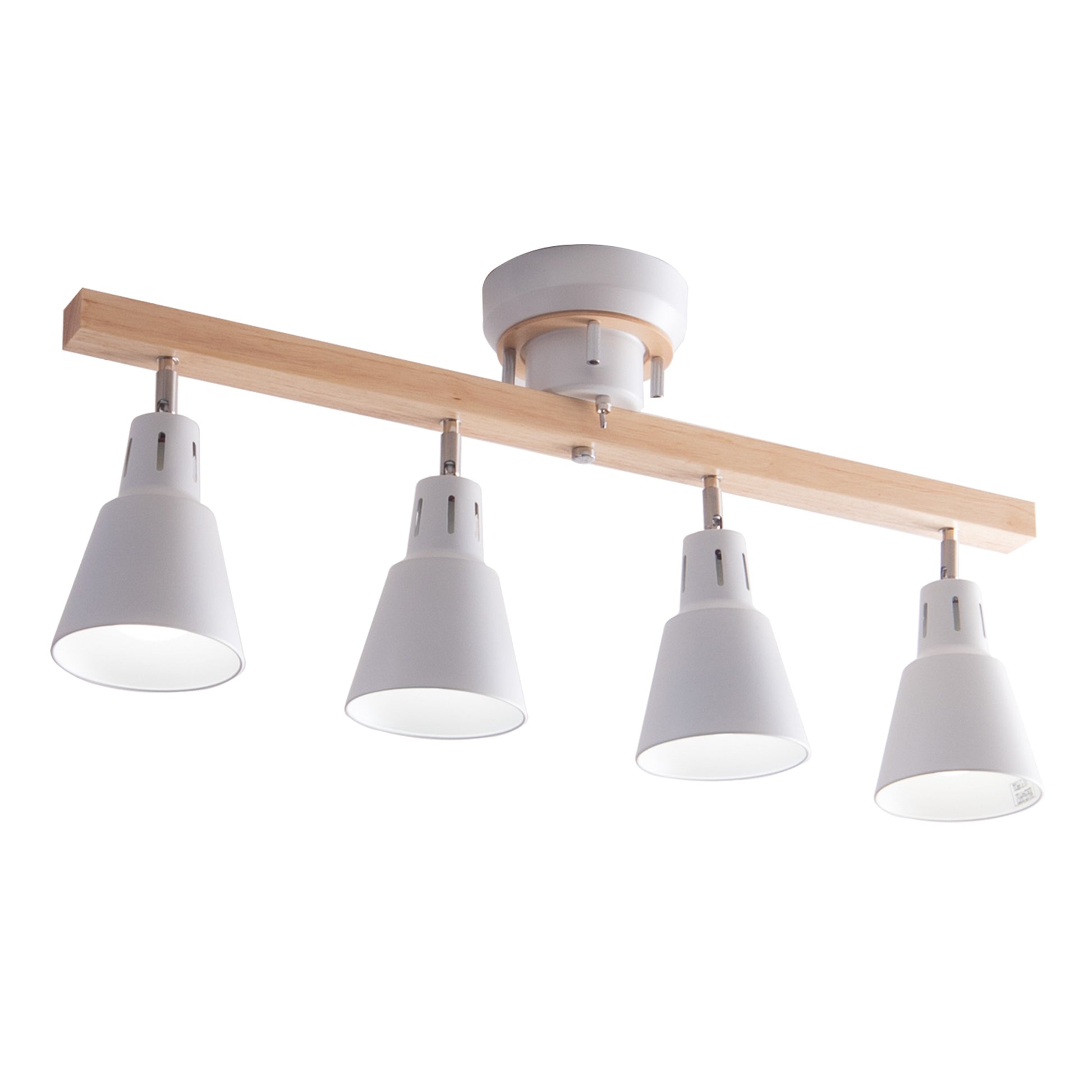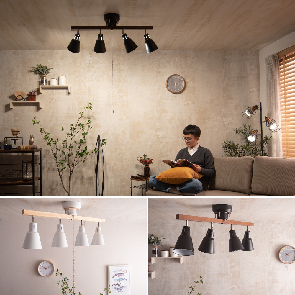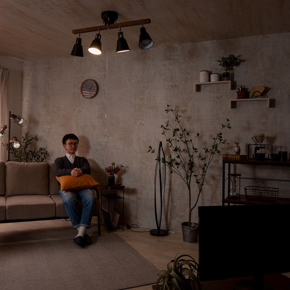 1つの照明で4つの空間が作れる、高機能シーリングスポットライト。シェードランプは、手動でくるくると360度回転できます。首部分も床に対して垂直から約90度まで傾けられるので、ほぼ希望通りの角度に合わせることができます。 リモコン式LED電球を装着すれば、食卓は食事が美味しく見える電球色で、リビングテーブルやソファは落ち着く明るい昼白色で照らすなど、一つのライトで部屋中に複数の光の空間を作り出すことが可能になります。『ホワイト』は自然の木目を生かし、上品でマットなホワイトのシェードをバランスよく配置することで、ナチュラルな雰囲気のモノト ーンインテリアが叶います。『ブラック』は、シェードから漏れる柔らかい光とステンレス製の金属部品の組み合わせがアクセントに。スタイリッシュで洗練された印象を与えてくれます。点灯の際にはフレームとシェードの影が美しく天井に照らし出され、お部屋の雰囲気を一層オシャレに変えるシーリングスポットライトです。全灯のON/OFFはもちろん、明るさの切り替えから光色の調整までリモコン下部にある単体ボタンで4つの電球をそれぞれ別々に細かく操作できます。角度調整も可能です。