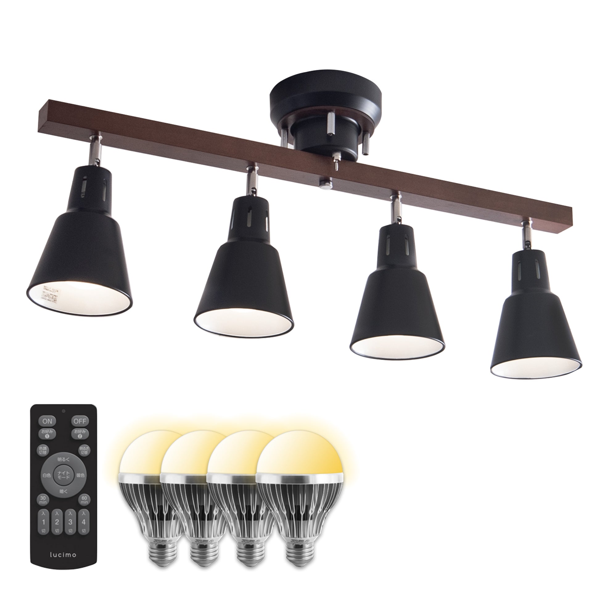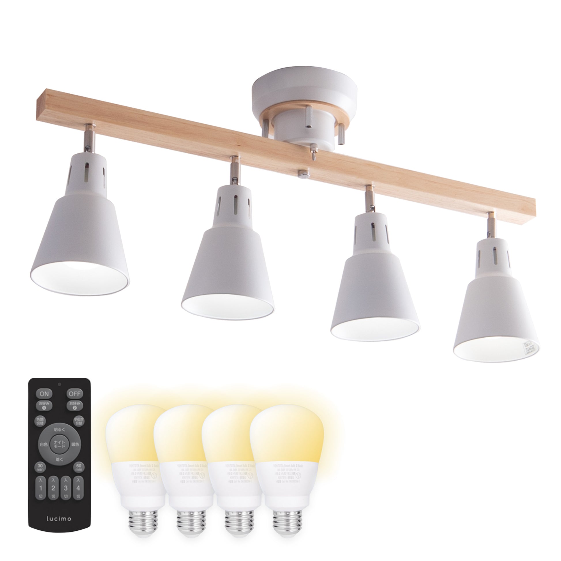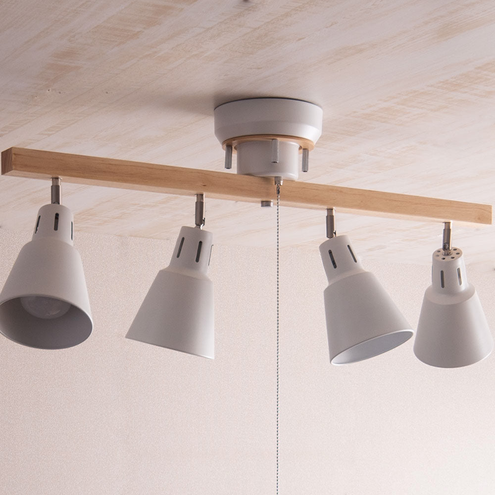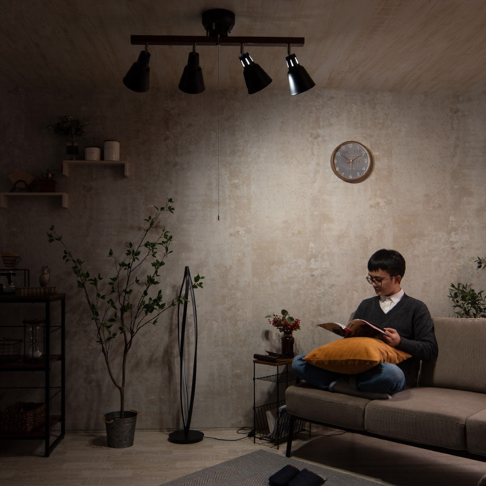 1つの照明で4つの空間が作れる、高機能シーリングスポットライト。シェードランプは、手動でくるくると360度回転できます。首部分も床に対して垂直から約90度まで傾けられるので、ほぼ希望通りの角度に合わせることができます。 リモコン式LED電球を装着すれば、食卓は食事が美味しく見える電球色で、リビングテーブルやソファは落ち着く明るい昼白色で照らすなど、一つのライトで部屋中に複数の光の空間を作り出すことが可能になります。『ホワイト』は自然の木目を生かし、上品でマットなホワイトのシェードをバランスよく配置することで、ナチュラルな雰囲気のモノト ーンインテリアが叶います。『ブラック』は、シェードから漏れる柔らかい光とステンレス製の金属部品の組み合わせがアクセントに。スタイリッシュで洗練された印象を与えてくれます。点灯の際にはフレームとシェードの影が美しく天井に照らし出され、お部屋の雰囲気を一層オシャレに変えるシーリングスポットライトです。全灯のON/OFFはもちろん、明るさの切り替えから光色の調整までリモコン下部にある単体ボタンで4つの電球をそれぞれ別々に細かく操作できます。角度調整も可能です。