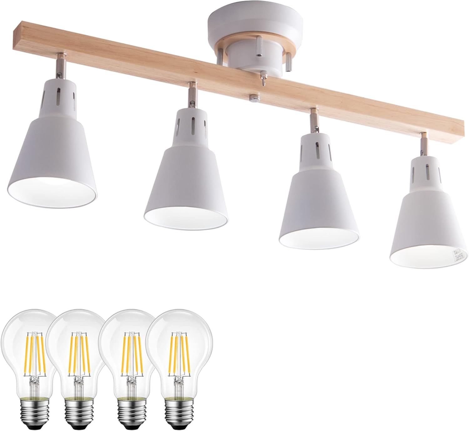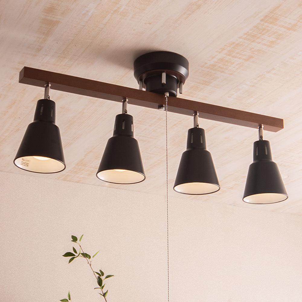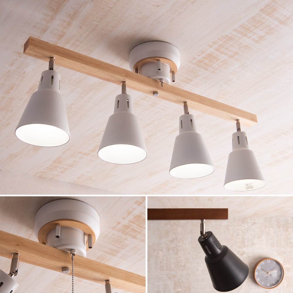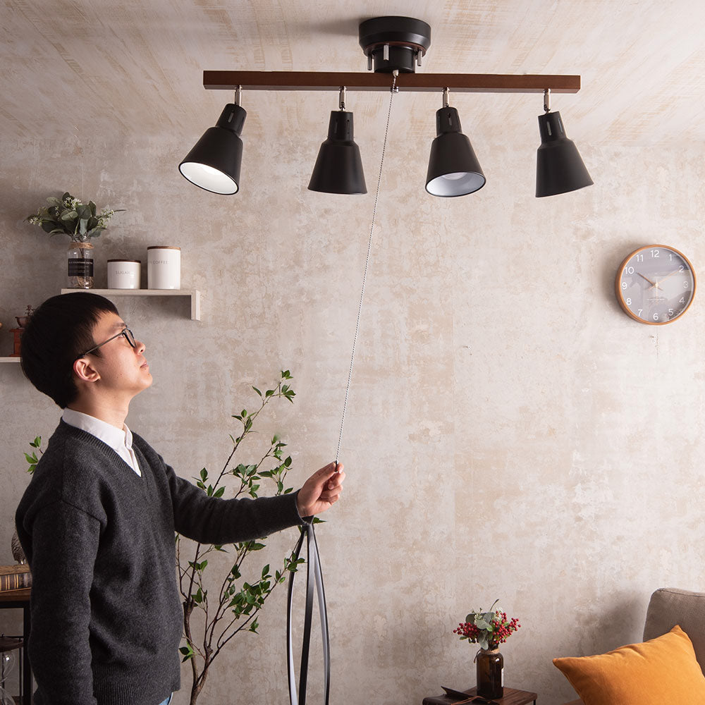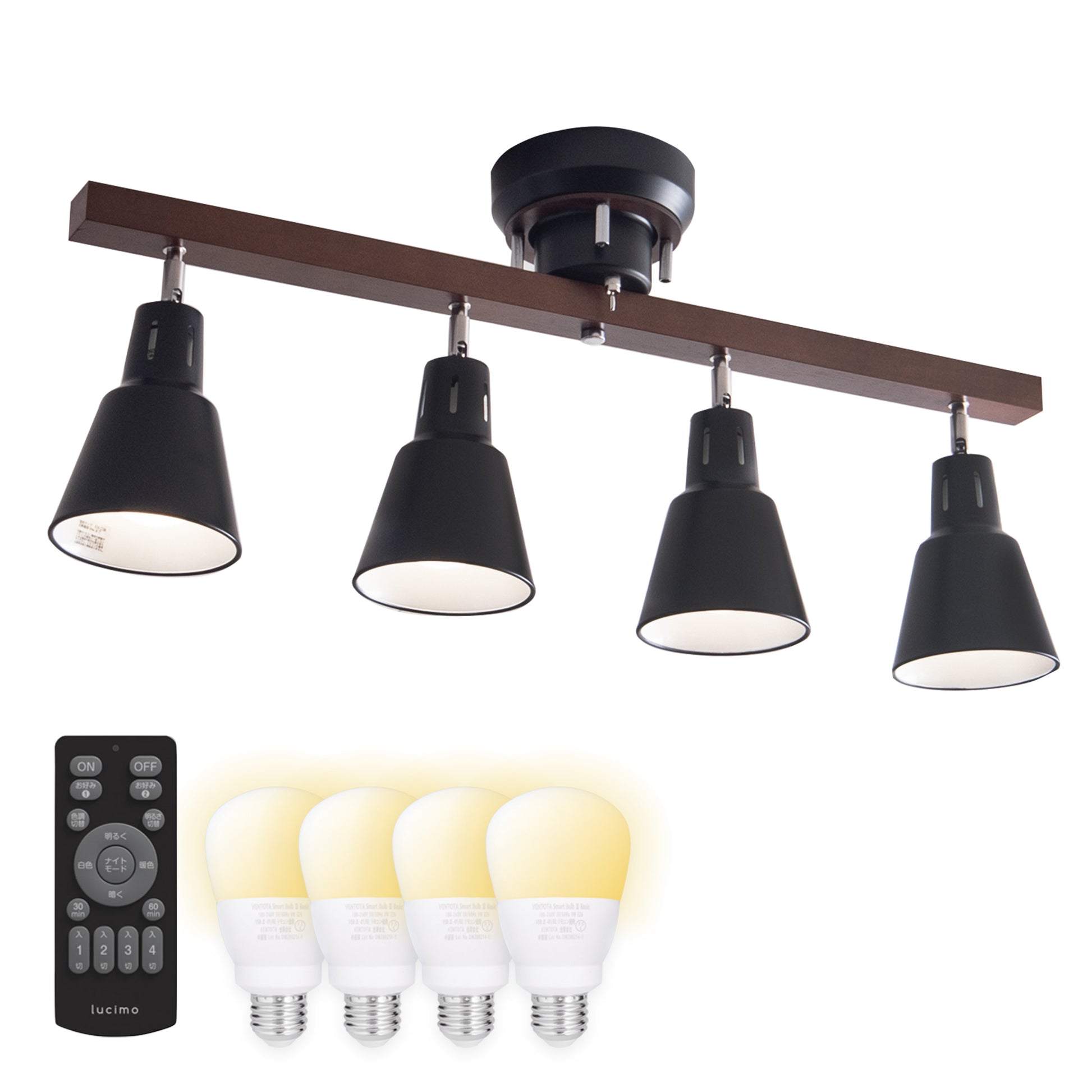 1つの照明で4つの空間が作れる、高機能シーリングスポットライト。シェードランプは、手動でくるくると360度回転できます。首部分も床に対して垂直から約90度まで傾けられるので、ほぼ希望通りの角度に合わせることができます。 リモコン式LED電球を装着すれば、食卓は食事が美味しく見える電球色で、リビングテーブルやソファは落ち着く明るい昼白色で照らすなど、一つのライトで部屋中に複数の光の空間を作り出すことが可能になります。『ホワイト』は自然の木目を生かし、上品でマットなホワイトのシェードをバランスよく配置することで、ナチュラルな雰囲気のモノト ーンインテリアが叶います。『ブラック』は、シェードから漏れる柔らかい光とステンレス製の金属部品の組み合わせがアクセントに。スタイリッシュで洗練された印象を与えてくれます。点灯の際にはフレームとシェードの影が美しく天井に照らし出され、お部屋の雰囲気を一層オシャレに変えるシーリングスポットライトです。全灯のON/OFFはもちろん、明るさの切り替えから光色の調整までリモコン下部にある単体ボタンで4つの電球をそれぞれ別々に細かく操作できます。角度調整も可能です。