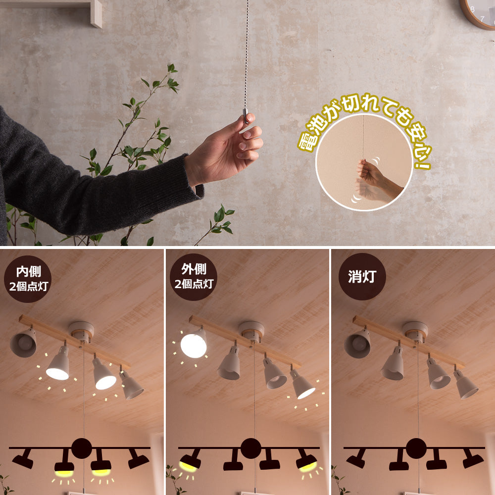 夜中に急に起きて照明を点けたい「あれっ、リモコンが効かない、電池が切れたのかなあ、ウチは壁のスイッチも無いしなあ、どうしよう。」そんなときの為に照明ON/OFFのプルチェーンスイッチをお付けしました。これでとっさの時も心配要りません。さらに、プルチェーンスイッチの長さはハサミで切ってお好きな長さにすることができ、使わない時は外しておくことも可能です。(チェーンの長さは約75cmでお届けします。)プルチェーンスイッチでできる操作は、2灯点灯・違う方向の2灯点灯・全灯点灯・消灯です。 LEDの光に飽きてしまい、白熱電球の暖かい光で気分転換するときにも、プルチェーンスイッチで点灯数を変えたりすることができるので大活躍してくれます。