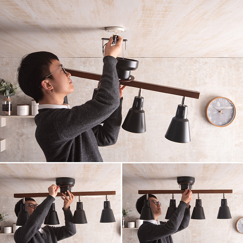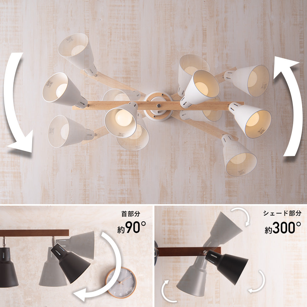 ランプシェードは、それぞれ手動でくるくると約300度回転できます。首部分も床に対して垂直から約90度まで傾けられるので、ほぼお望み通りの角度に合わせることができます。角度を変えることによって、ランプから出る光と影が天井や壁面に映し出されておしゃれな雰囲気が醸し出されます。全てのランプを同じ方向に向けてもよいですし、それぞれのランプを違う方向に向けると照明全体に動きが出ておもしろいですね。本体フレームの向きと合わせて、お好みの角度でご使用いただけます。向きが自由に調整できるシーリングライトは、お気に入りの絵や作品など、スポット的に照らしたい部分にだけ光を当てることができます。一つのお部屋でも暗い所と明るい所ができるため、奥行きのある、オシャレな空間ができます。
