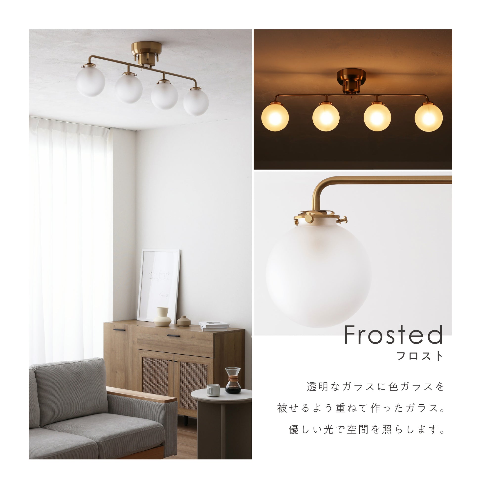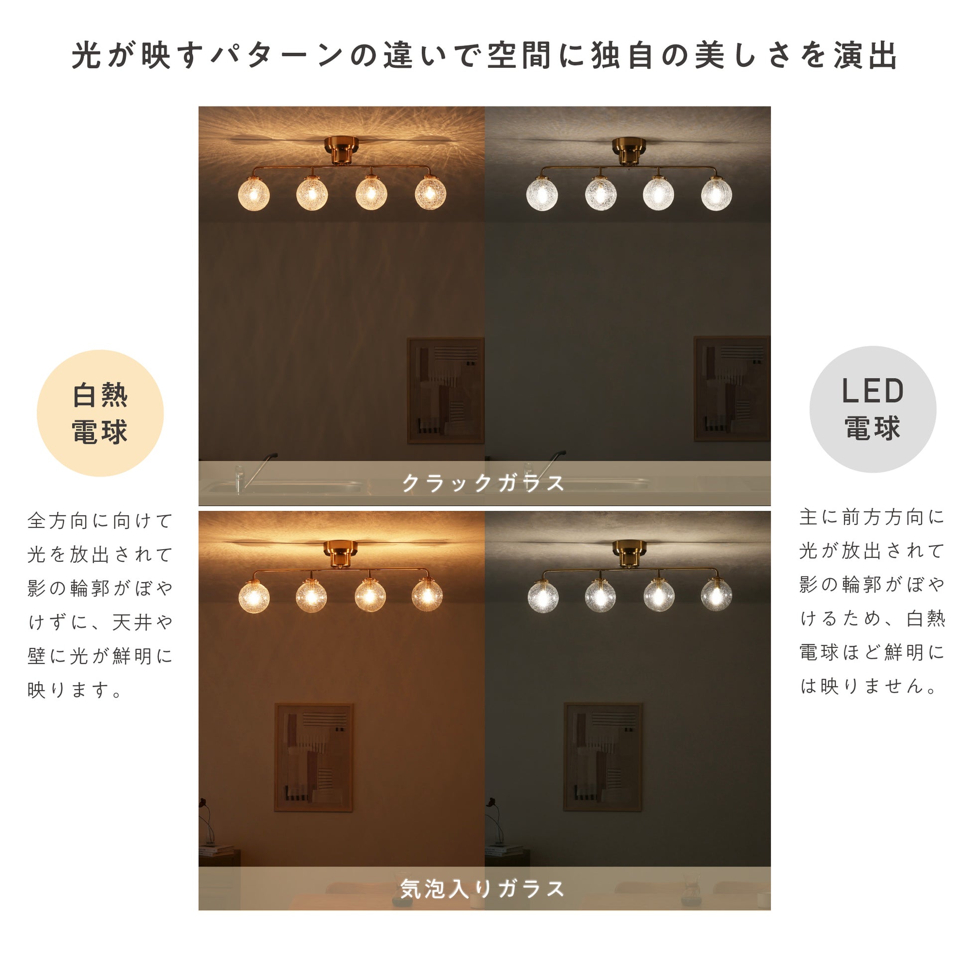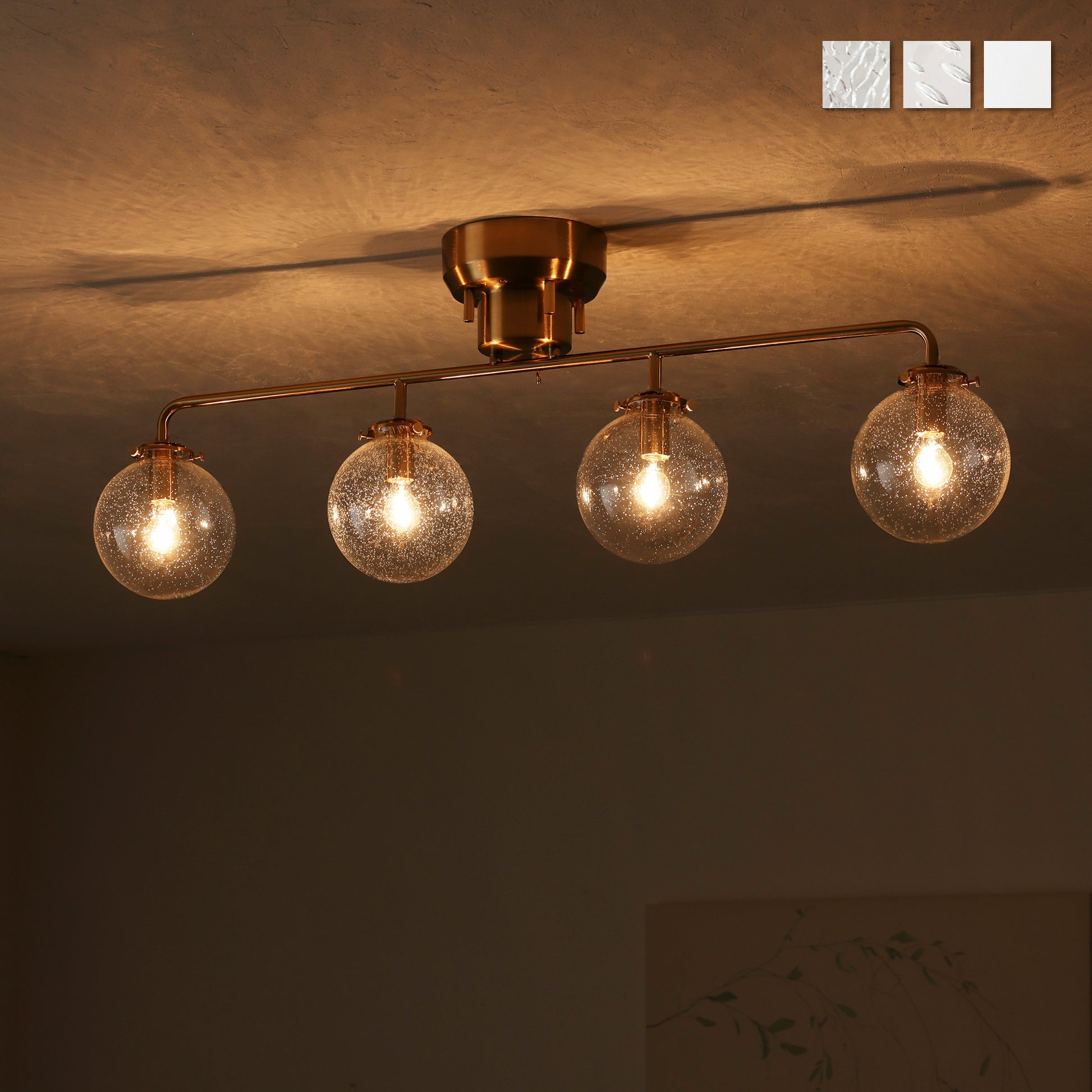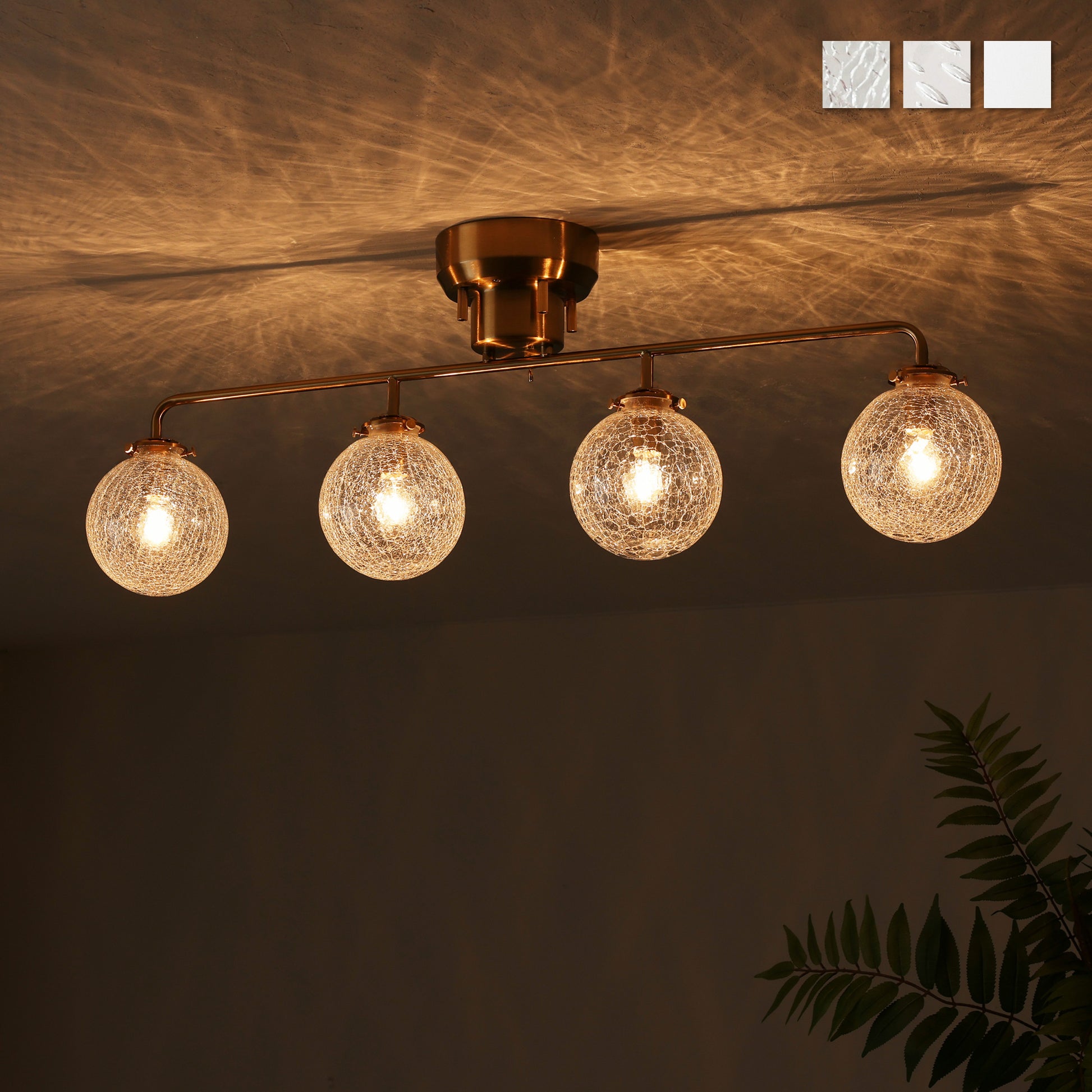 Malmo-Sシーリングライトは、ゴールドのフレームに包まれ、優雅な輝きを放つガラスシェードが空間を照らし出します。3種類のガラスから選択可能なフロスト、気泡入り、クラックは、それぞれ独自の特徴を持ち、洗練された雰囲気を演出します。明かりが灯ると、シェード内部の美しいガラスが幻想的な影を壁や天井に描き出し、空間を彩ります。プルチェーンスイッチの搭載により、点灯切替が容易で、ライト本体の約330度の回転機能によって、細かな角度調整が可能です。お部屋に最適な光を演出し、優雅な雰囲気を引き立てることができます。
