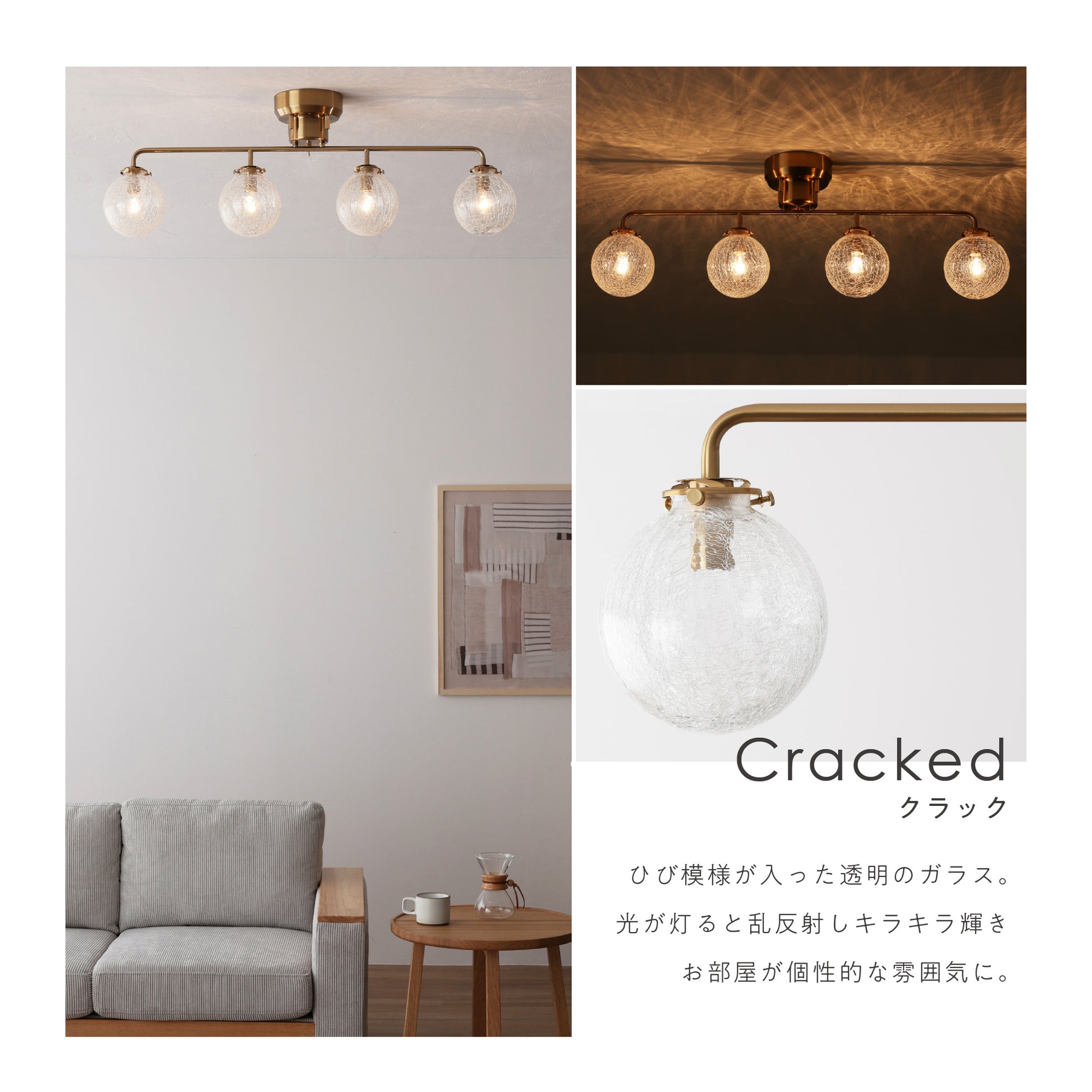 クラックガラスを用いたペンダント照明は、透明のガラスに美しいひび模様が織り込まれています。光が灯ると、そのひび割れ模様が光を乱反射し、部屋中にキラキラとした輝きを放ちます。この輝きは、空間に独自の魅力と個性を与え、照明だけでなくインテリア全体の雰囲気を引き立てます。また、光の加減や角度によって、さまざまな表情を見せるため、新たな視覚的な楽しみを提供してくれます。そのため、クラックガラスを採用したペンダント照明は、空間に洗練されたアクセントを加えるだけでなく、暖かく魅力的な雰囲気を演出するのに最適です。