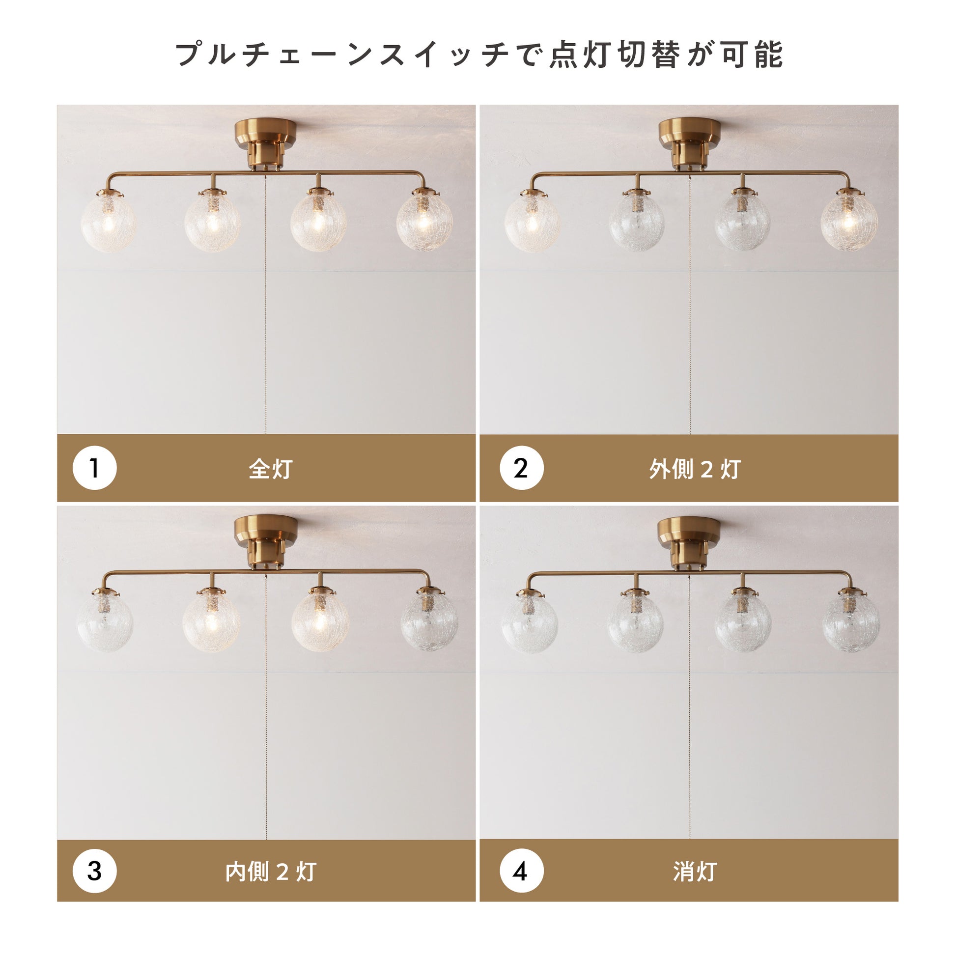 本体に付属のプルチェーンスイッチを使用して、2灯⇒残り2灯⇒全灯⇒消灯と点灯切替ができます。この機能は本体の機能なので、どんな電球でも使用できます。リモコン式電球をご使用の場合はプルチェーンスイッチを取り外してお使いいただけます。