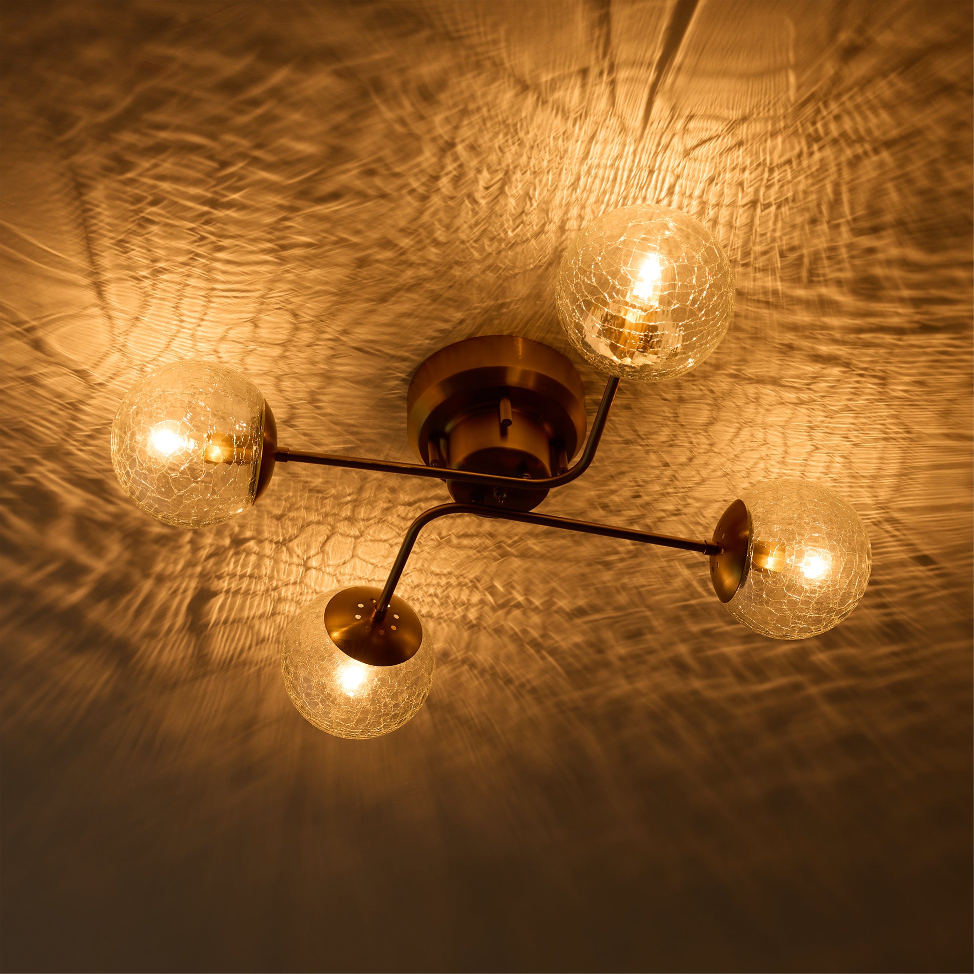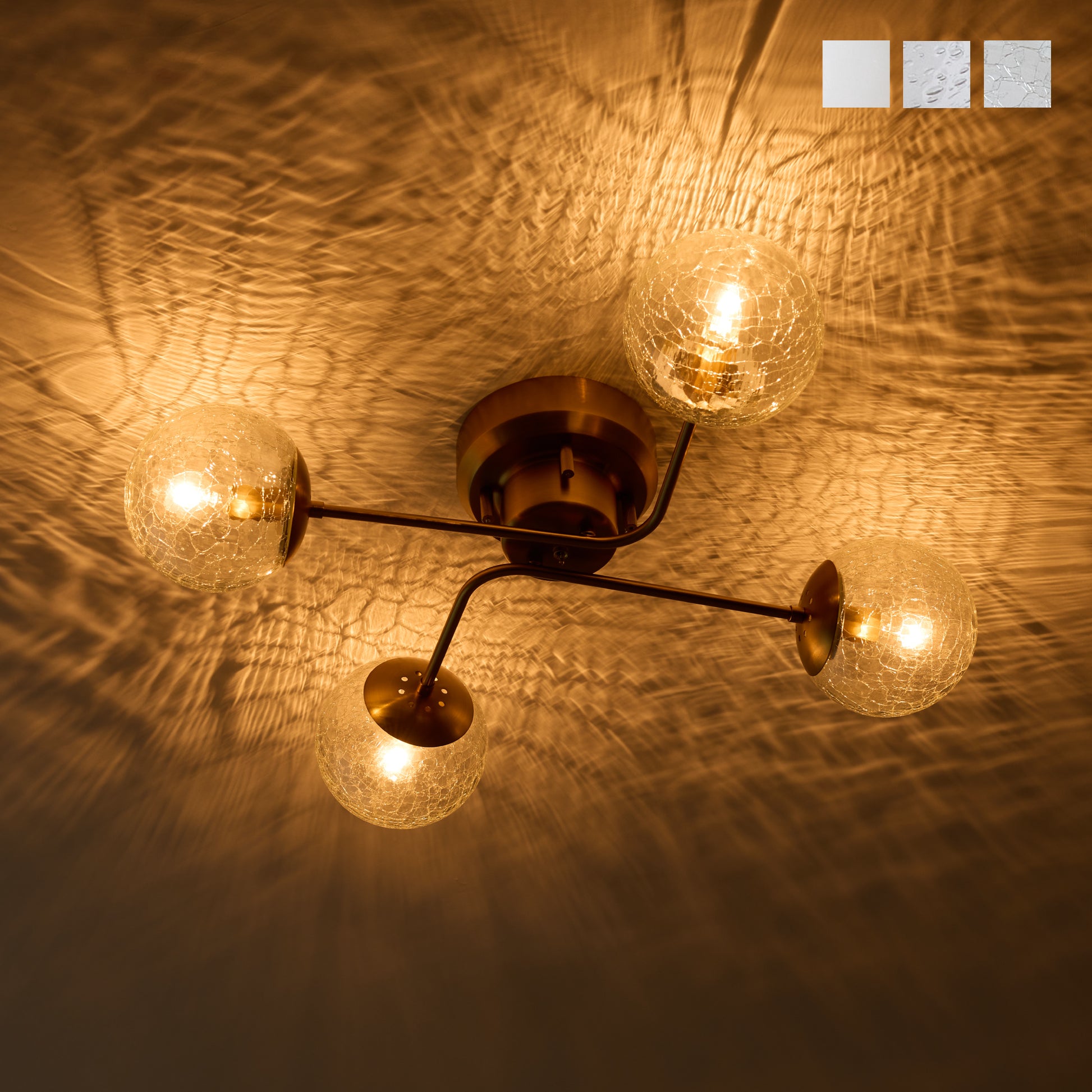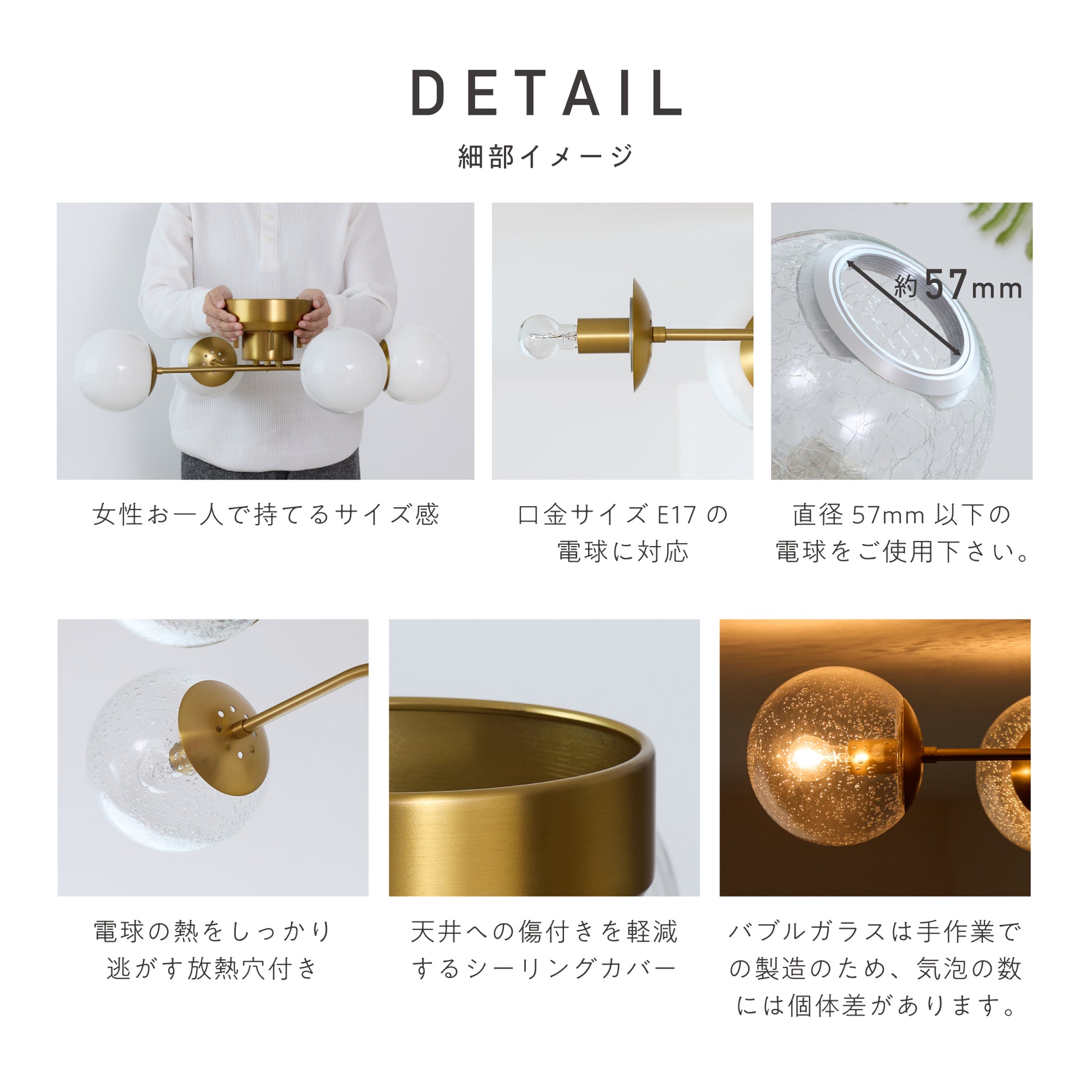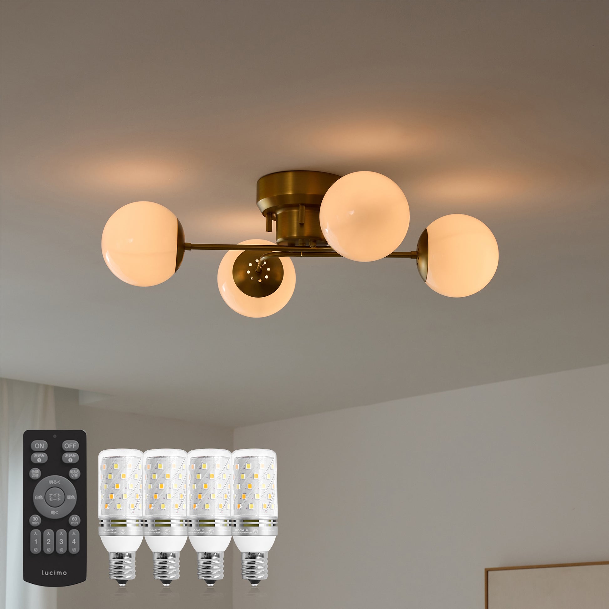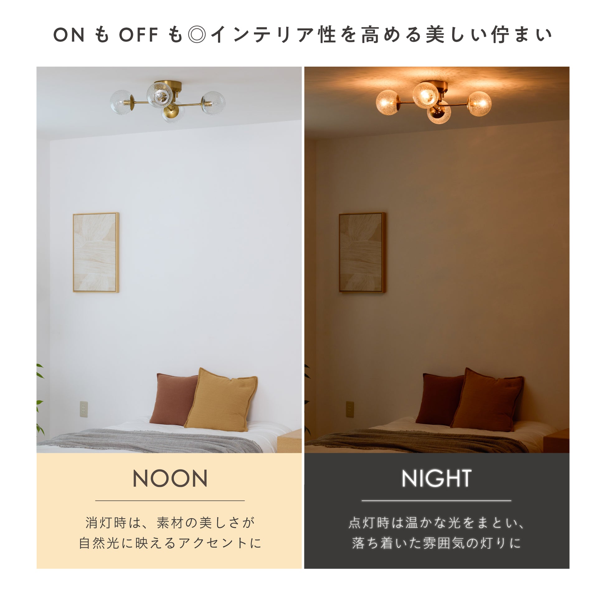 シーリングライト Modico-ART-C(モディコ-アート-C) は、ゴールドフレームとガラスシェードを組み合わせた上質なデザインが魅力の照明です。4つのライトが生み出す明るさはリビングやダイニングを華やかに照らし、ホテルのような特別感を演出します。優しい丸みのフォルムと温かな光が空間に心地良い雰囲気をもたらし、プルチェーンで2灯〜全灯まで簡単に切り替え可能。約330度の角度調整で光の向きを思い通りにコントロールできます。消灯時も美しいシルエットがインテリアのアクセントとなり、ホワイト・バブル・クラックの3種のガラスから好みに合わせて光の表情を選べます。シリーズで揃えることで、統一感のある洗練されたコーディネートも楽しめます。