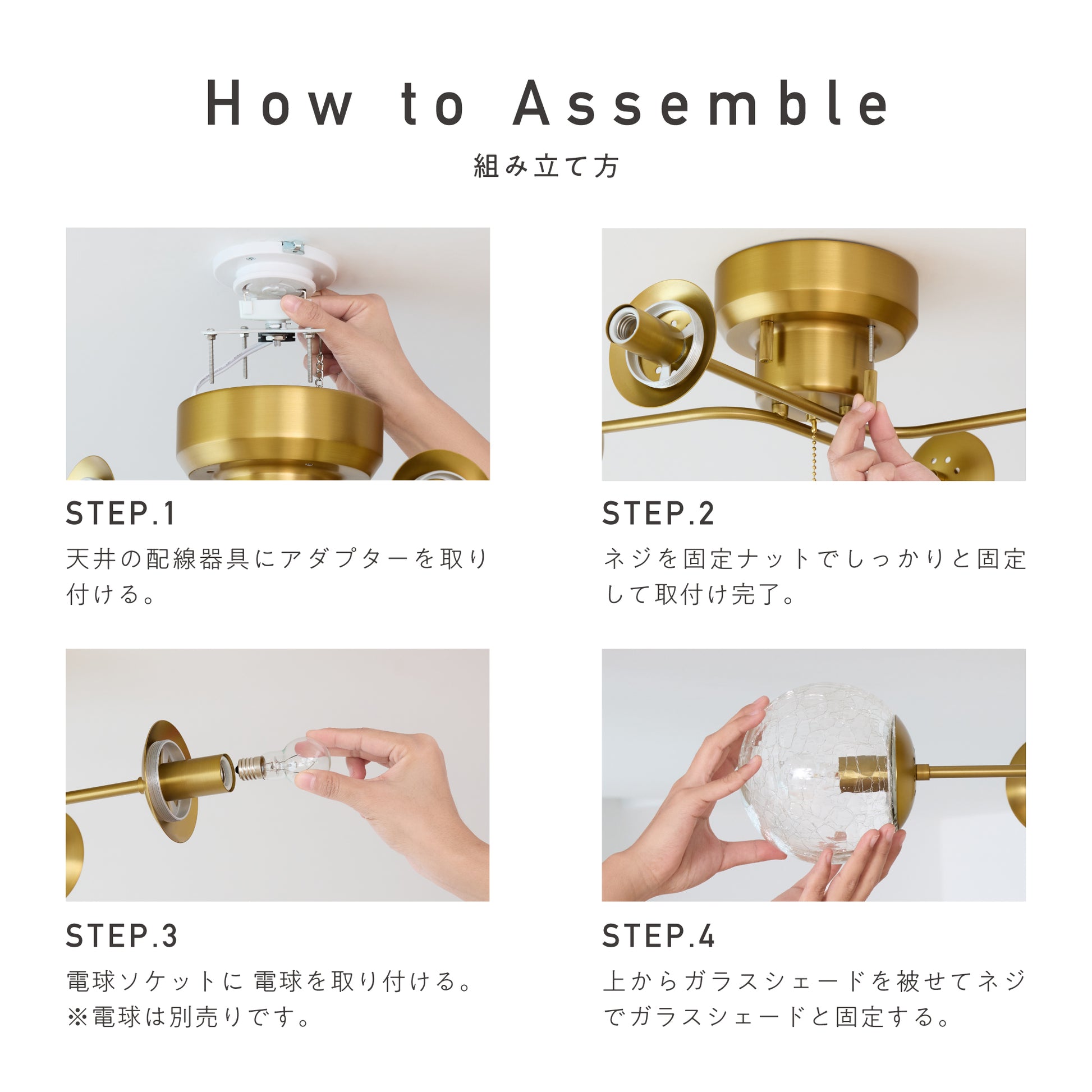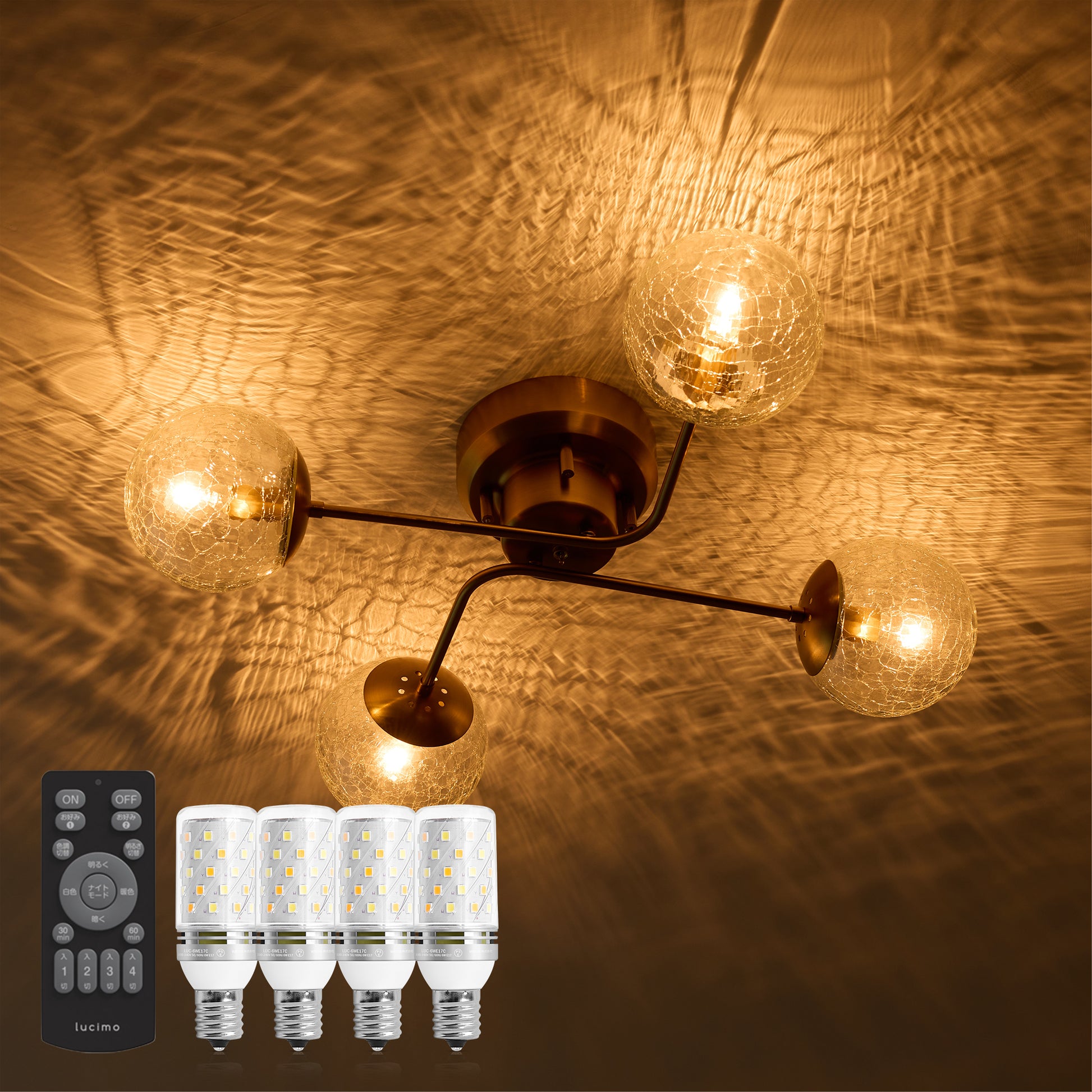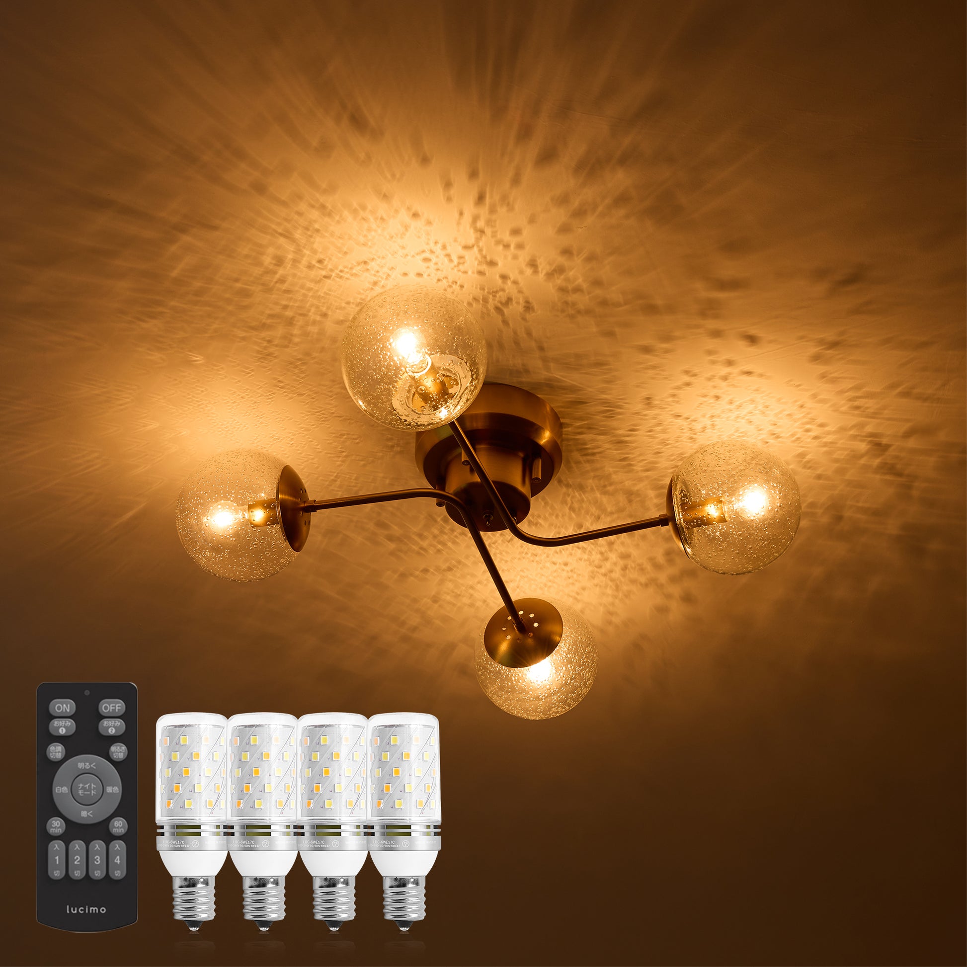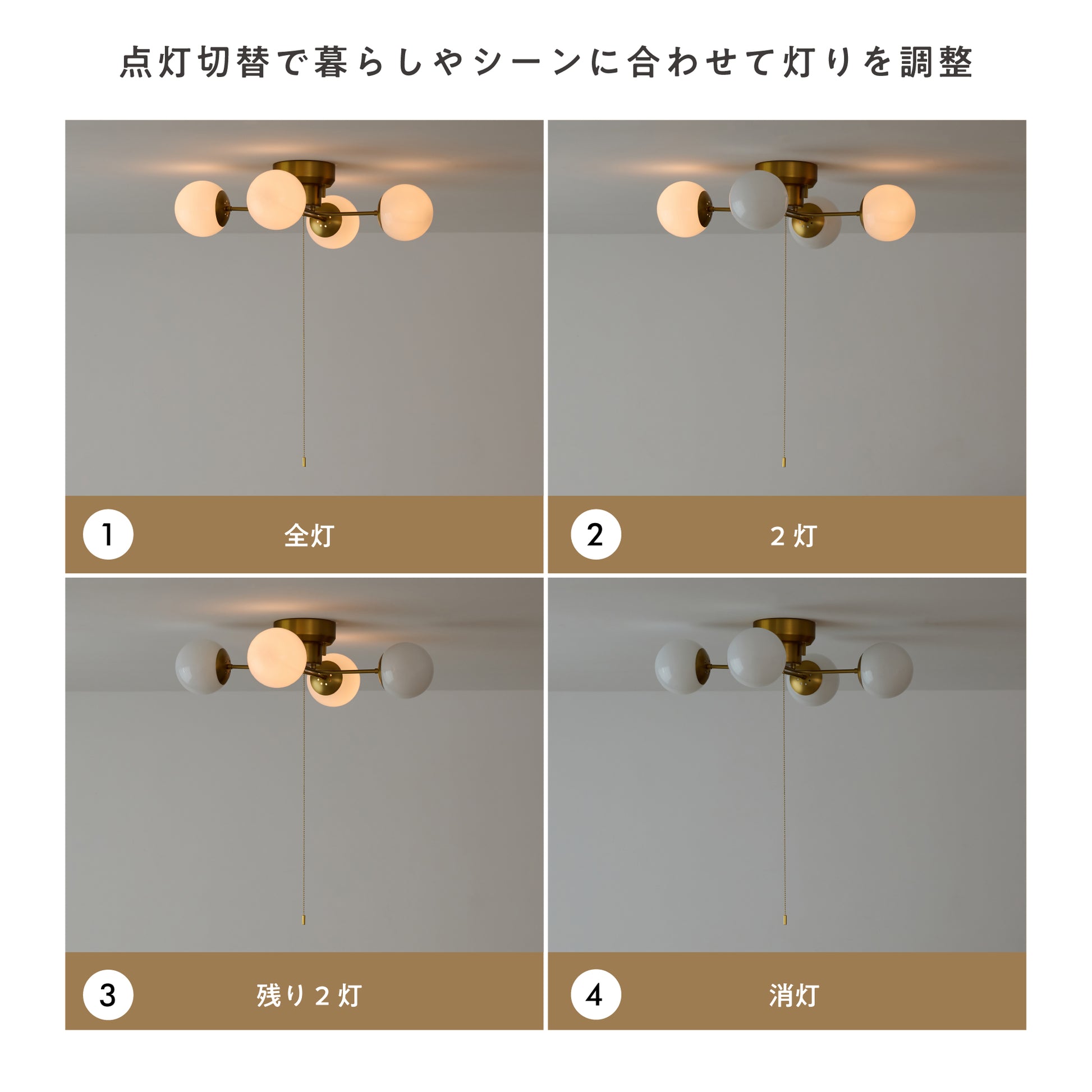 本体に付属のプルチェーンスイッチを使用して、2灯⇒残り2灯⇒全灯⇒消灯と点灯切替ができます。この機能は本体の機能なので、どんな電球でも使用できます。リモコン式電球をご使用の場合はプルチェーンスイッチを取り外してお使いいただけます。