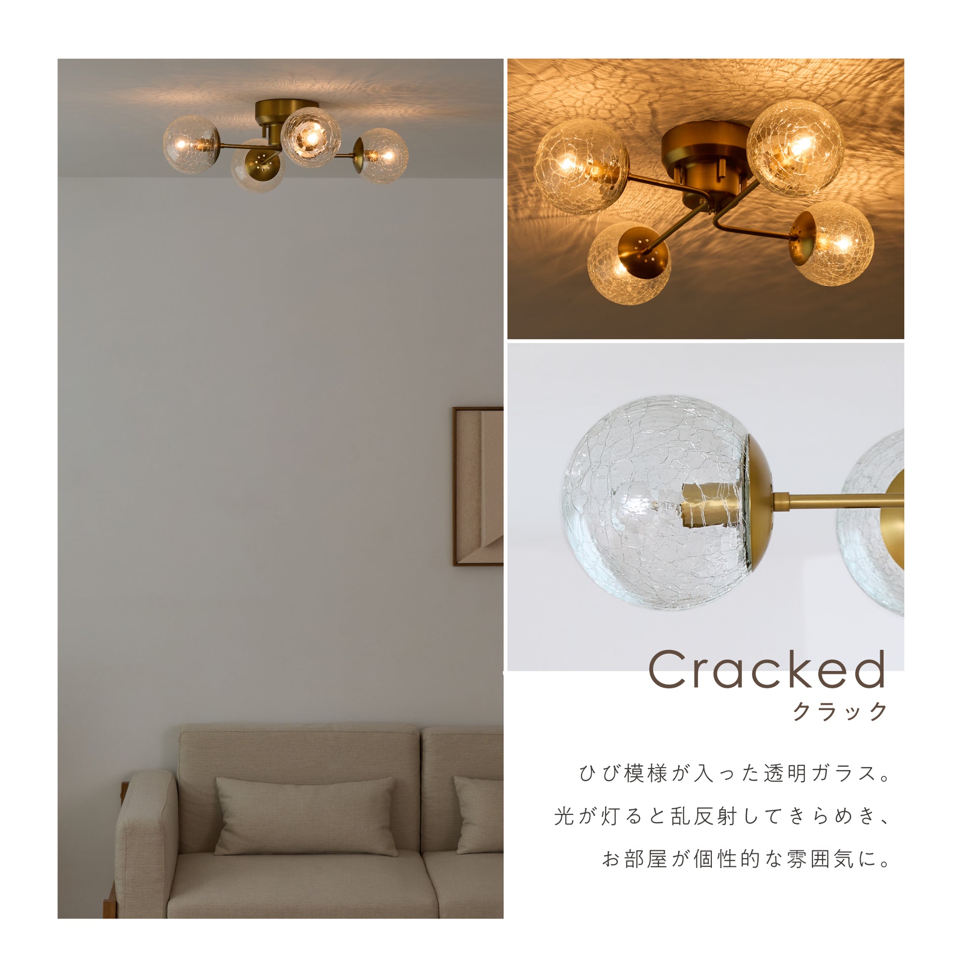 透明のガラスに美しいひび模様が織り込まれたクラックガラス。光が灯ると、そのひび割れ模様が光を乱反射し、部屋中にキラキラとした輝きを放ちます。この輝きは、空間に独自の魅力と個性を与え、照明だけでなくインテリア全体の雰囲気を引き立てます。また、光の加減や角度によって、さまざまな表情を見せるため、新たな視覚的な楽しみを提供してくれます。そのため、クラックガラスを採用した照明は、空間に洗練されたアクセントを加えるだけでなく、暖かく魅力的な雰囲気を演出するのに最適です。