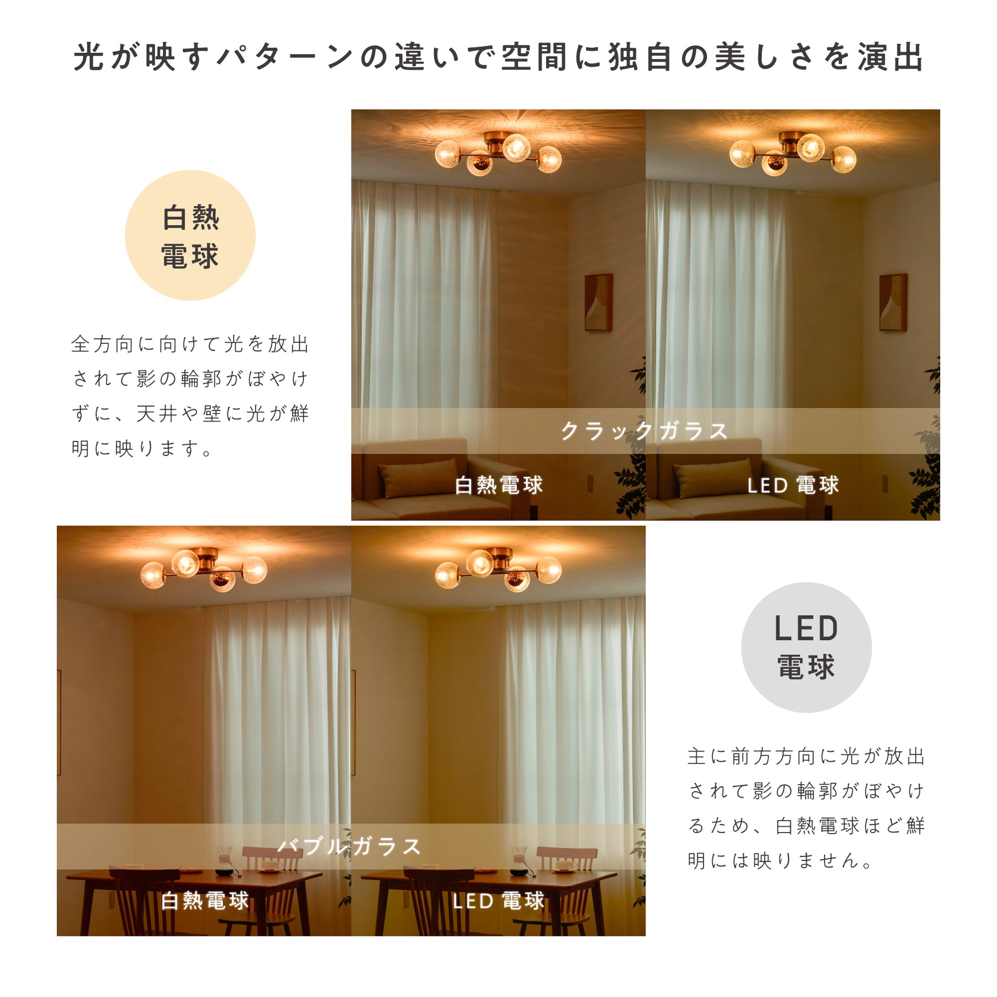 白熱電球は点光源として光を放射するため、影がくっきりと映ります。また、全方向に光を放出するため、影の輪郭がぼやけずに、天井や壁に鮮明に映ります。LED電球は点光源ではなく、指向性のある光を放射するため、影がぼやけます。また、主に前方方向に光を放出するため、影の輪郭がぼやけ、白熱電球ほど鮮明には映りません。