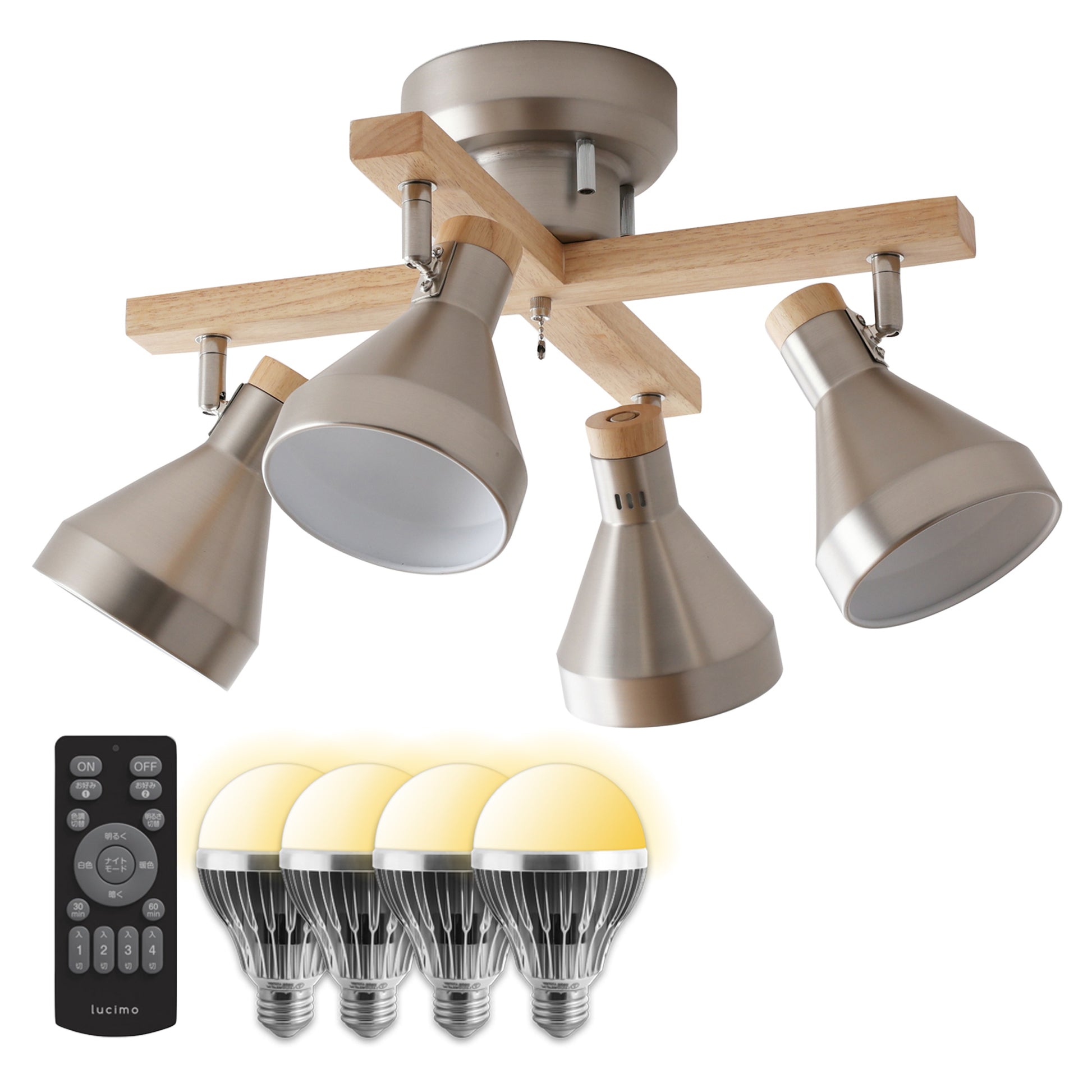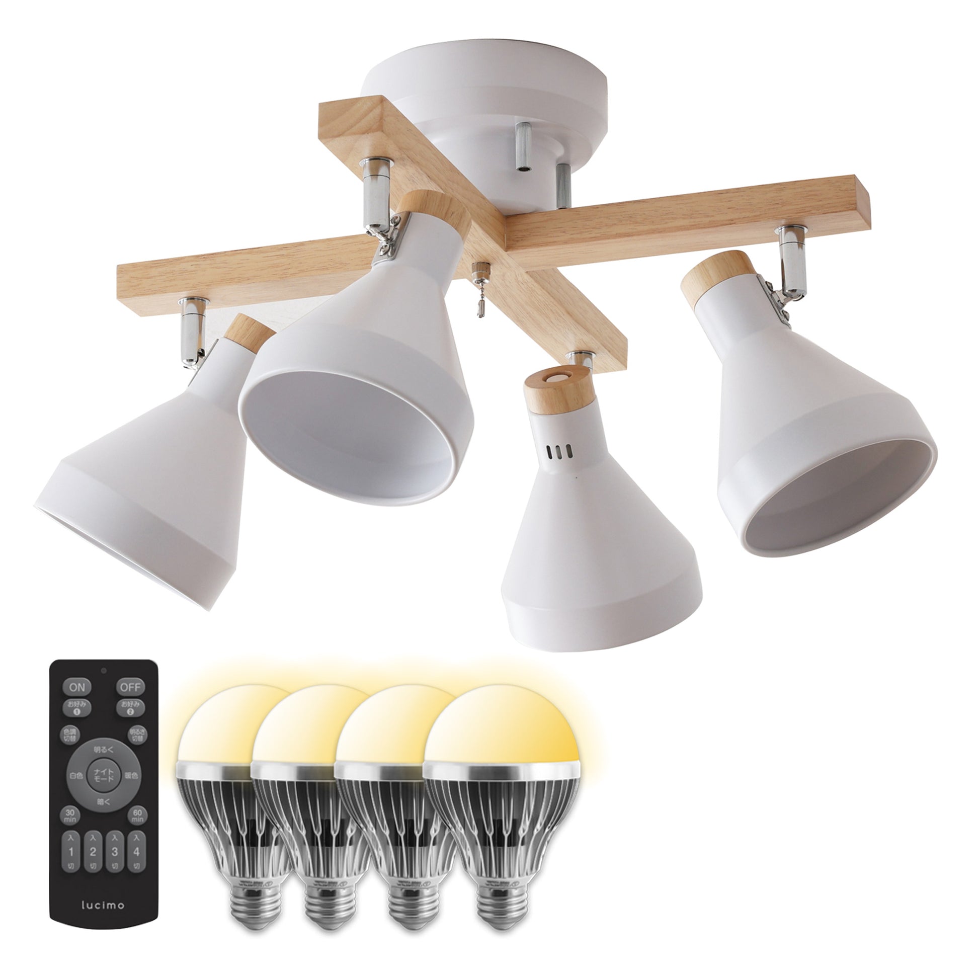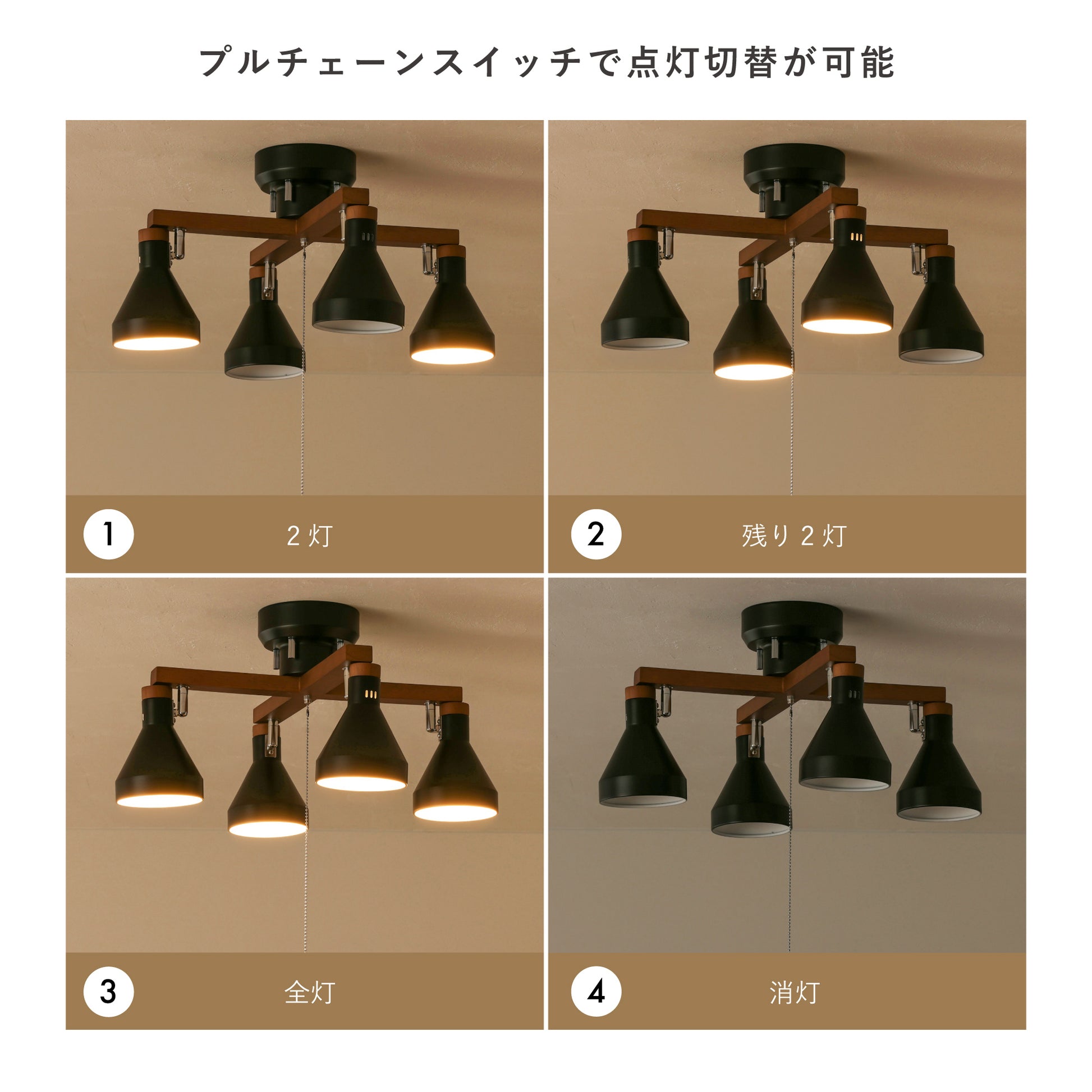 本体に付属のプルチェーンスイッチを使用して、2灯⇒残り2灯⇒全灯⇒消灯と点灯切替ができます。この機能は本体の機能なので、どんな電球でも使用できます。リモコン式電球をご使用の場合はプルチェーンスイッチを取り外してお使いいただけます。