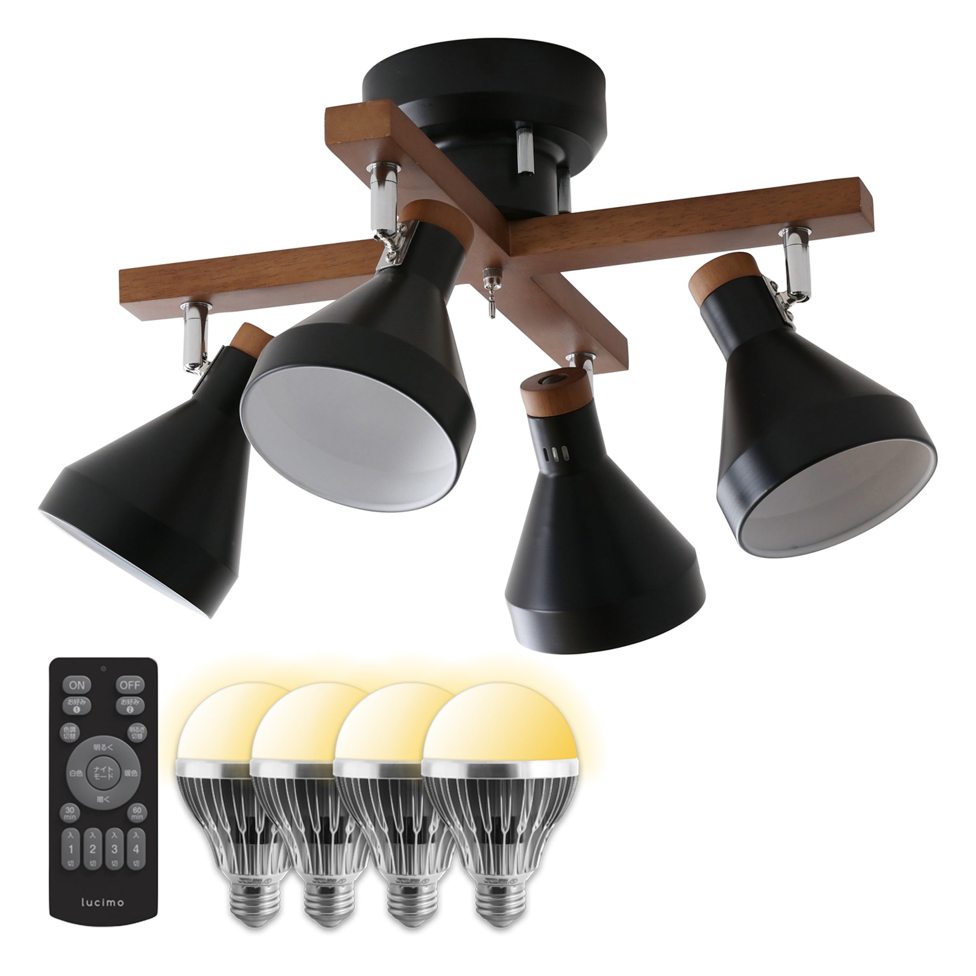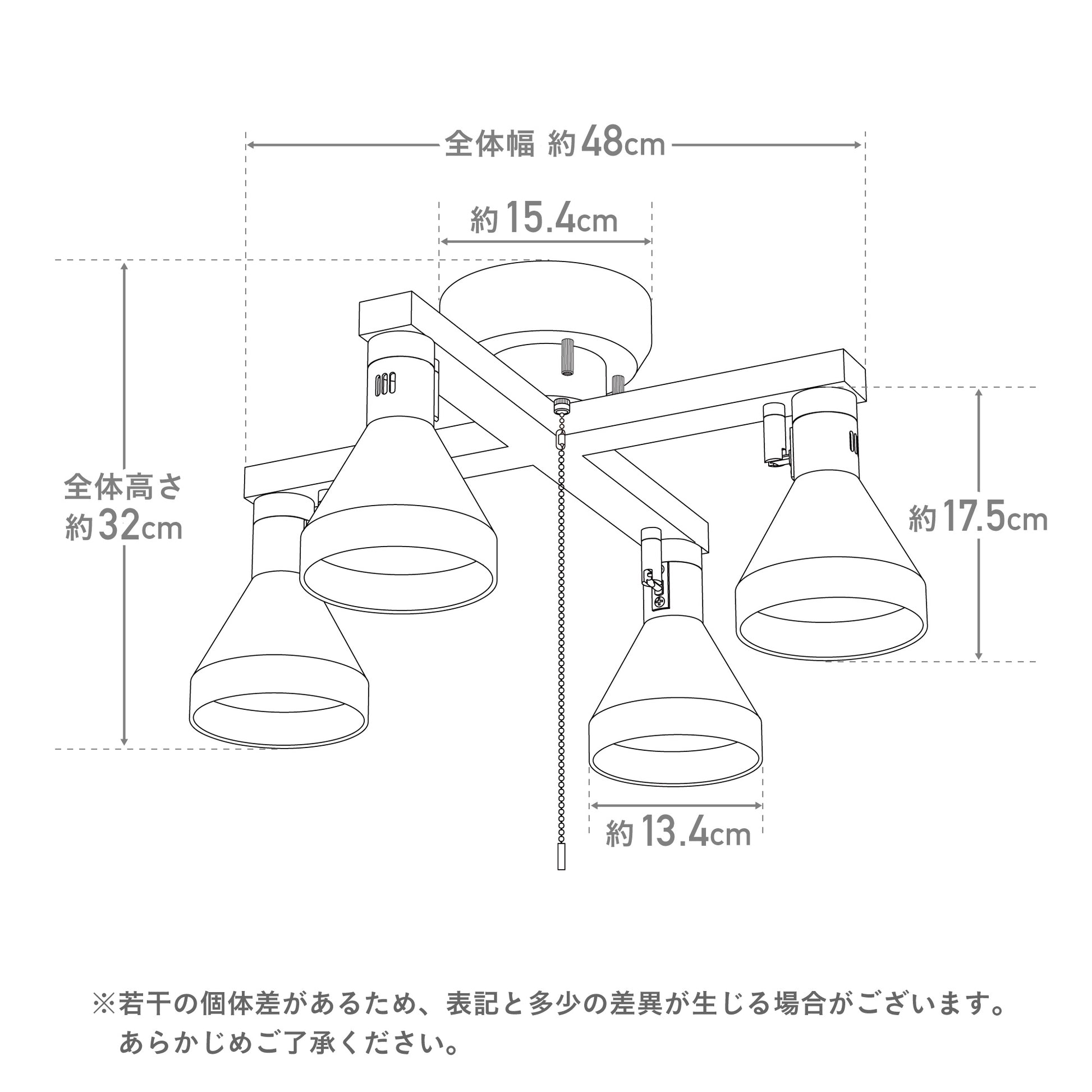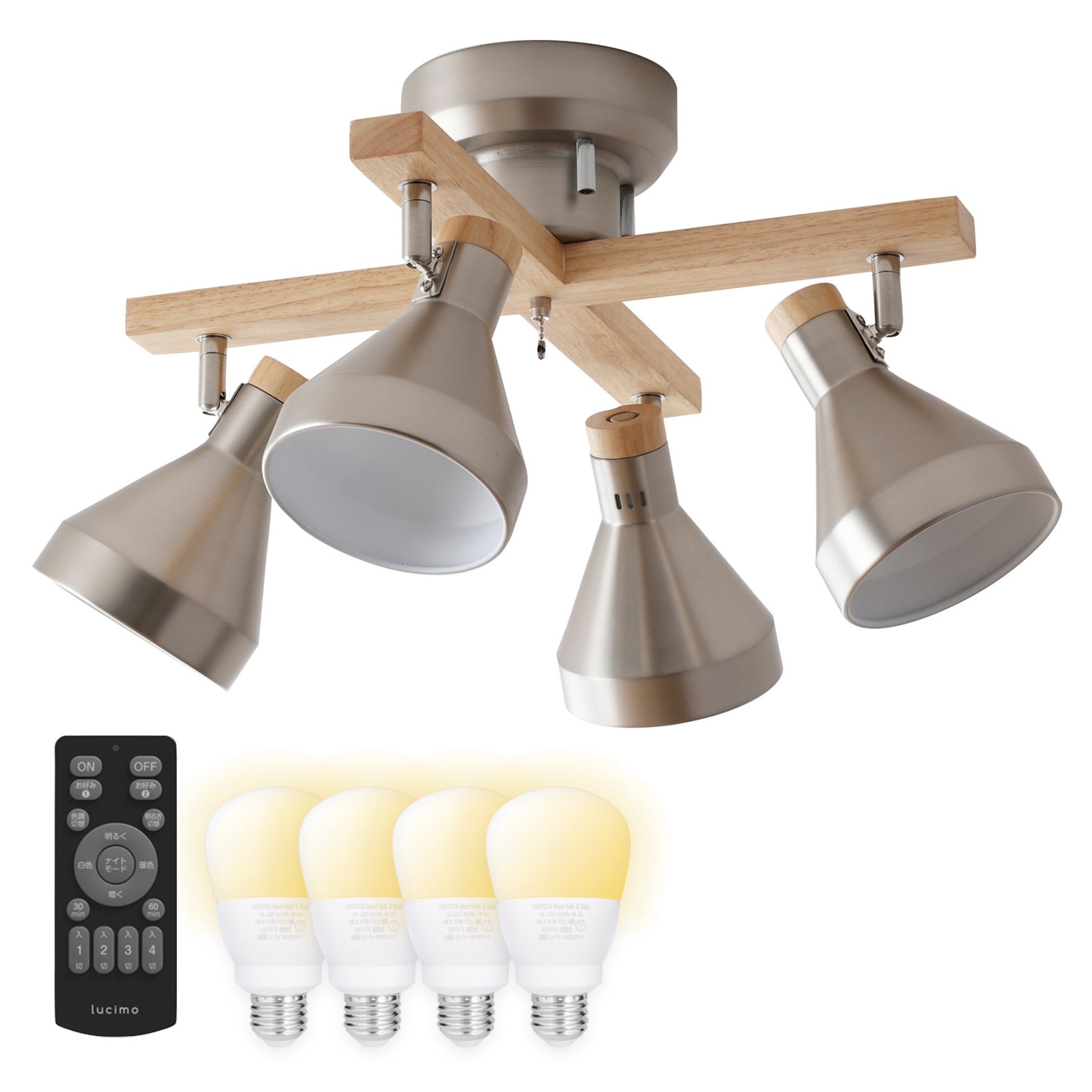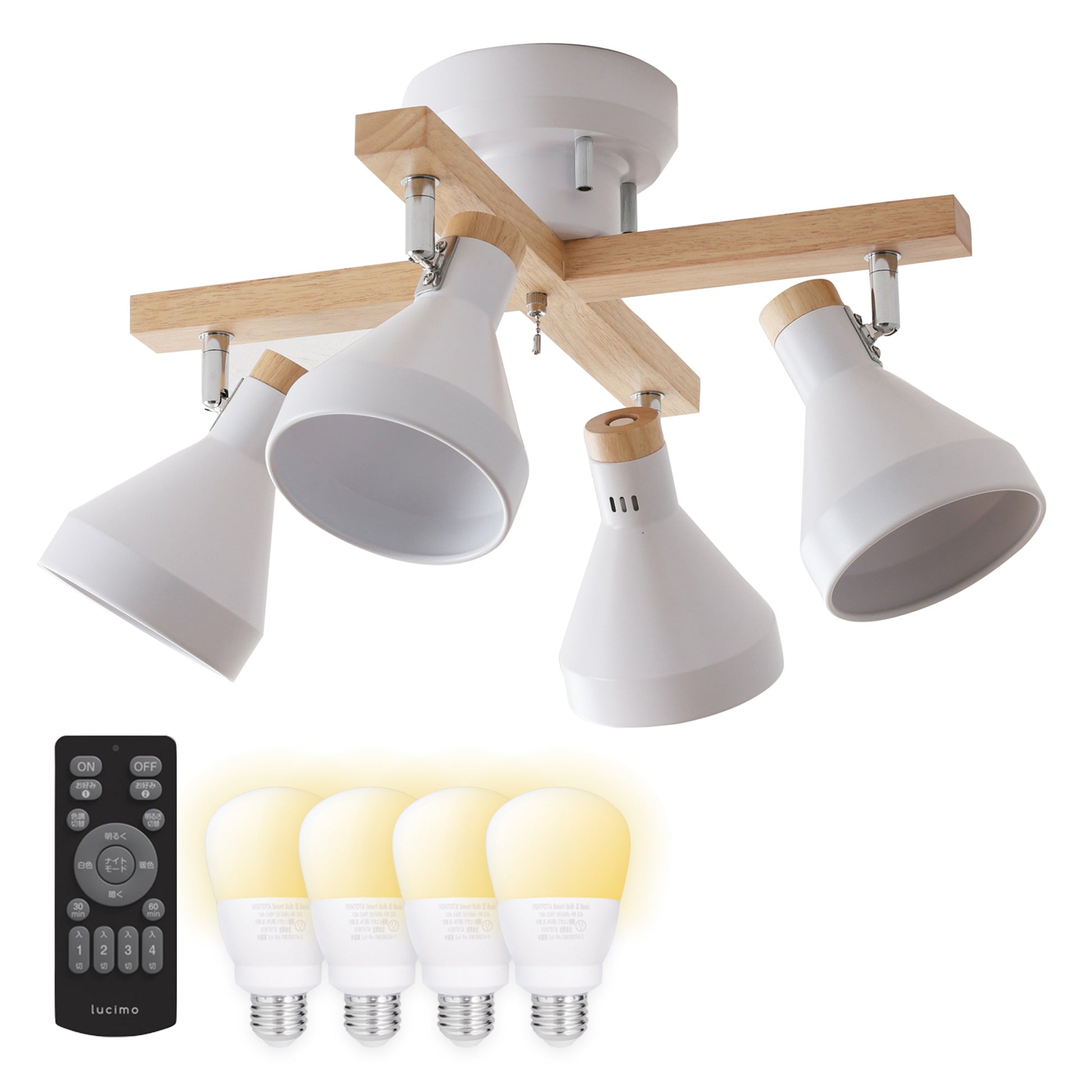 本体に付属のプルチェーンスイッチを使用して、2灯⇒残り2灯⇒全灯⇒消灯と点灯切替ができます。この機能は本体の機能なので、どんな電球でも使用できます。リモコン式電球をご使用の場合はプルチェーンスイッチを取り外してお使いいただけます。