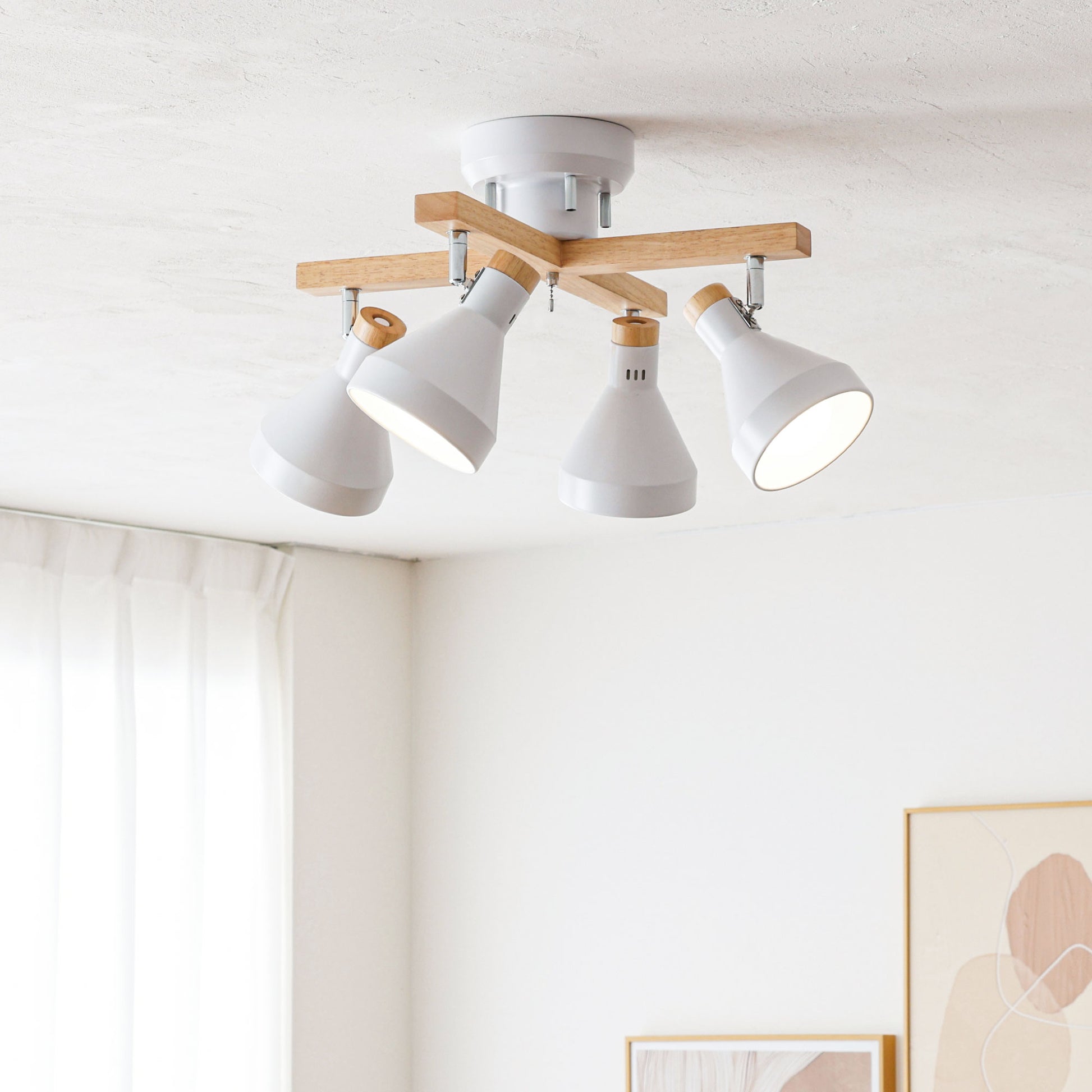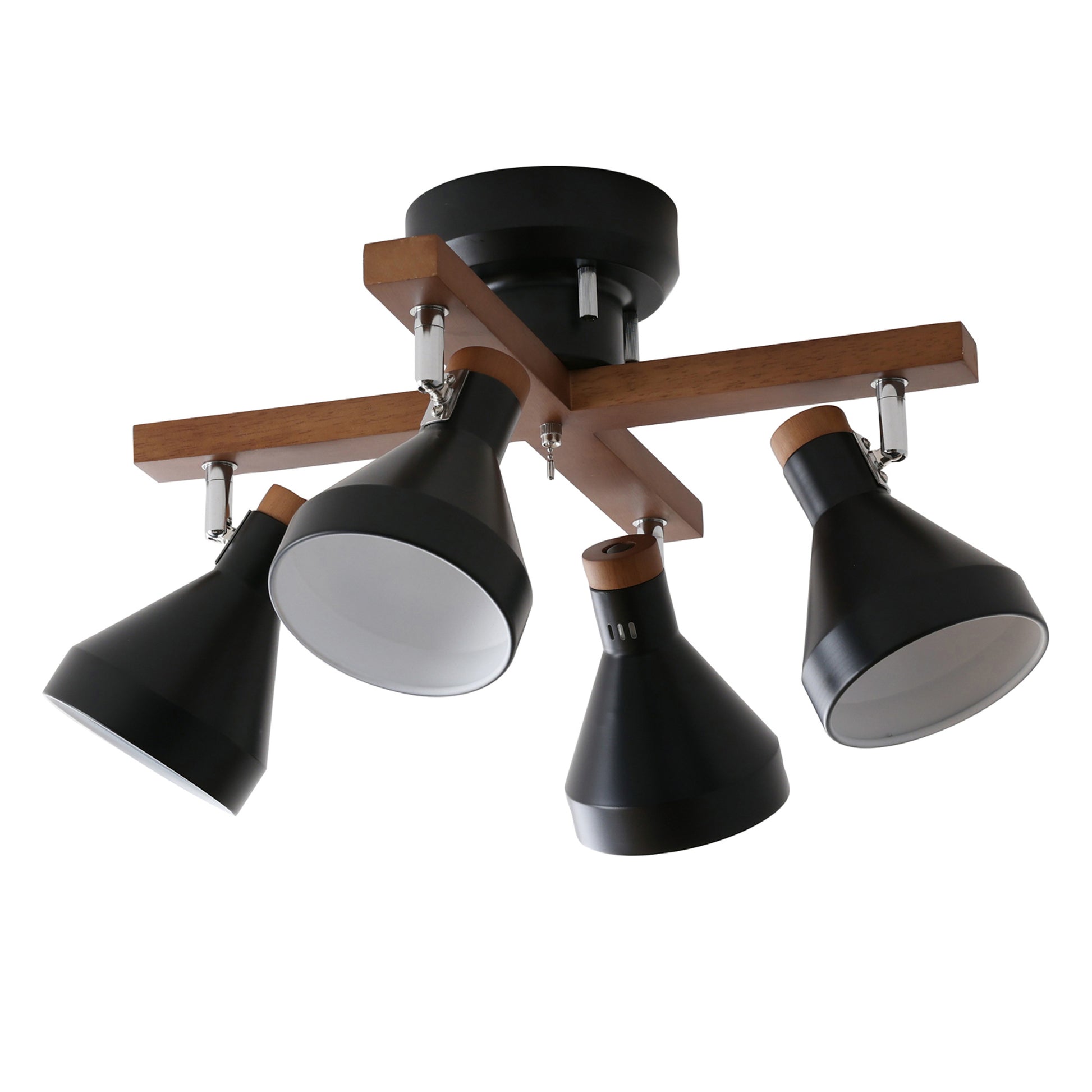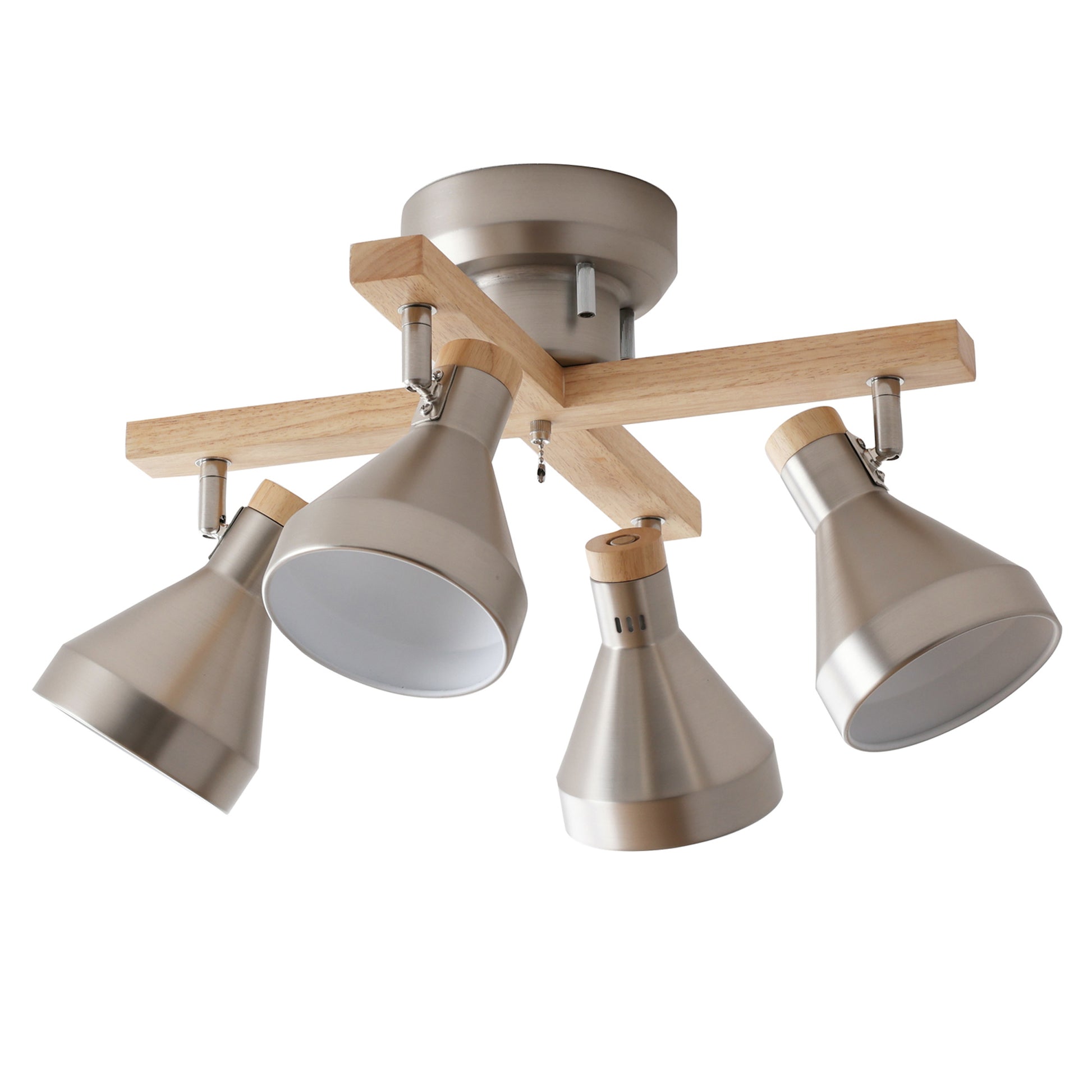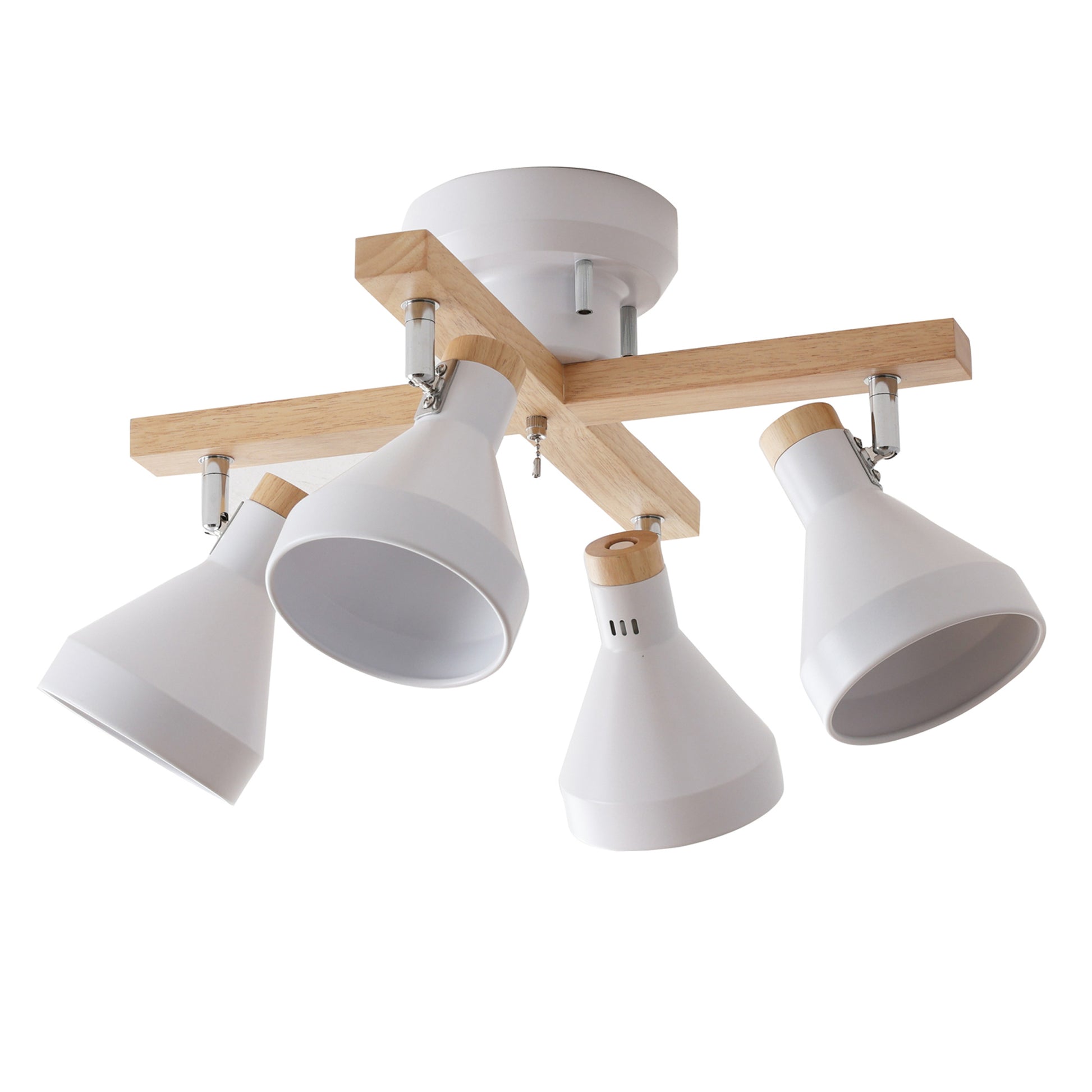 スチール素材のシェードをベースに木の温もりと柔らかさがアクセントとなる天然木を使用したシンプルデザインのシーリングスポットライトOtros-x。毎日の暮らしを引き立てる北欧風のデザインで設置するだけでどんなお部屋にもマッチし、上質な空間に早変わり。ランプシェードは角度調整が可能でそれぞれ動かせるため4方向に光をあてることができ、ほしいところに明かりを届けます。引っ張れば点灯/消灯ができる便利な外せるプルチェーンスイッチを搭載。ただ部屋を明るくするだけではなく、部屋全体のアクセントとしての存在感を持たせ、設置するだけで昼も夜も問わない空間にマッチするお部屋のインテリアとして欠かせないアイテムです。