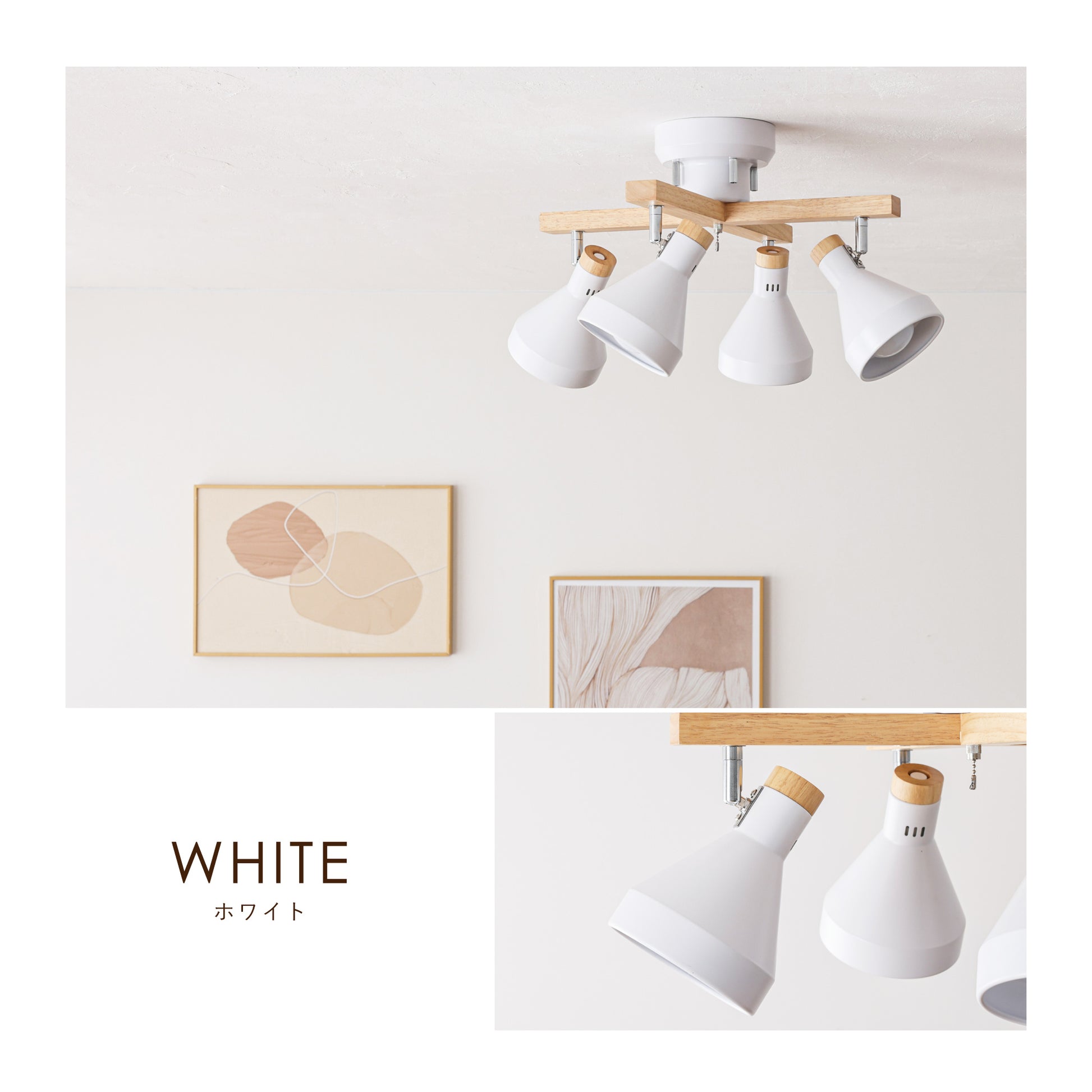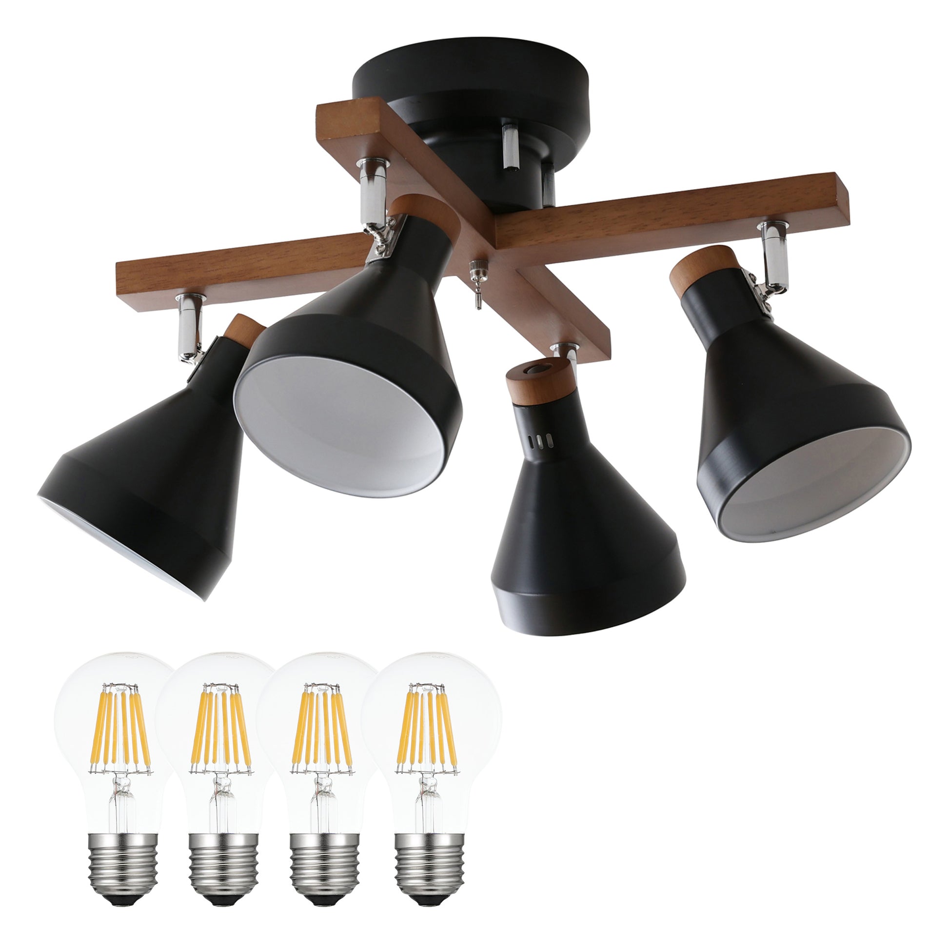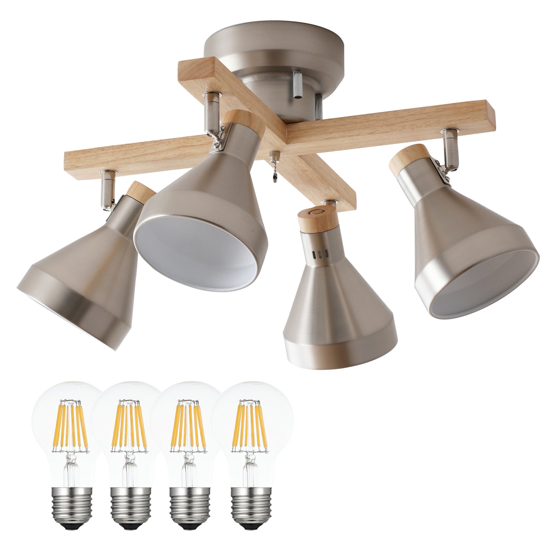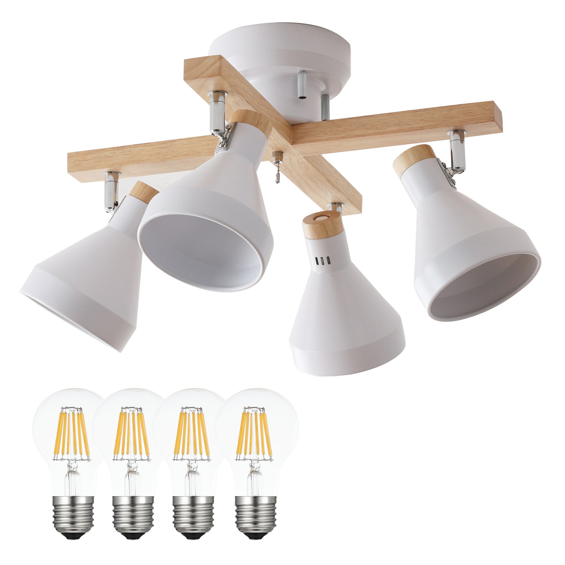 スチール素材のシェードをベースに木の温もりと柔らかさがアクセントとなる天然木を使用したシンプルデザインのシーリングスポットライトOtros-x。毎日の暮らしを引き立てる北欧風のデザインで設置するだけでどんなお部屋にもマッチし、上質な空間に早変わり。ランプシェードは角度調整が可能でそれぞれ動かせるため4方向に光をあてることができ、ほしいところに明かりを届けます。引っ張れば点灯/消灯ができる便利な外せるプルチェーンスイッチを搭載。ただ部屋を明るくするだけではなく、部屋全体のアクセントとしての存在感を持たせ、設置するだけで昼も夜も問わない空間にマッチするお部屋のインテリアとして欠かせないアイテムです。