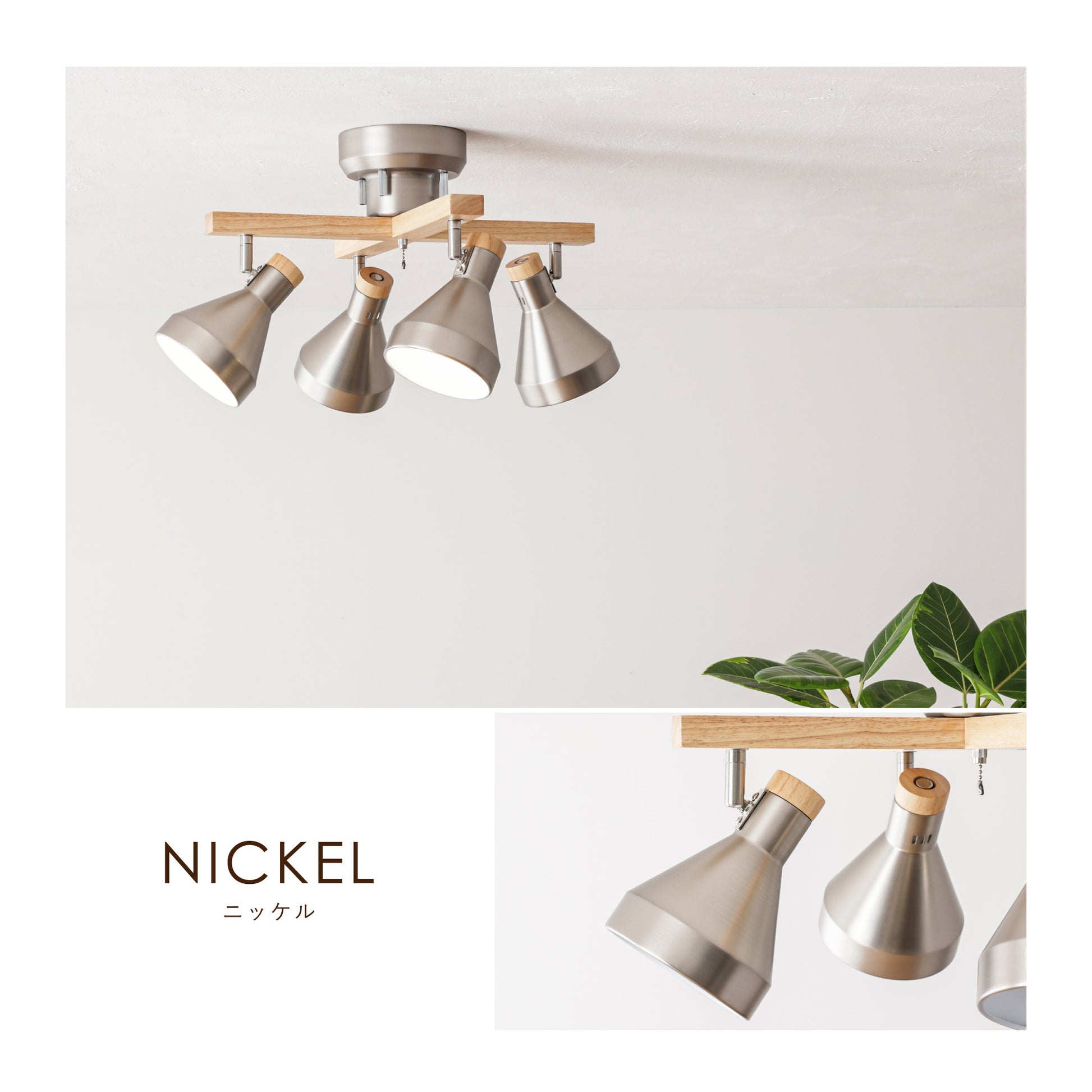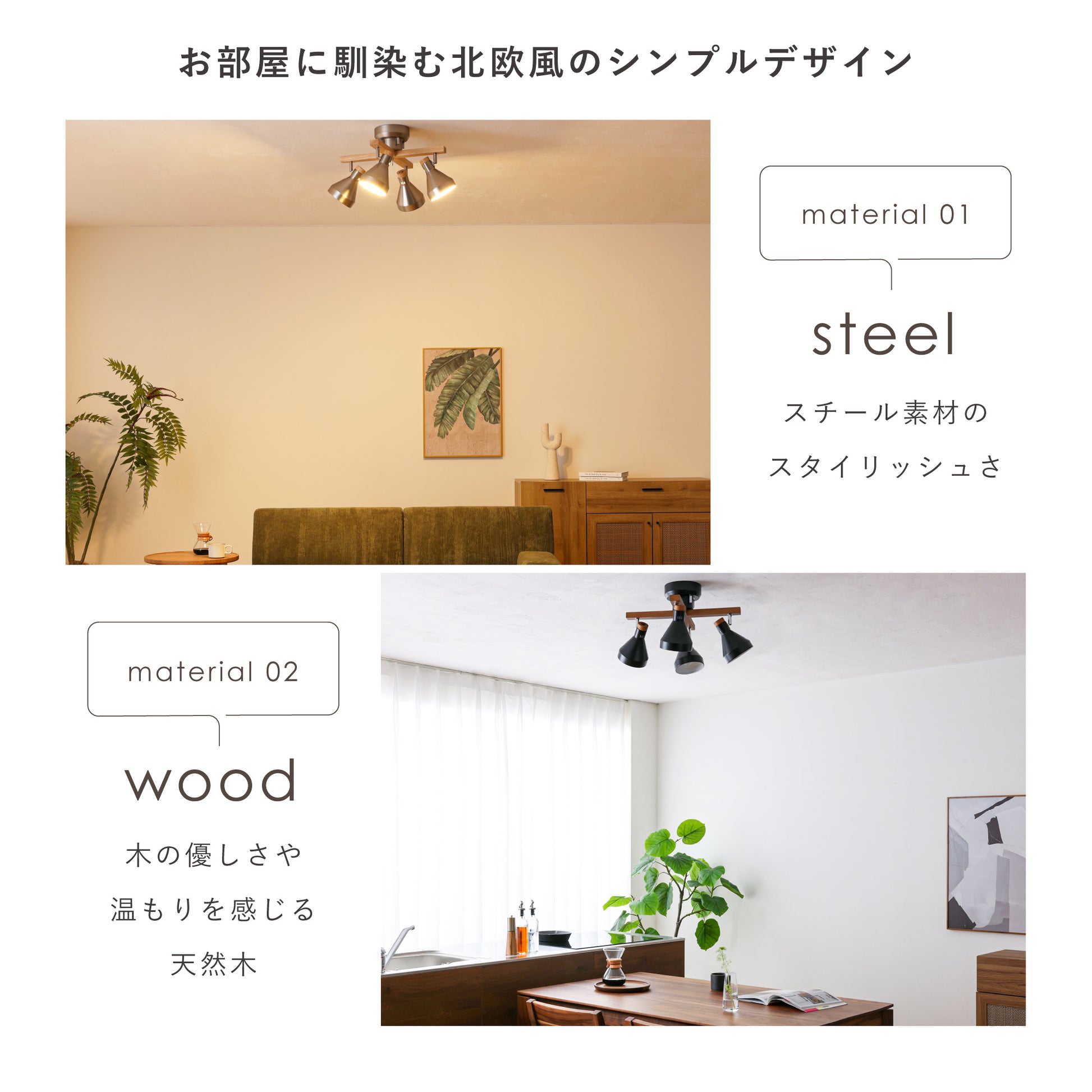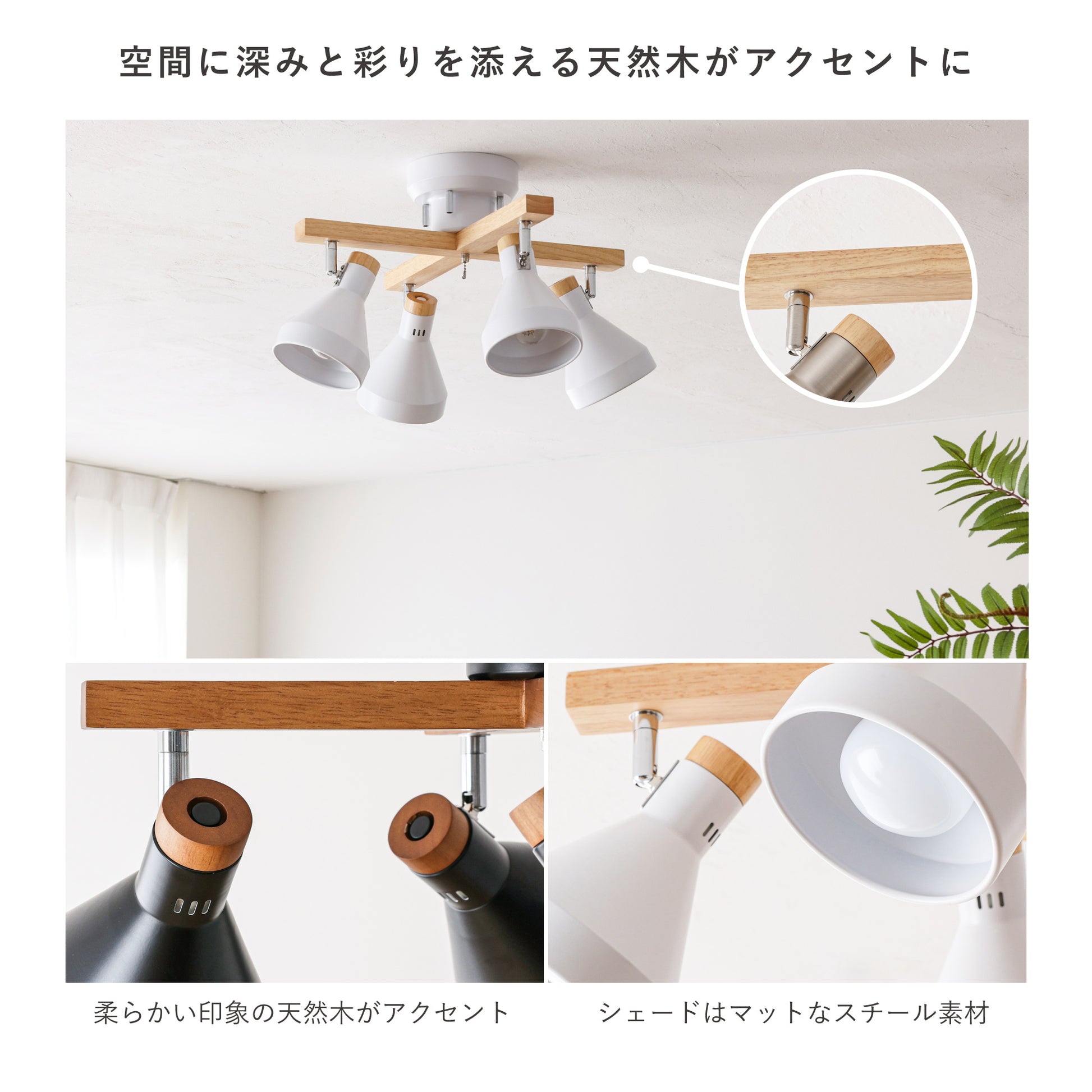 【スチール素材のスタイリッシュさ】×【木の優しさや温もりを感じる天然木】が組み合わさった洗練されたシンプルなデザインが、毎日の暮らしを引き立てる北欧風のシーリングスポットライト。スチール素材のシェードをベースに木の温もりと柔らかさがアクセントとなる天然木を使用したシンプルデザインで設置するだけでどんなお部屋にもマッチし、上質な空間に早変わりします。