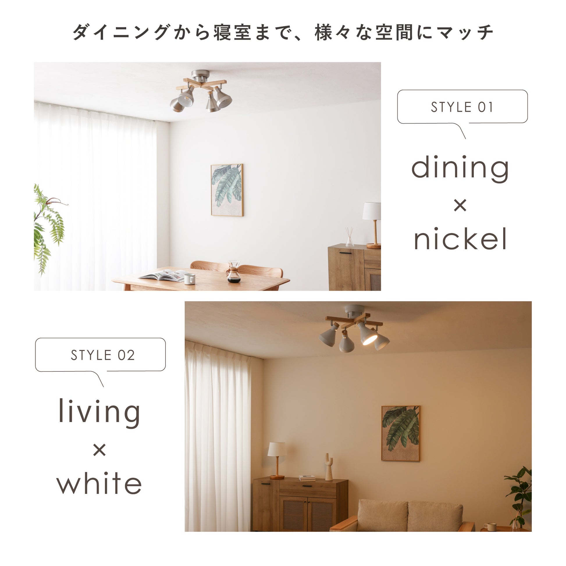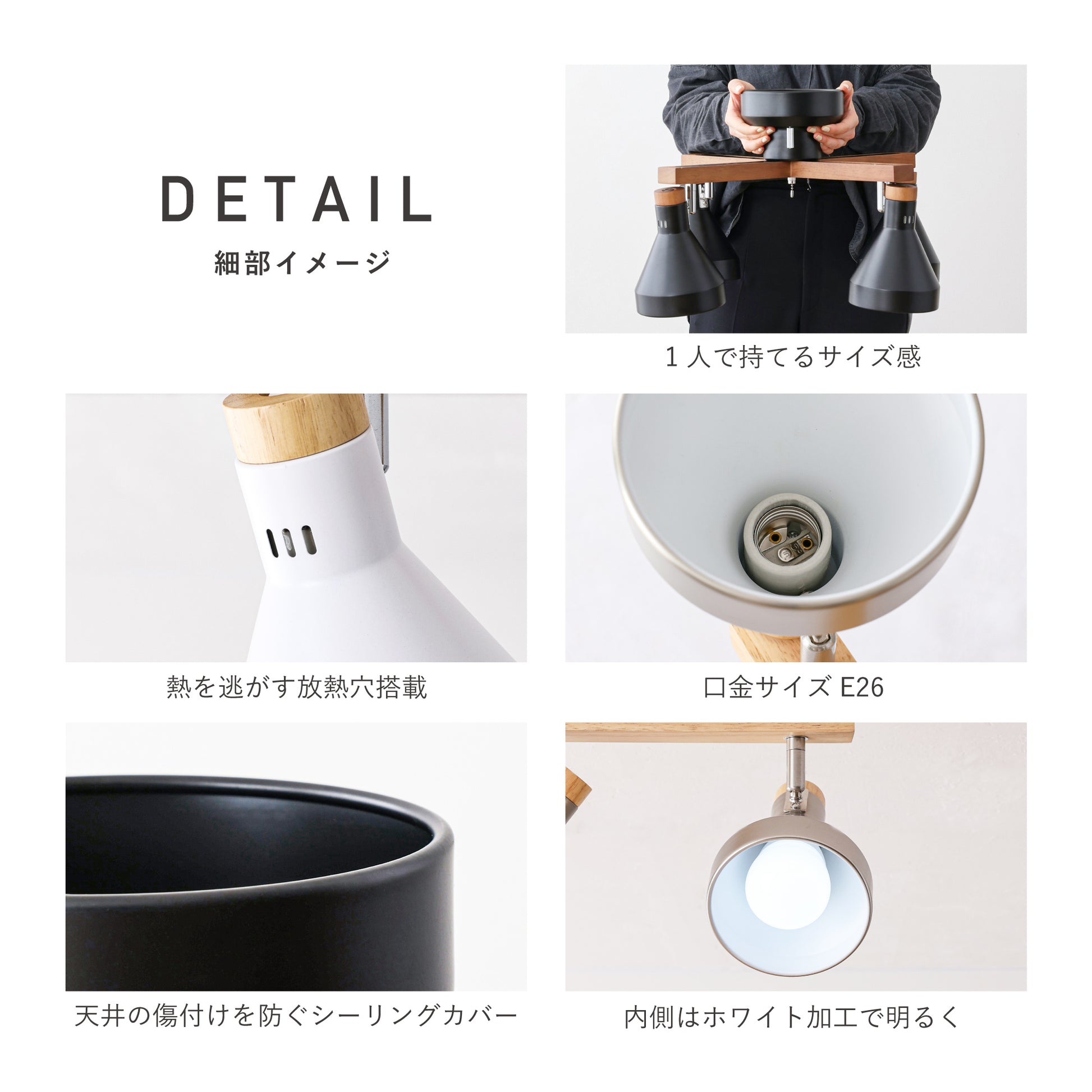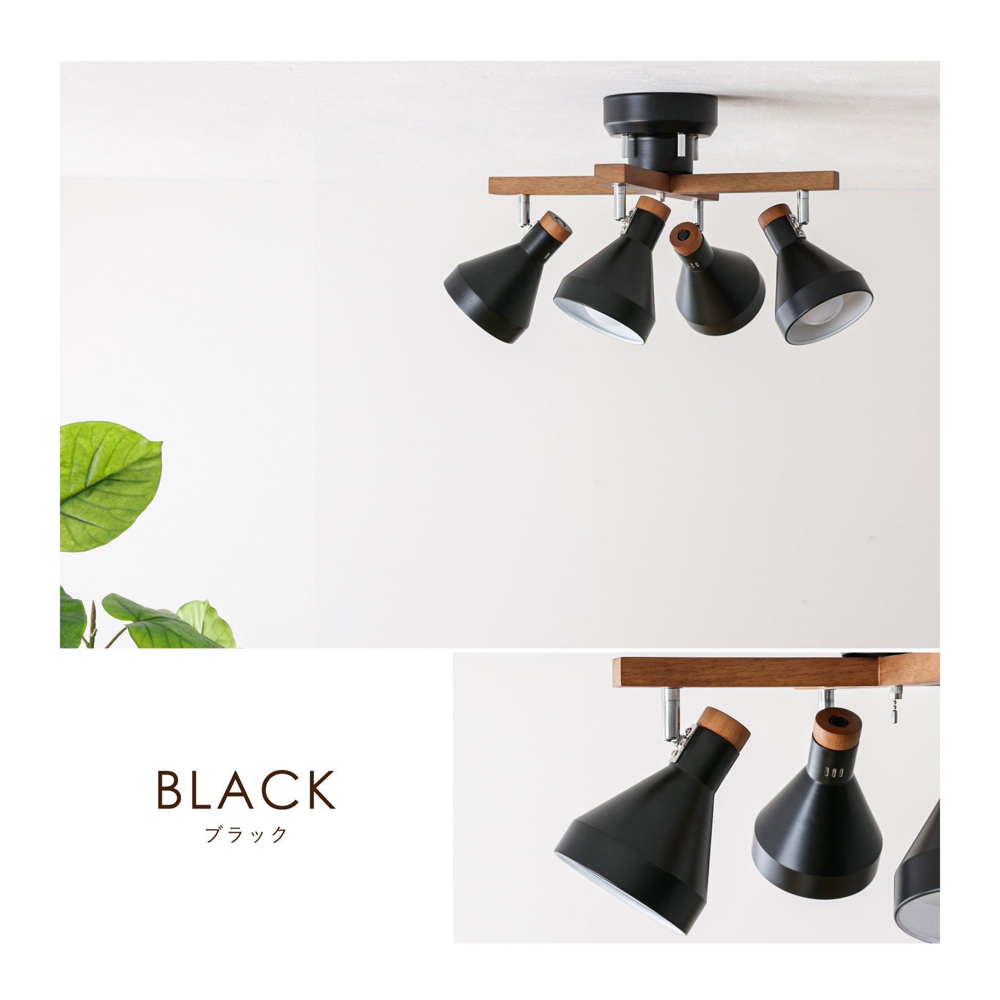 【スチール素材のスタイリッシュさ】×【木の優しさや温もりを感じる天然木】が組み合わさった洗練されたシンプルなデザインが、毎日の暮らしを引き立てる北欧風のシーリングスポットライト。スチール素材のシェードをベースに木の温もりと柔らかさがアクセントとなる天然木を使用したシンプルデザインで設置するだけでどんなお部屋にもマッチし、上質な空間に早変わりします。