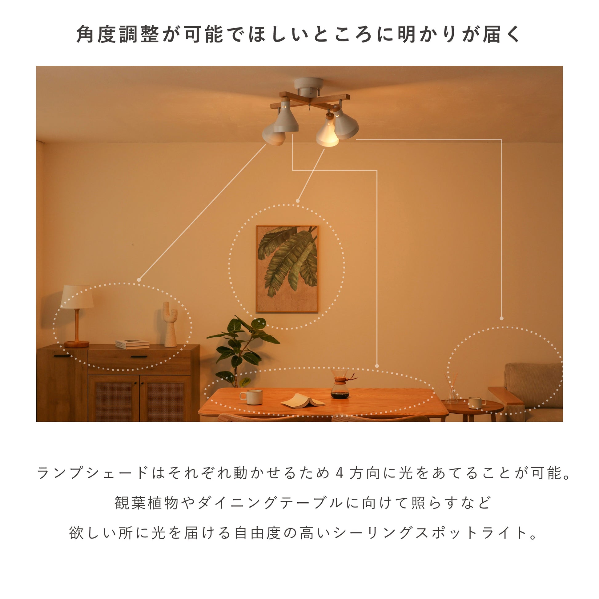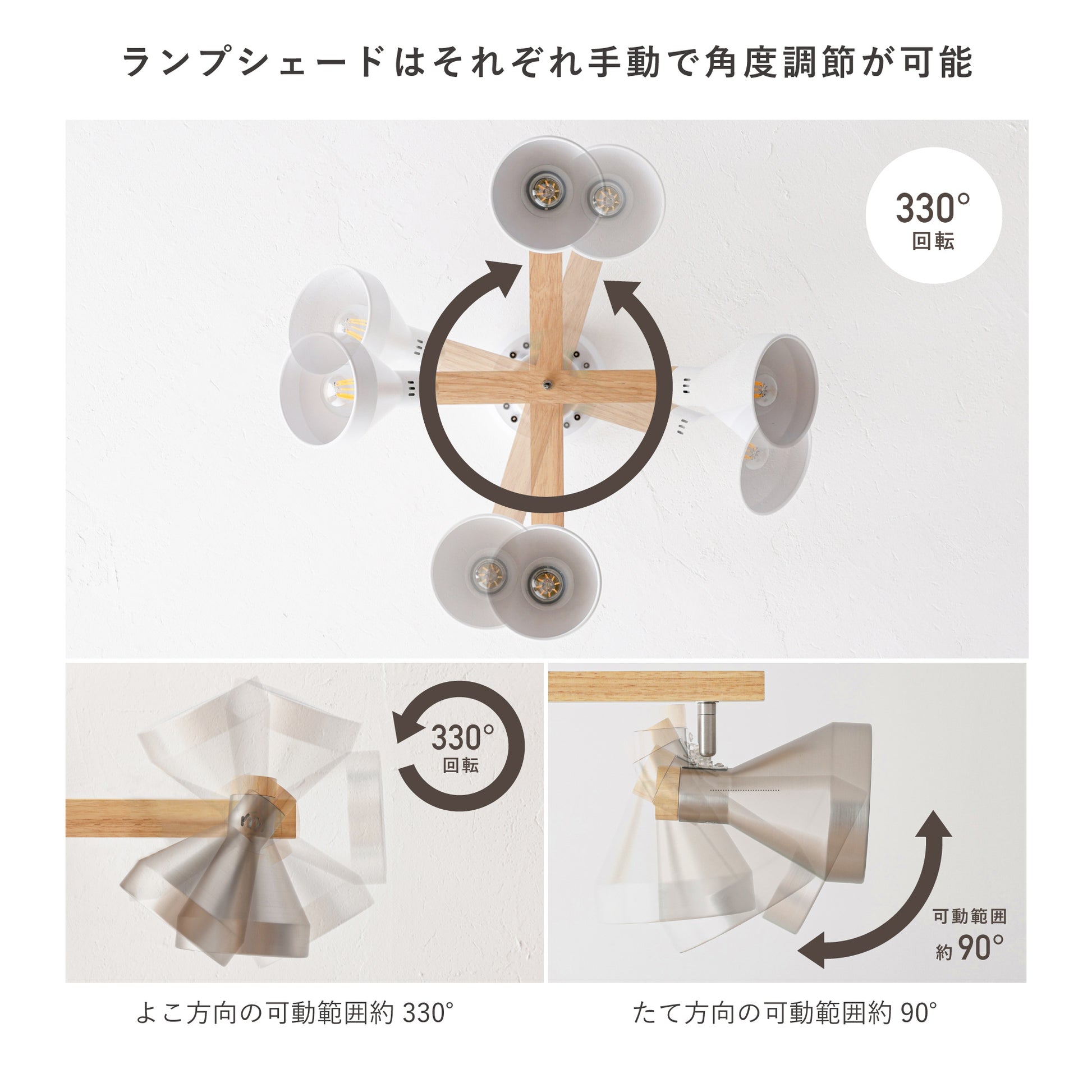 ランプシェードはそれぞれ動かせるため4方向に光をあてることができます。観葉植物やダイニングテーブルに向けて照らすなど欲しい所に光を届ける自由度の高いシーリングスポットライトです。天井に取り付けた後も本体の向きを変えることができ、その日の気分に合わせて調整ができます。ランプシェードは、それぞれ手動でくるくると約330度回転できます。首部分も床に対して垂直から約90度まで傾けられるので、ほぼお望み通りの角度に合わせることができます。角度を変えることによって、ランプから出る光と影が天井や壁面に映し出されておしゃれな雰囲気が醸し出されます。
