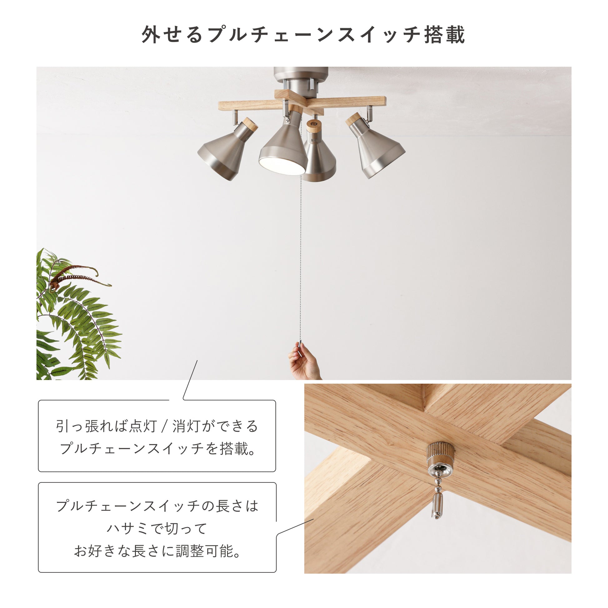 引っ張れば点灯/消灯ができるプルチェーンスイッチを搭載。リモコンが手元にない場合や電池切れの場合でもプルチェーンスイッチを使用すればすぐに操作が可能です。プルチェーンスイッチの長さはハサミで切ってお好きな長さにすることができ、使わない時は外しておくことも可能です。
