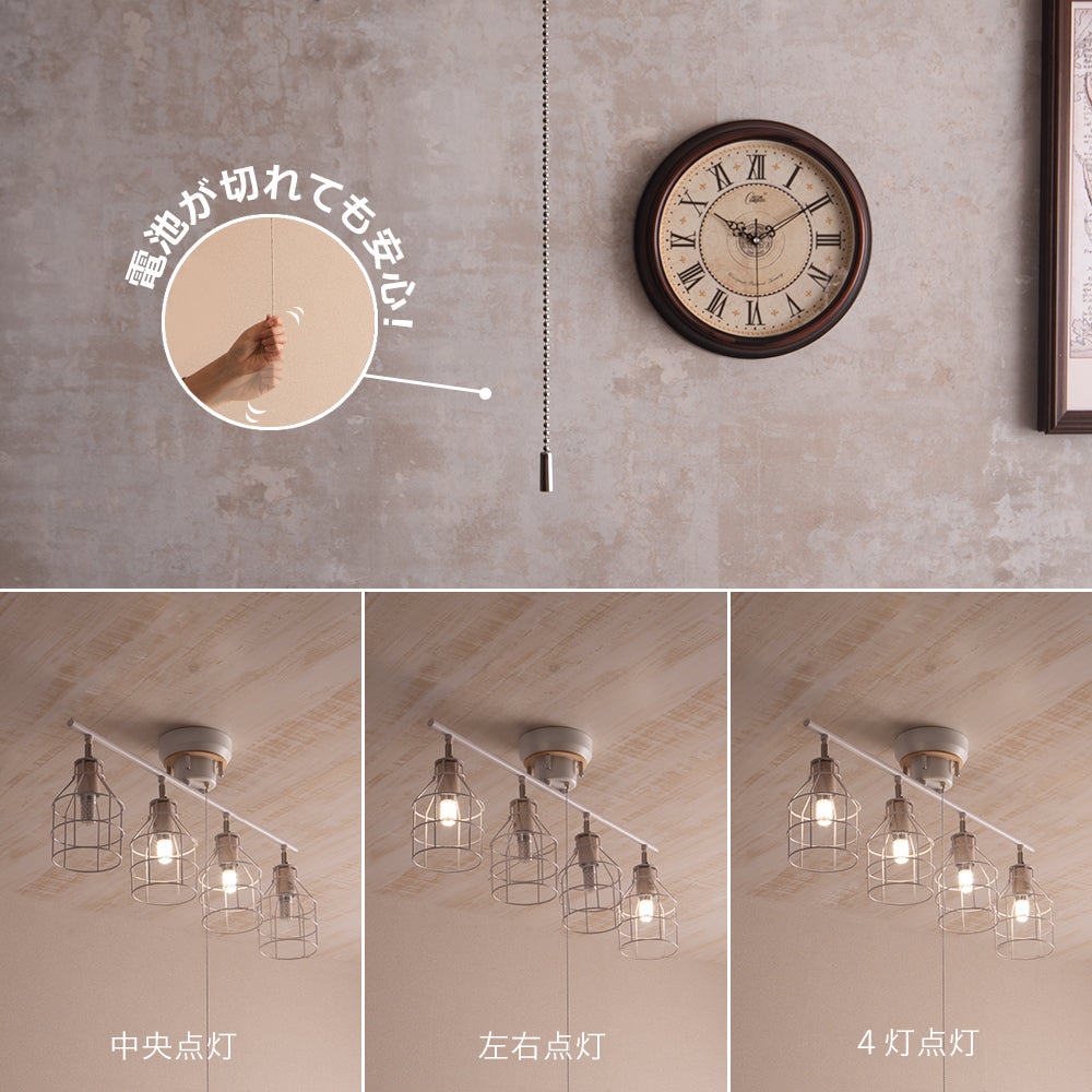 ・オプションの調光調色LED電球は電源スイッチのON/OFFを繰り返すと光の色や明るさが切り替わります。これはリモコンを使用しない時でも調光・調色ができる機能ですが、オプションの調光調色電球はプルチェーンスイッチでON/OFFすると違う位置の電球の通電回数が異なってしまい、光色や明るさが変わり揃わなくなりますので、オプションの調光調色LED電球はなるべくプルチェーンスイッチで操作しないことをお勧めします。