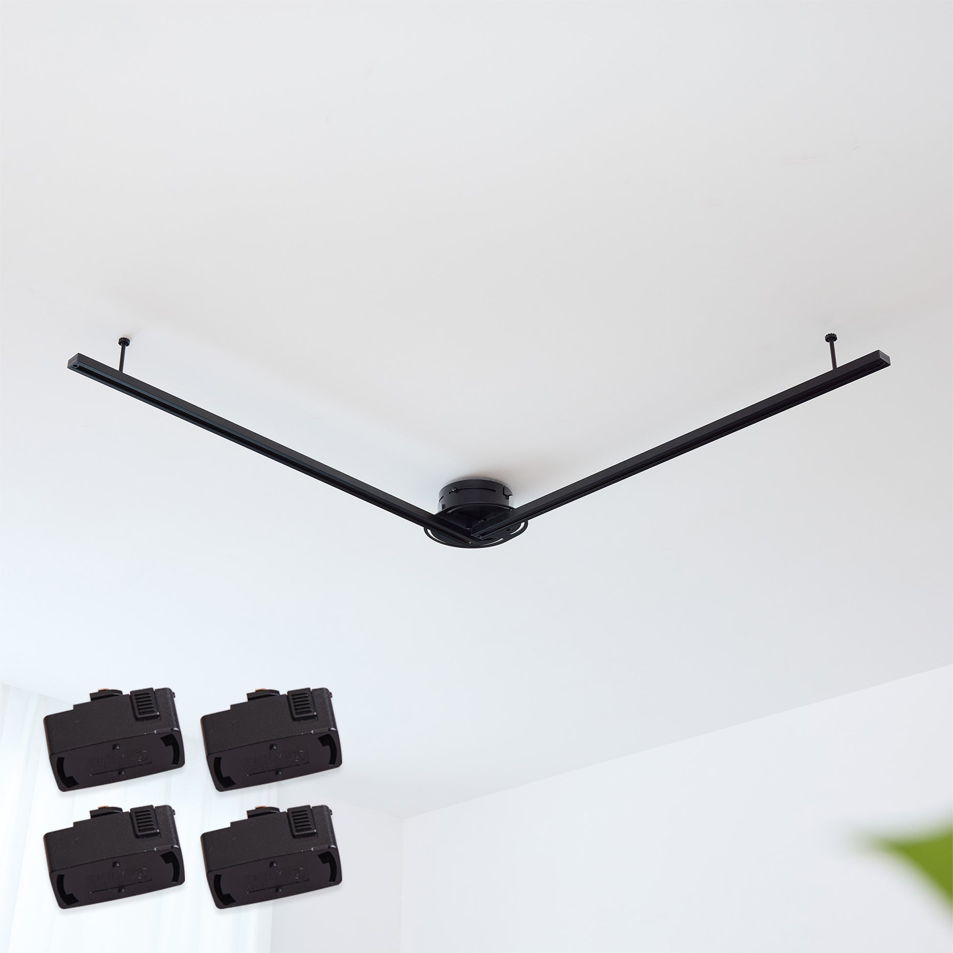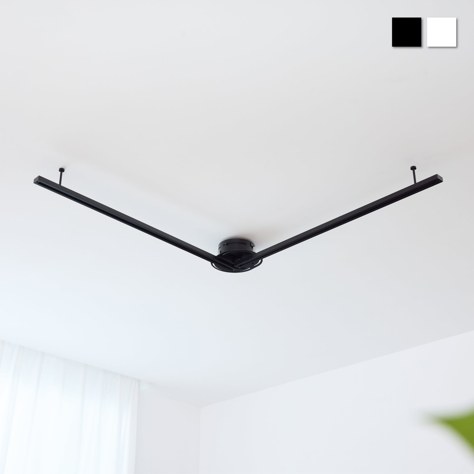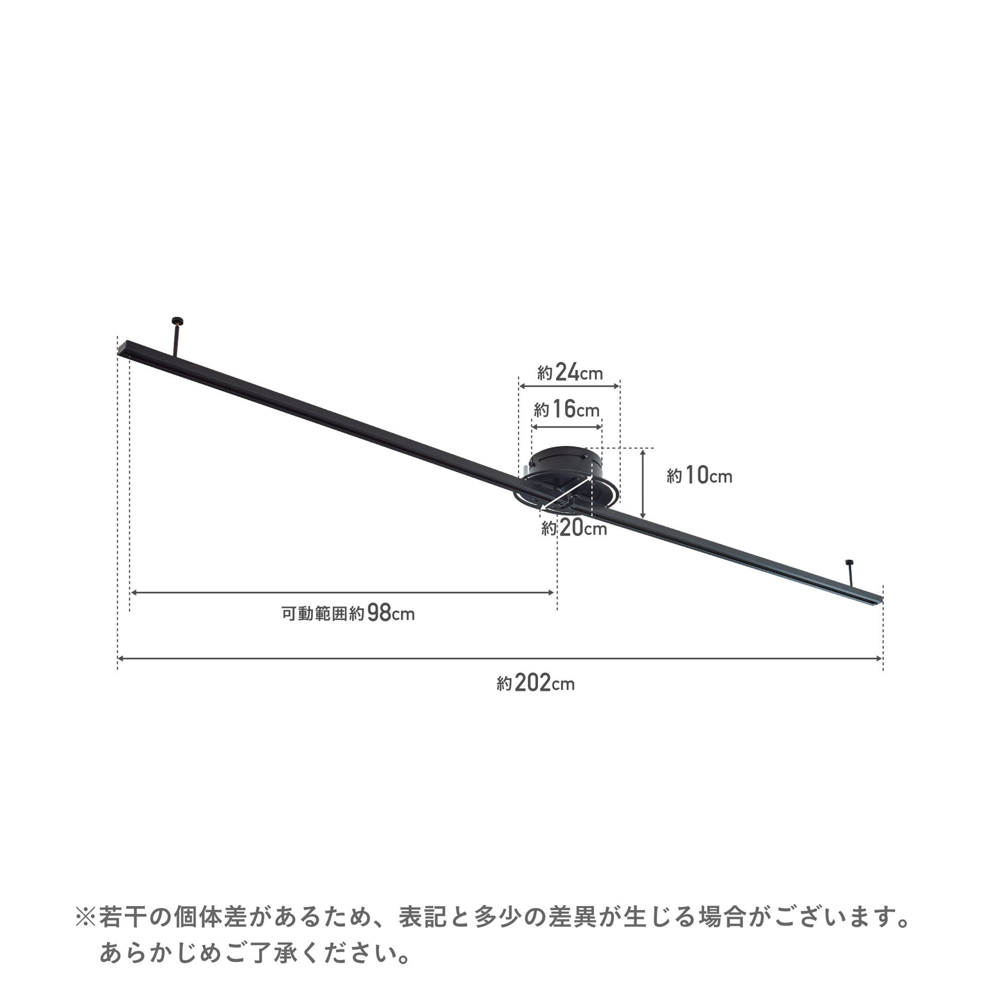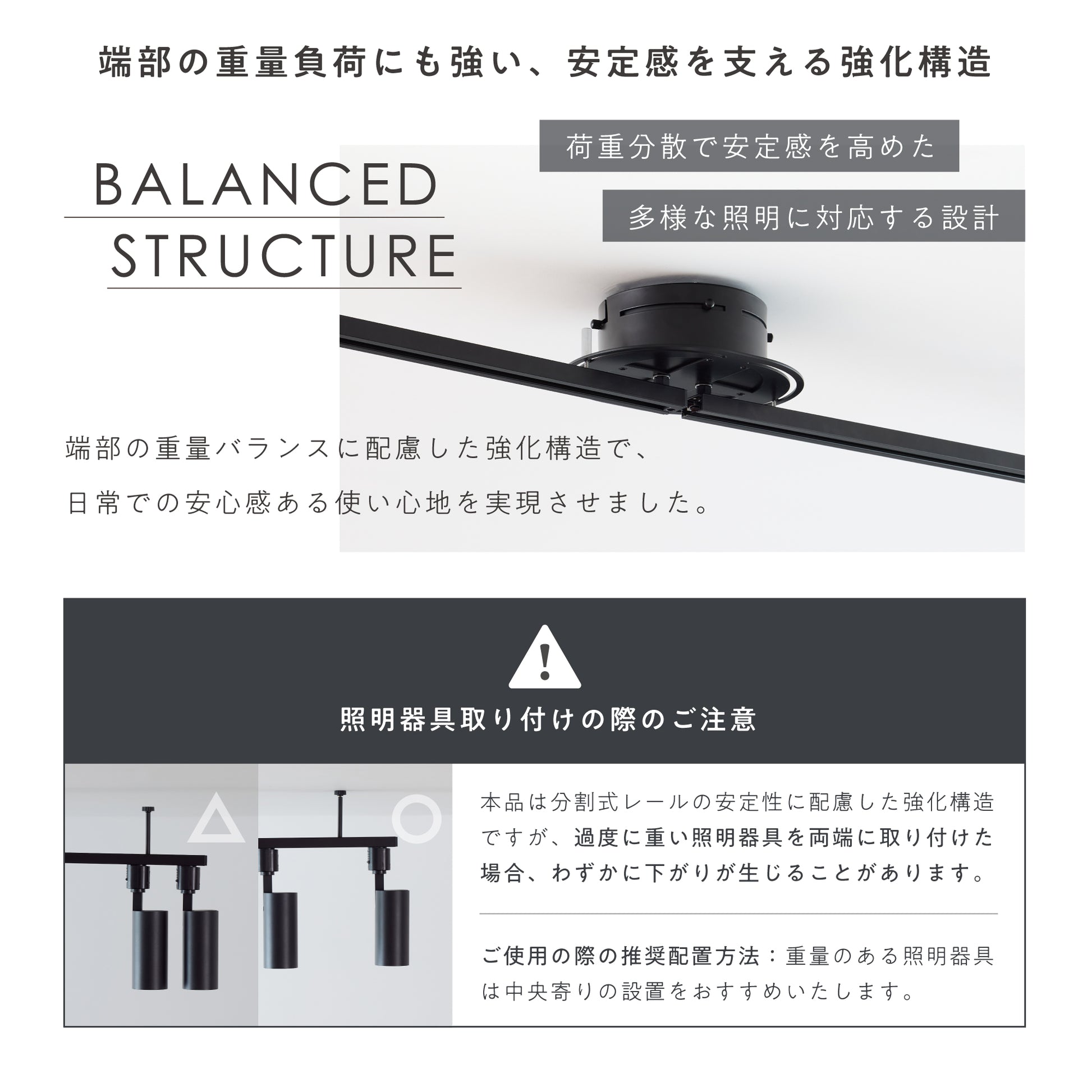 本製品は分割式レールの安定性に配慮した構造を採用していますが、重量のある照明器具を両端に集中して設置した場合、わずかな下がりが生じることがあります。