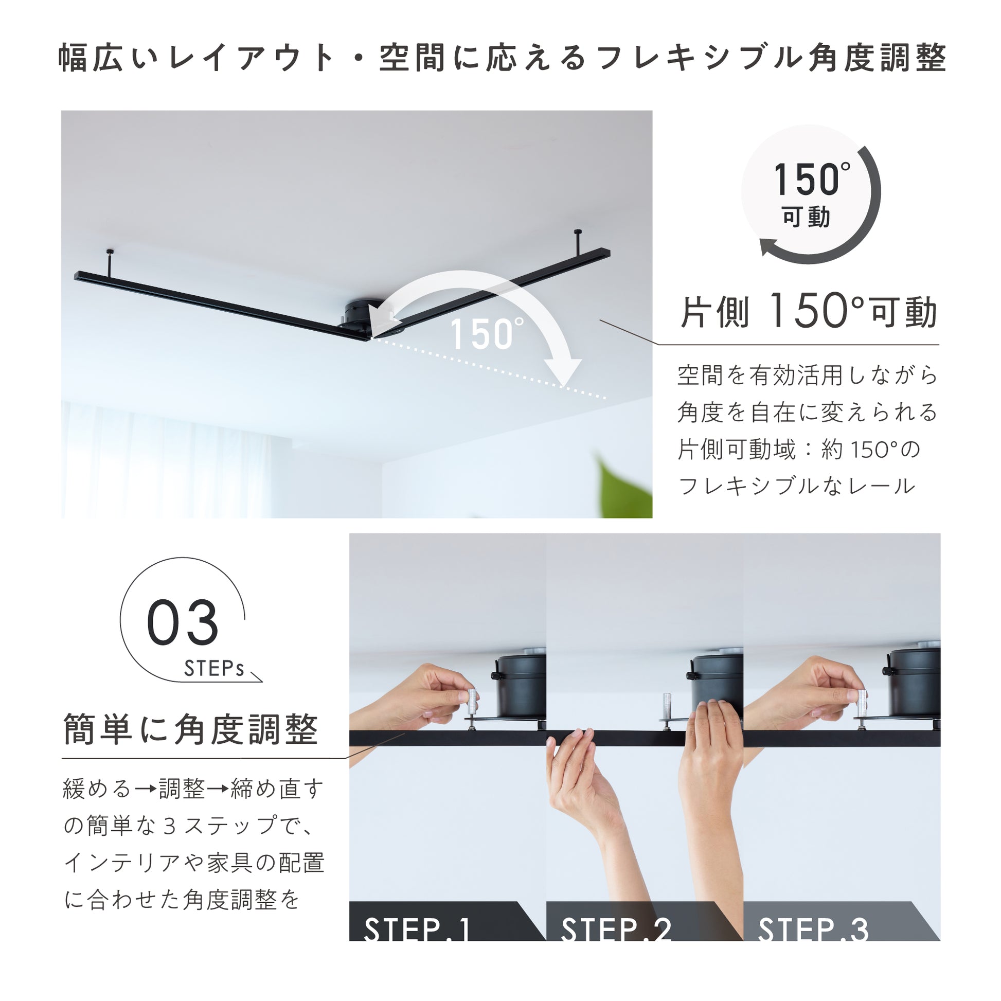 片側約150°の角度調整に対応し、設置後もレールの向きを変えられる設計です。家具の配置替えや模様替えに合わせて光の方向を整えやすく、天井から取り外す手間もありません。空間の使い方が変わっても柔軟に対応でき、日常の照明環境を快適に保ちます。