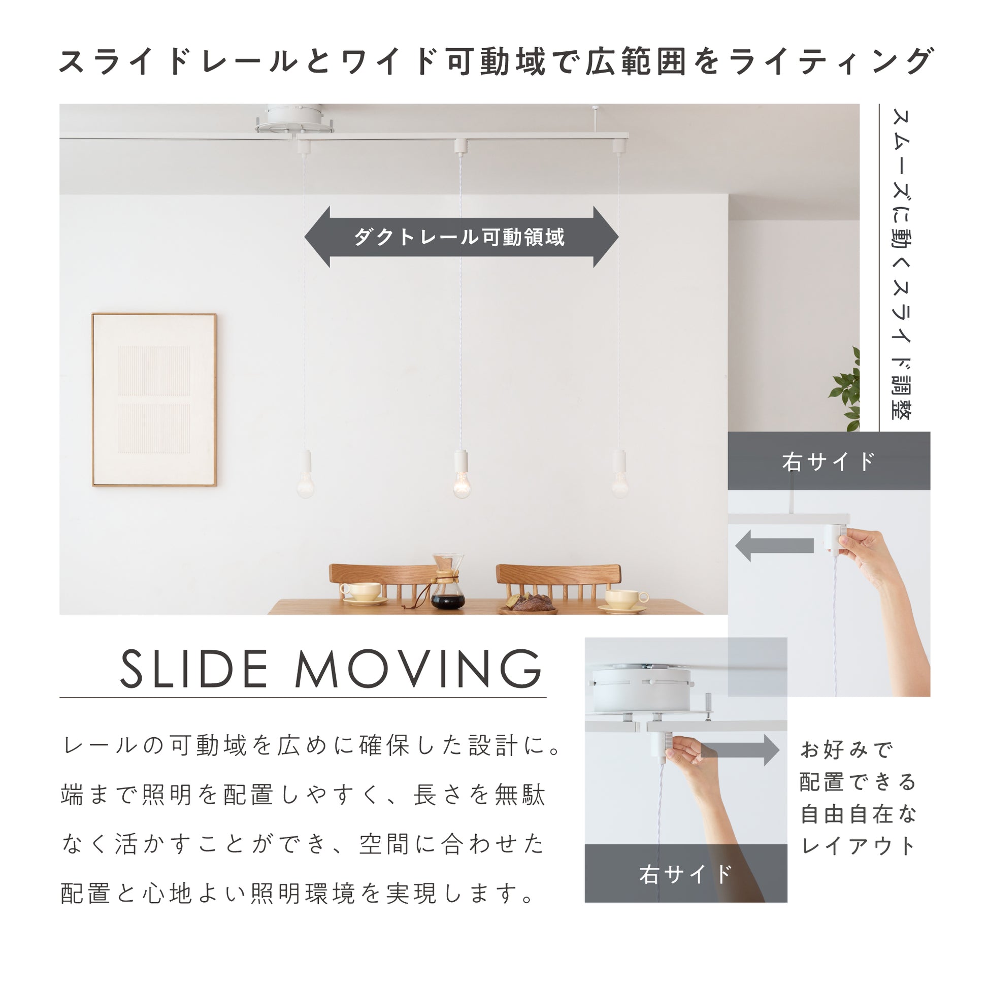 レールの可動域を広く確保することで、端まで照明器具を配置しやすい設計です。長さを無駄なく使えるため、ダイニングテーブル全体やカウンター上にもバランスよく光を届けられます。照明レイアウトの自由度を高め、空間に合わせた配置を整えやすくします。