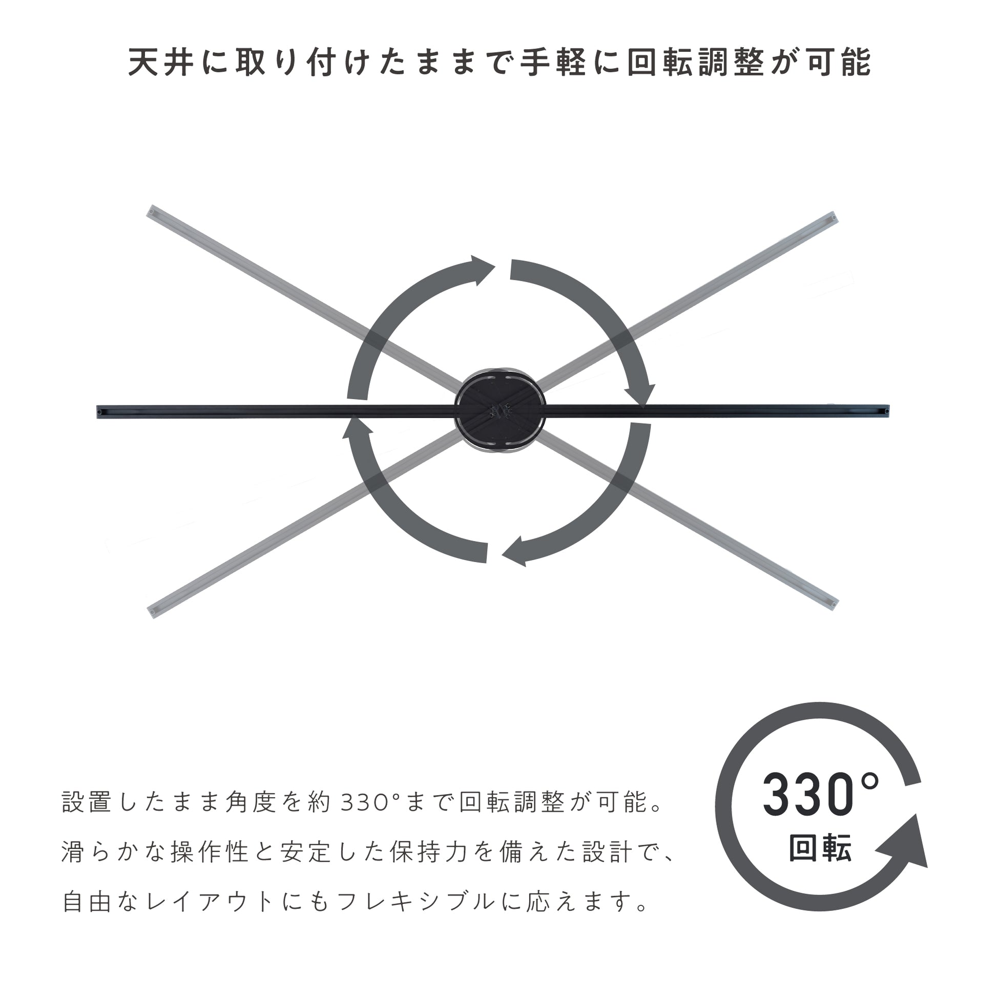 天井に設置した状態で約330°まで回転調整可能