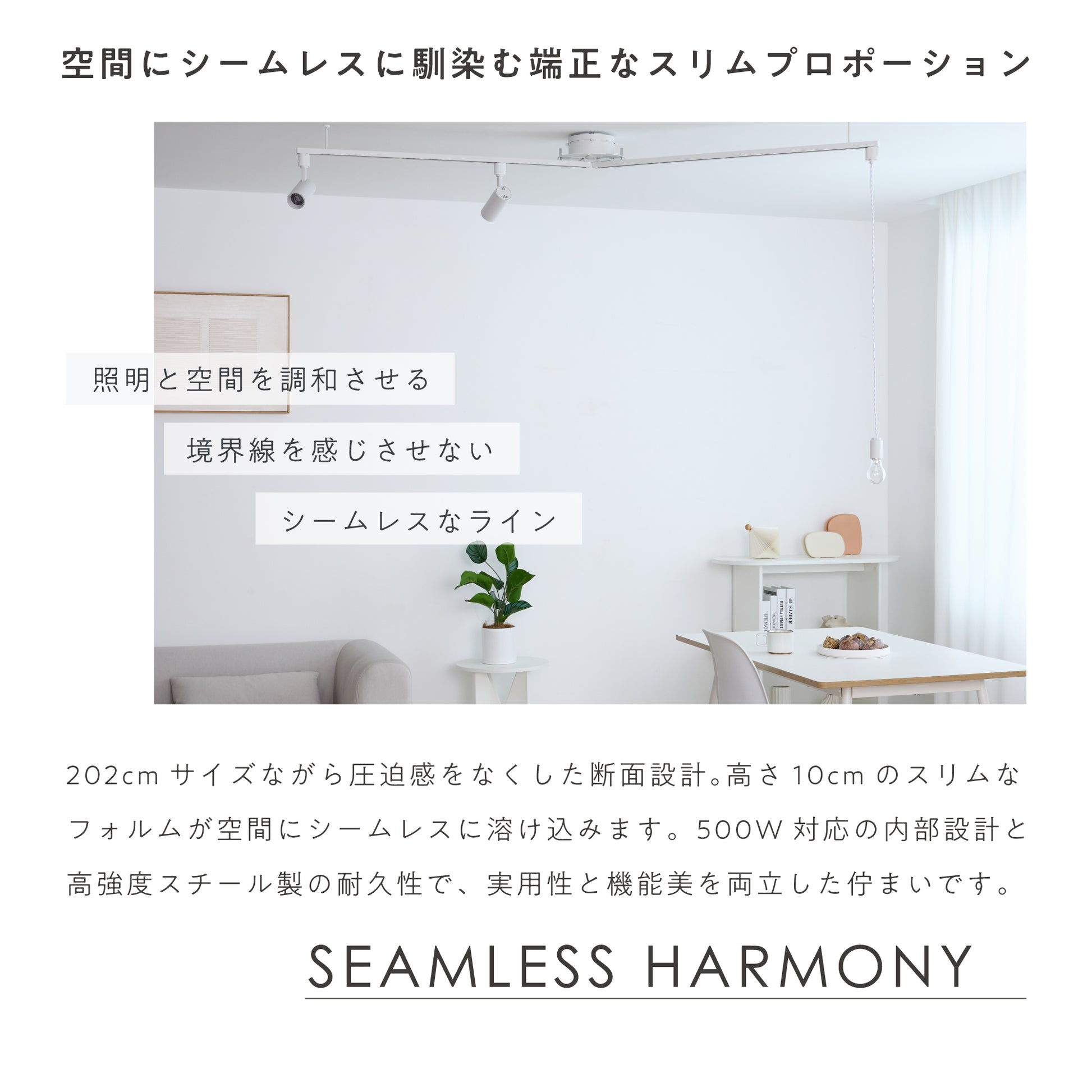 202cmのサイズながら圧迫感を抑える断面設計を採用。高さ10cmの薄型フォルムが天井空間に自然に馴染みます。内部構造を最適化し、配線効率や放熱性を保ちながら500W容量を確保。高強度スチールによる堅牢性も備え、機能美と空間調和を両立しました。