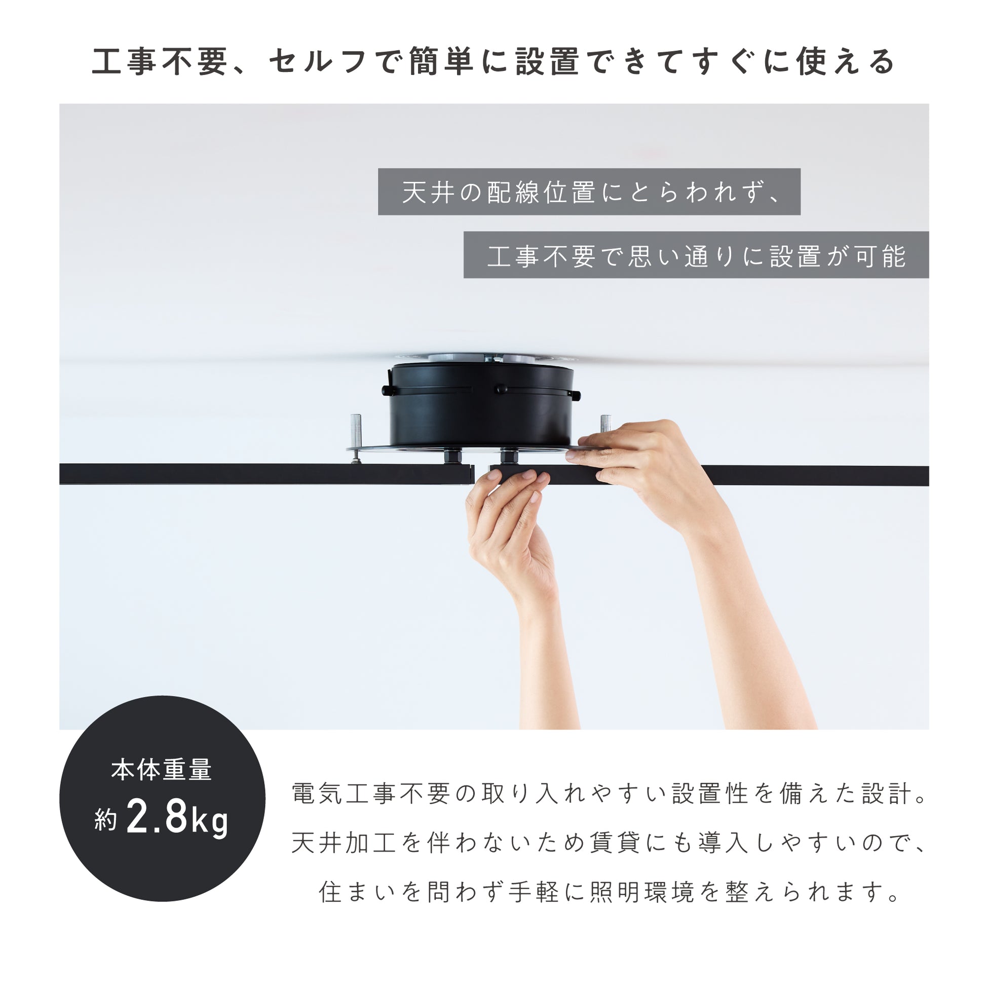 既存の引掛シーリングに取り付けるだけで設置できる工事不要設計。天井加工を伴わないため賃貸住宅でも導入しやすく、取り外しも簡単です。説明書に沿って進めれば短時間で設置でき、確実に固定できるロック機構により安全性にも配慮。住まいを選ばず手軽に照明環境を整えられます。