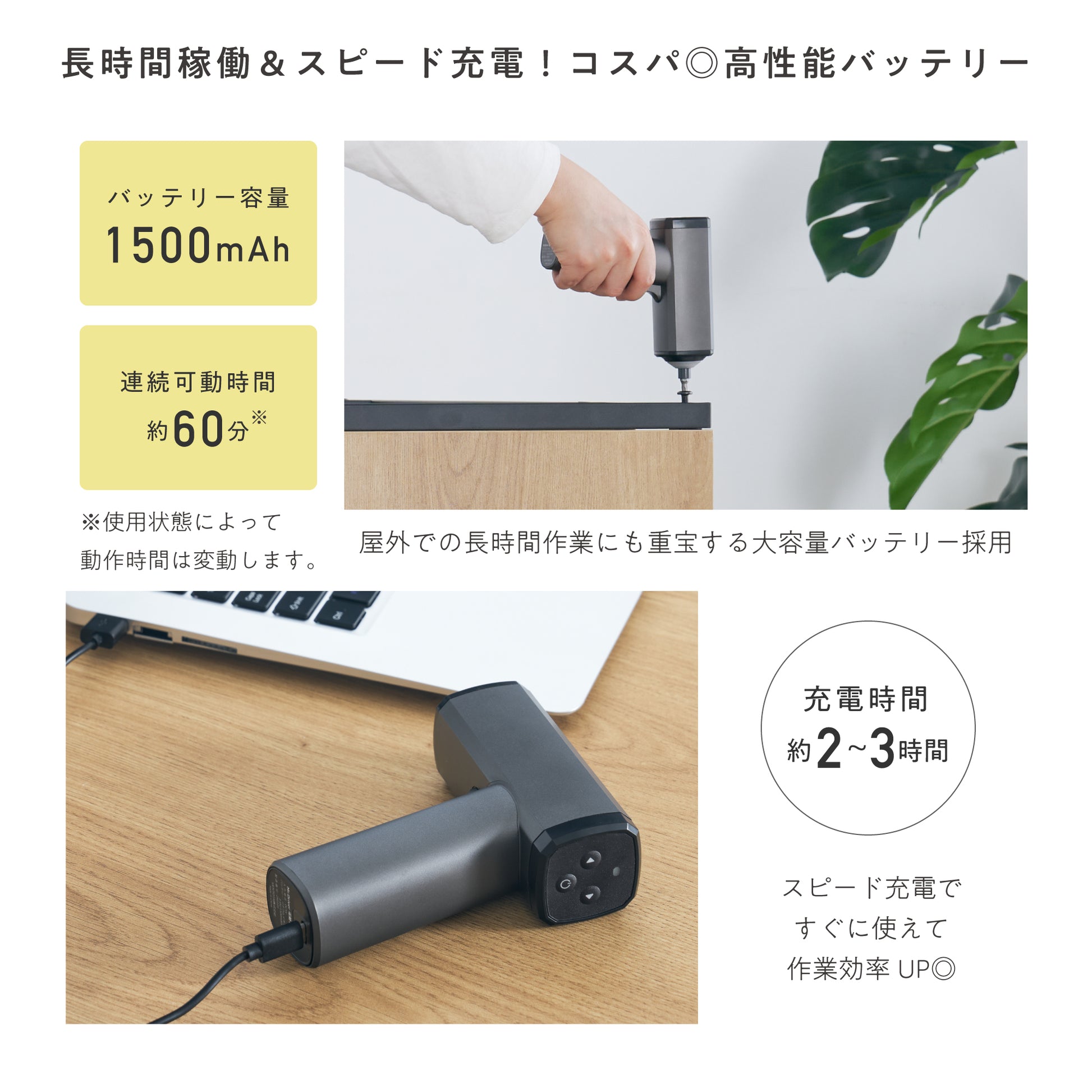 USBケーブルでの充電が可能で、約2.5時間のスピード充電を実現。充電の利便性を高めることで、作業の中断を最小限に抑え、効率的に作業を進められます。内蔵バッテリーは高性能リチウムイオン電池搭載。連続最大約60分間使用可能で、長時間の作業にも対応できるコストパフォーマンスに優れた高性能バッテリーです。※使用状態によって動作時間は変動します。