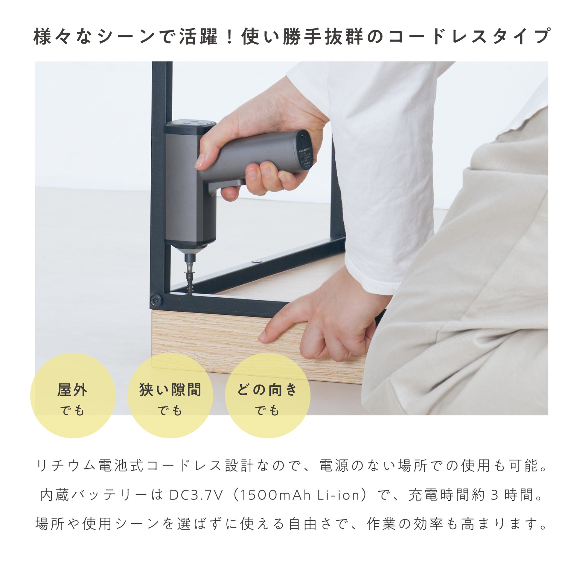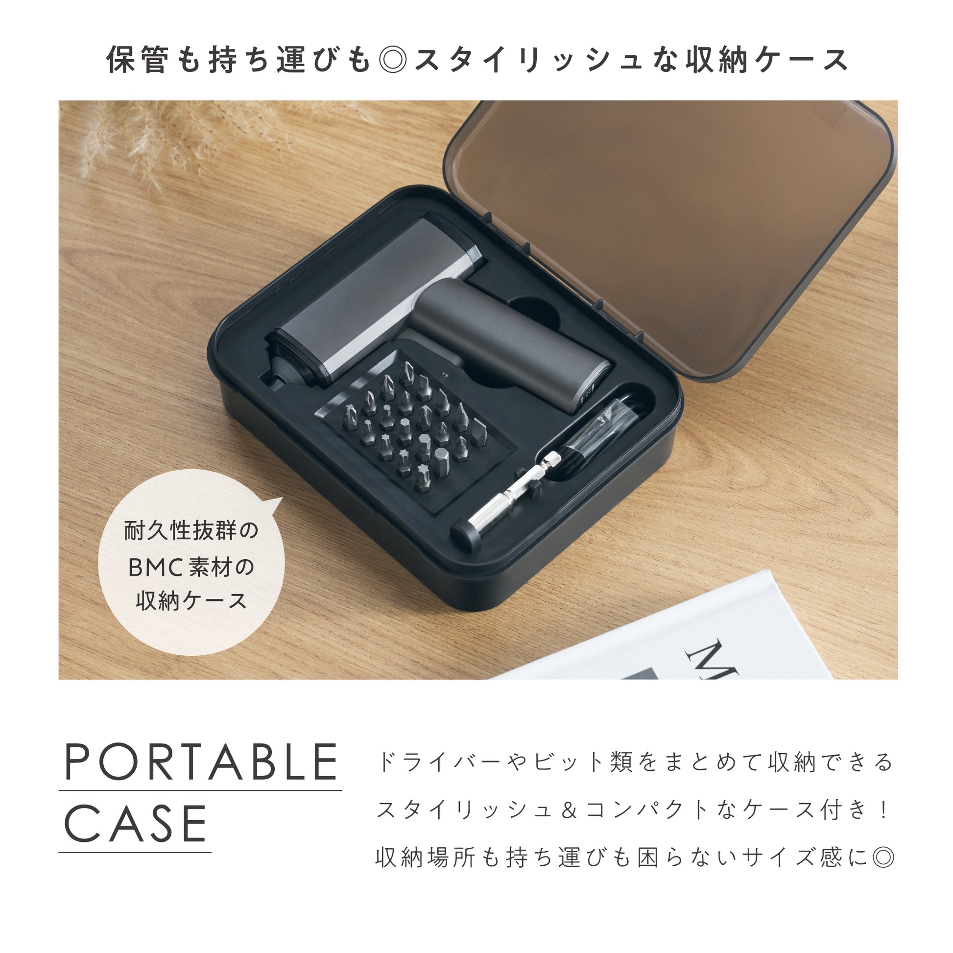 スタイリッシュな収納ケース付きで、ドライバー本体やビットを整理整頓できます。ケースはBMC素材を使用し、耐久性とデザイン性を両立しました。持ち運びにも便利で、作業現場への移動もスムーズです。収納ケースは、作業後の片付けも簡単にし、次回の作業をスムーズに始められるようサポートします。