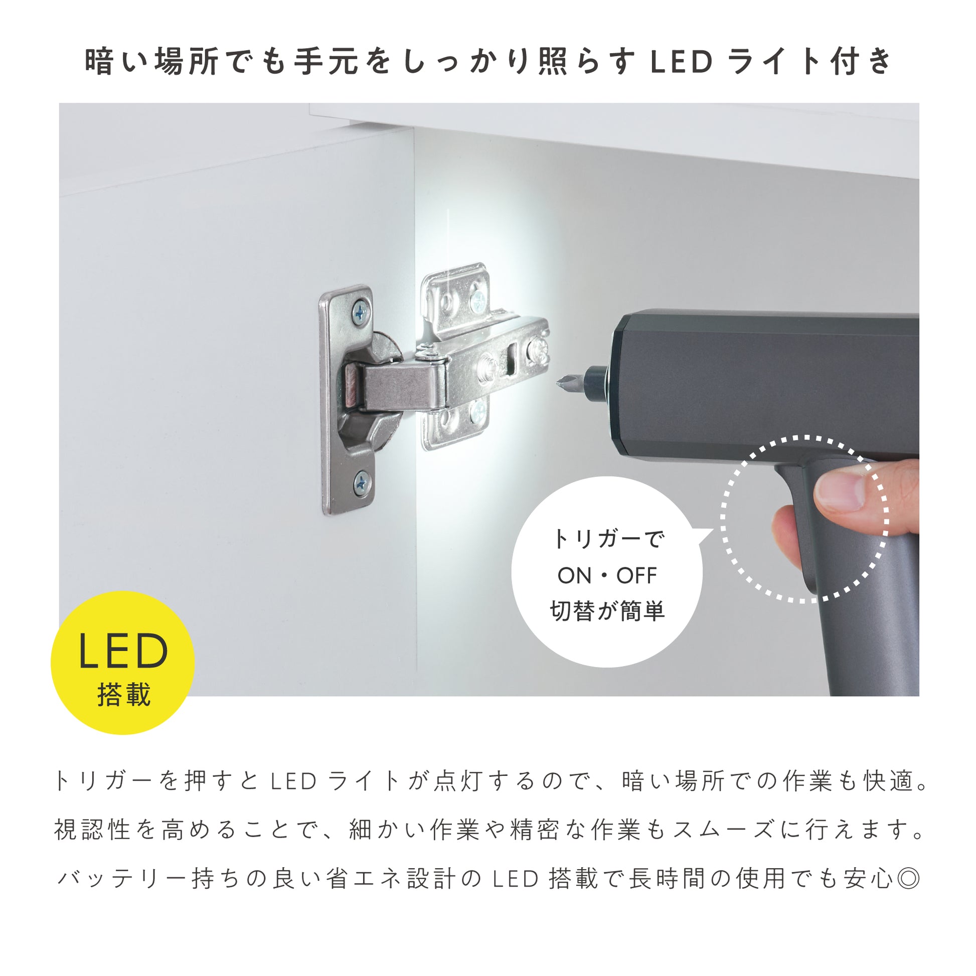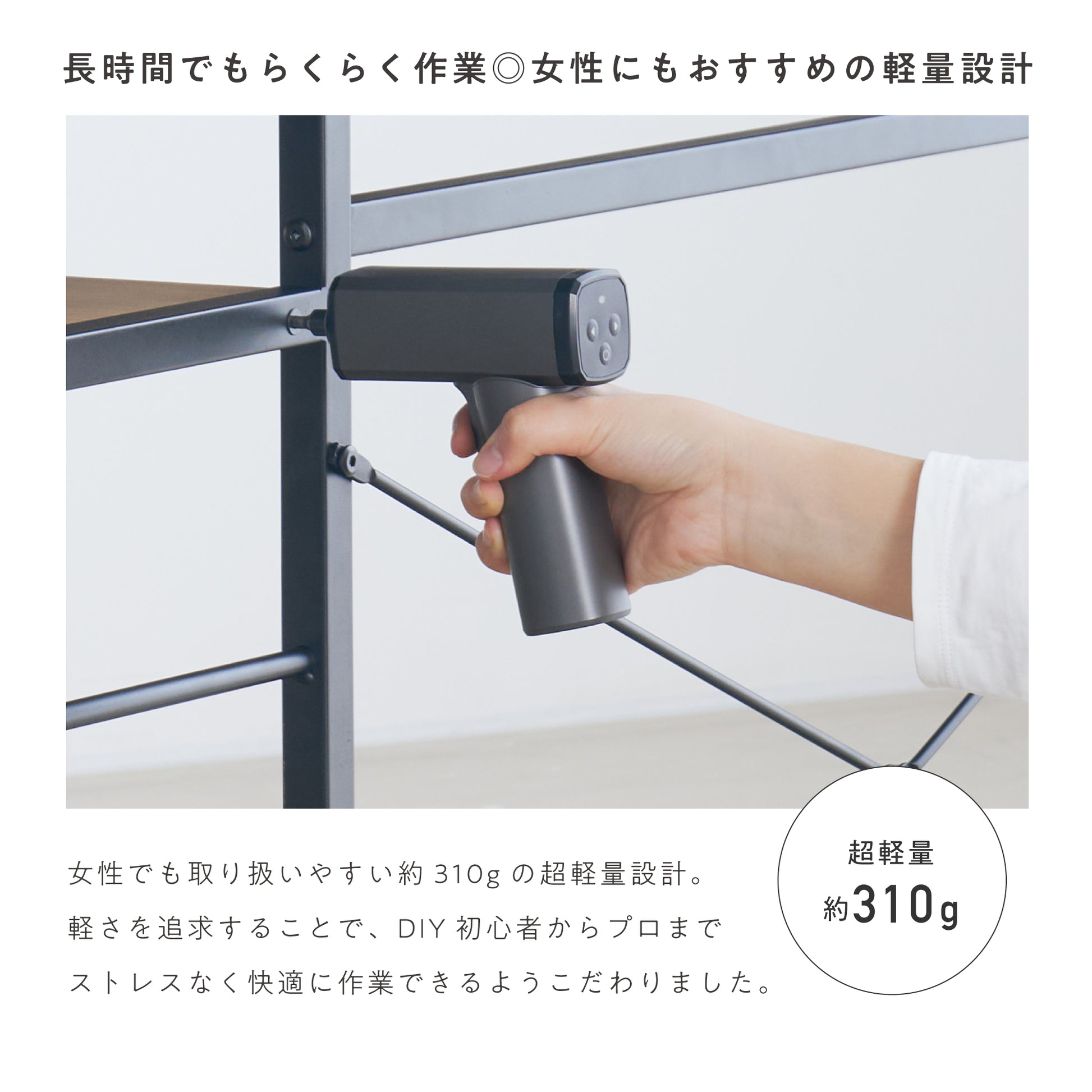 電動ドライバーは、約310gという軽量設計にこだわりました。長時間の作業でも手首や腕に負担がかかりにくく、快適に使用できます。軽さを追求することで、DIY初心者からプロフェッショナルまで、誰でも扱いやすくしました。軽量でありながら、しっかりとしたパワーを持ち、様々な作業に対応できるのが魅力です。手に馴染むデザインで、作業中のストレスを軽減し、効率的に作業を進めることができます。
