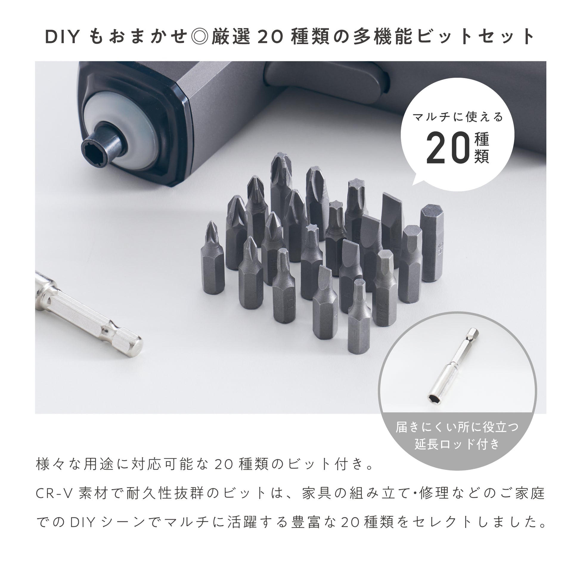 20種類のビットが付属しており、様々な用途に対応可能です。ビットはCR-V素材を使用し、耐久性と精度を兼ね備えています。多機能ビットセットは、家具の組み立てや修理、日曜大工など、あらゆるDIYシーンで活躍します。ビットの交換も簡単で、作業の流れを止めることなくスムーズに進められます。