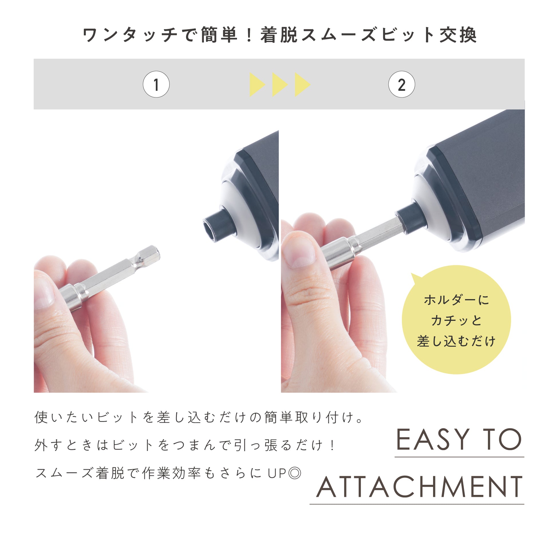 ビット交換の際はビットホルダーに使用したいビットを差し込むだけで完了。装着中はしっかりと固定されますが、外すときはビットをつまんで引っ張るだけで簡単に外せるので安心です。
