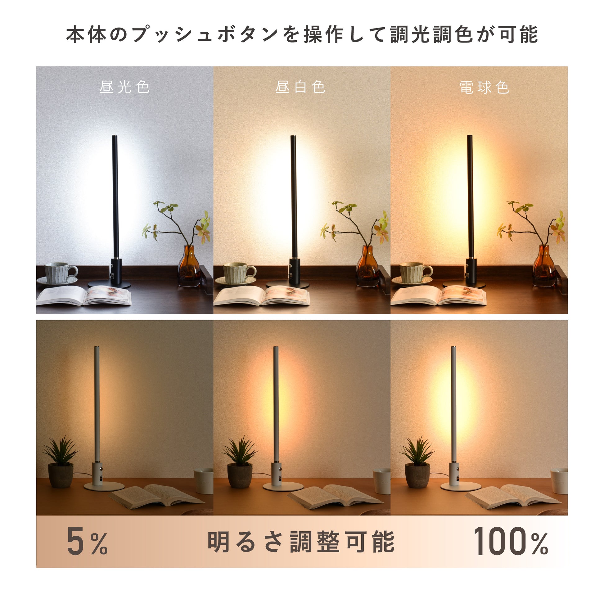 プッシュボタンを1回押すごとに、【昼光色→電球色→昼白色→消灯】を繰り返して調色切替ができます。調光機能を使用して勉強や仕事、読書時は明るめに設定し、就寝前のベッドでくつろぎたいときなど暗めに設定することで明るさを自由に細かく調節できます。調色機能では、様々なシチュエーションに合わせて電球の色を変えてお使いいただけます。昼光色は文字が読みやすく、昼白色は自然な雰囲気となり、電球色は温かみを感じられます。光や白い光の寒色系の光から赤みがかった光のような暖色系の光に調整することも出来ます。