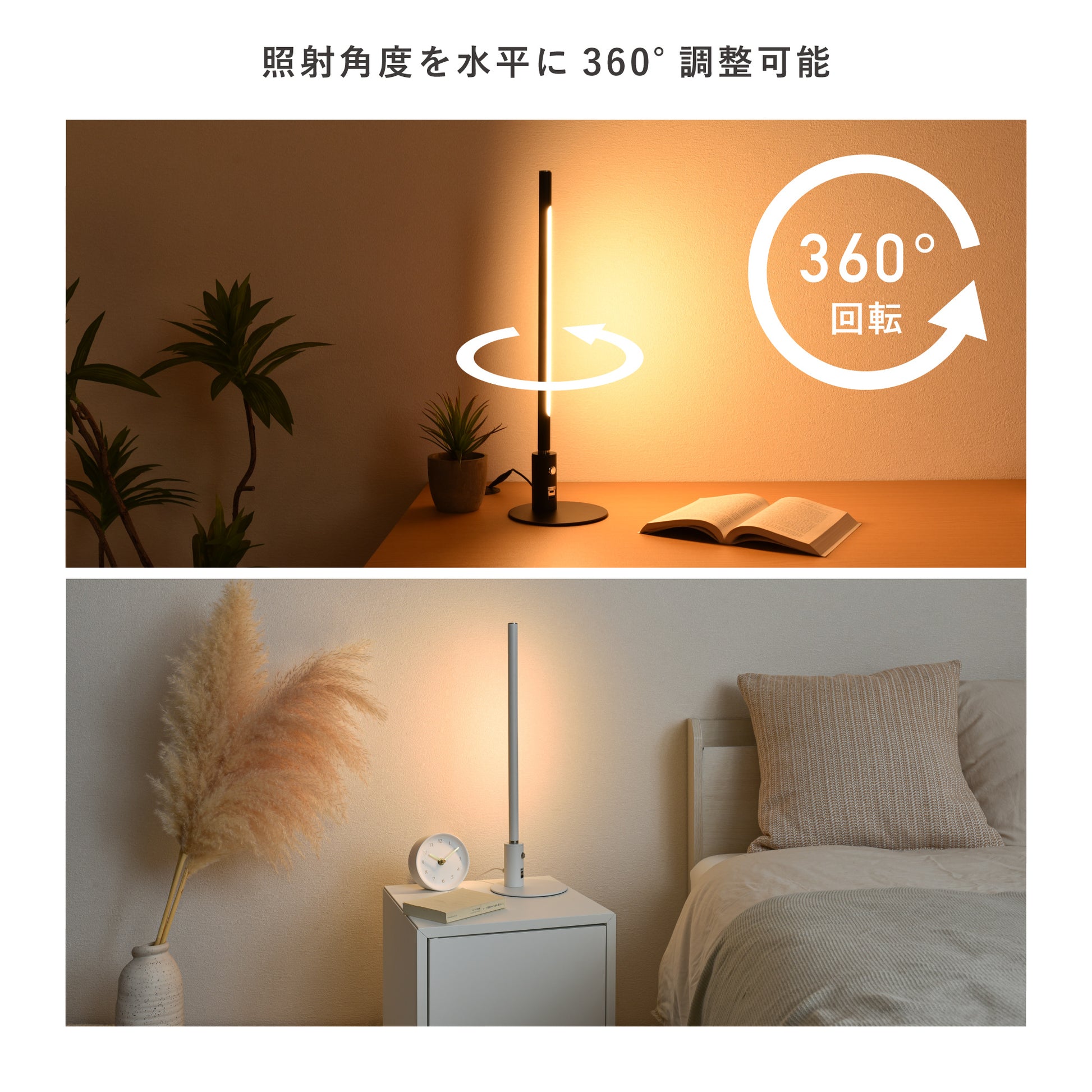 LED照明部の『LEDスティック』は水平に360°回転可能。土台を固定させたまま光を好きな向きに角度調整ができます。天井照明では影になりやすい手元の明るさが欲しいときに役立ちます。