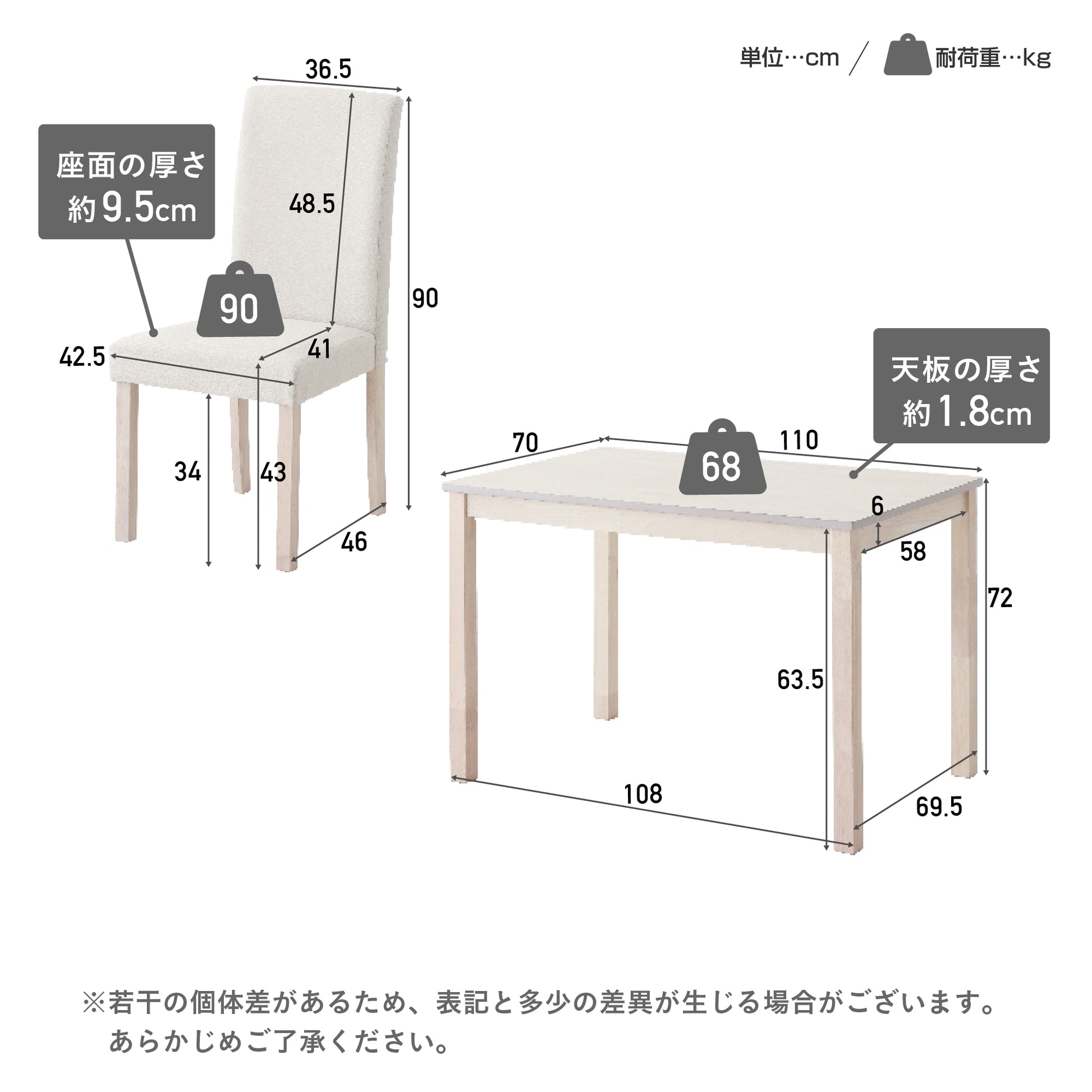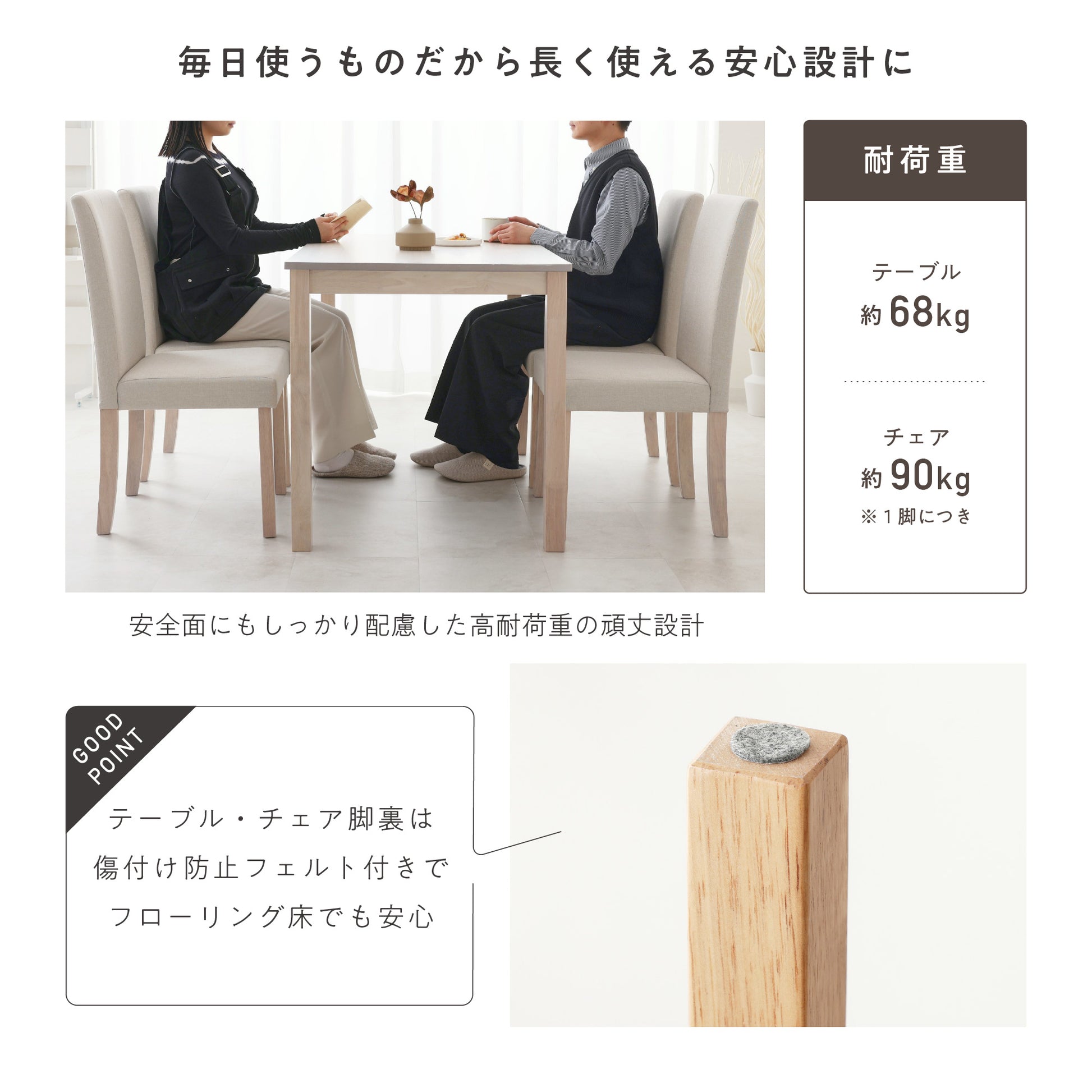 テーブルの耐荷重は約68kg、チェアは約90kgと高耐荷重設計で、安全面にも配慮しました。フローリングを傷つけないよう、脚裏には傷付け防止フェルトを付けており、安心して使用できます。デザイン性と機能性を兼ね備えたこのダイニングセットは、長く愛用できる一品です。
