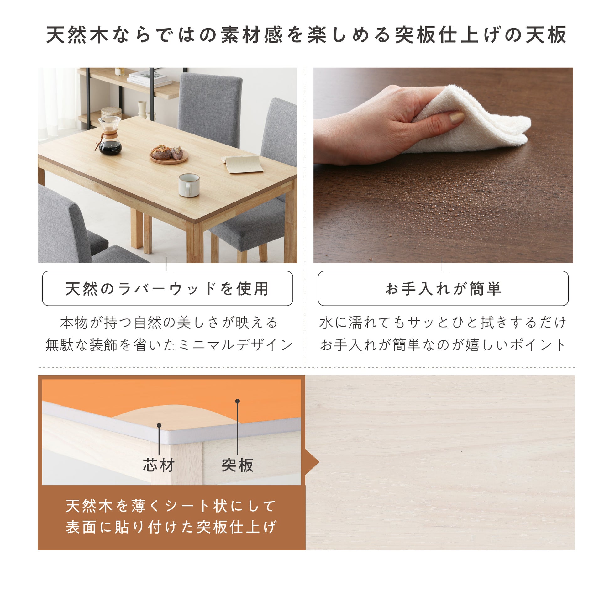 天然木のラバーウッドを贅沢に使用した天板は、1つ1つ異なる表情や色味の濃淡で木目の美しい質感を楽しめます。自然の持つ素材感をより引き立たせるべく、装飾を一切なくしたミニマルなデザインに。お手入れも簡単で、濡れてもサッと拭くだけで清潔に保てるので、忙しい日常でも安心してお使いいただけます。